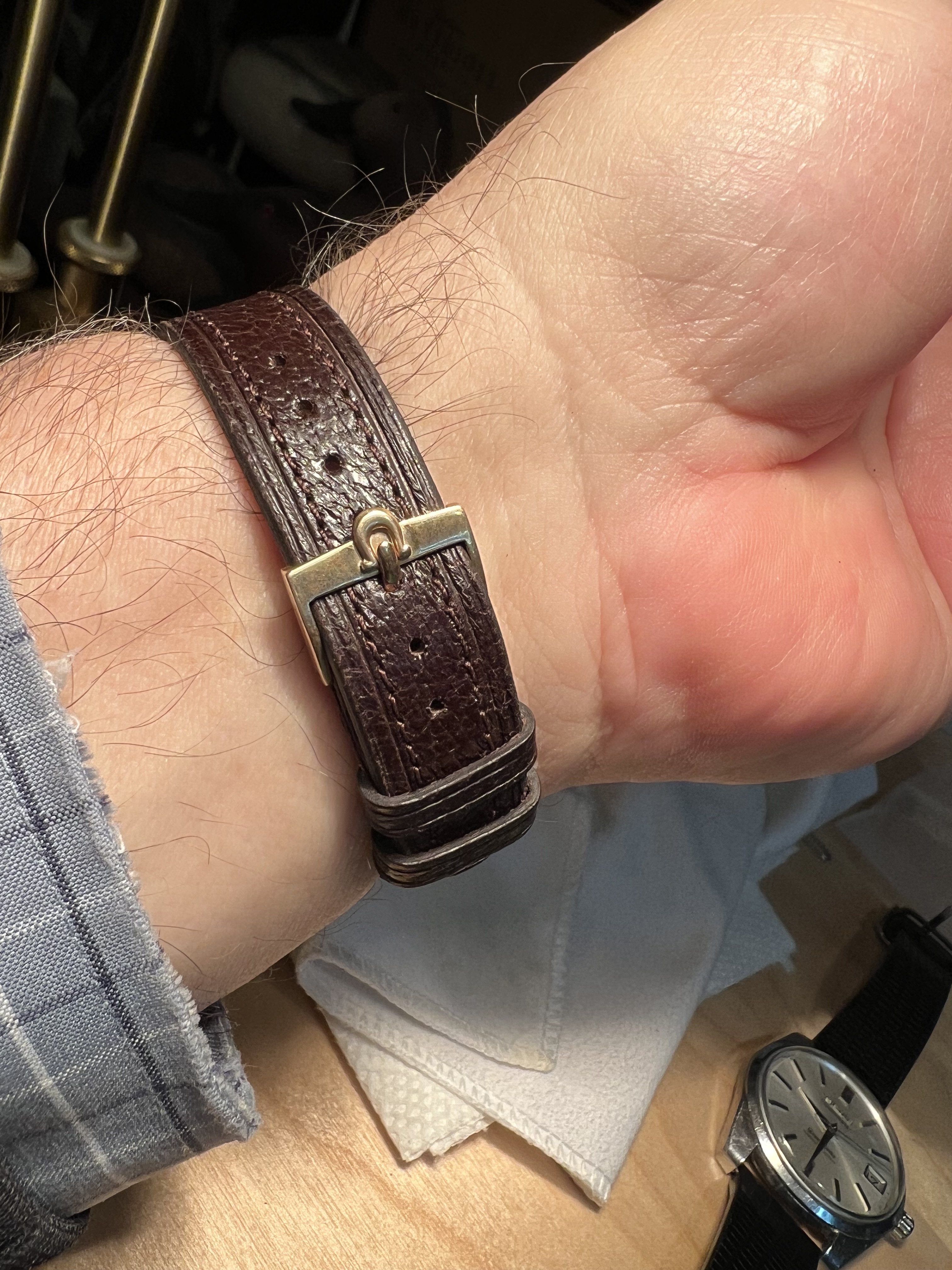 I was wondering if anyone can tell what the original strap looked like. I am thinking of going to a leather strap. The metal bracelet is missing one of the filler pieces that rest near the face, and the other one I have is pretty dented up.