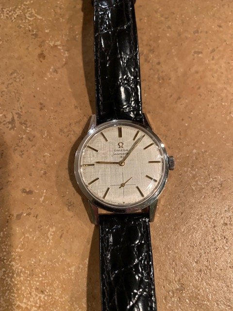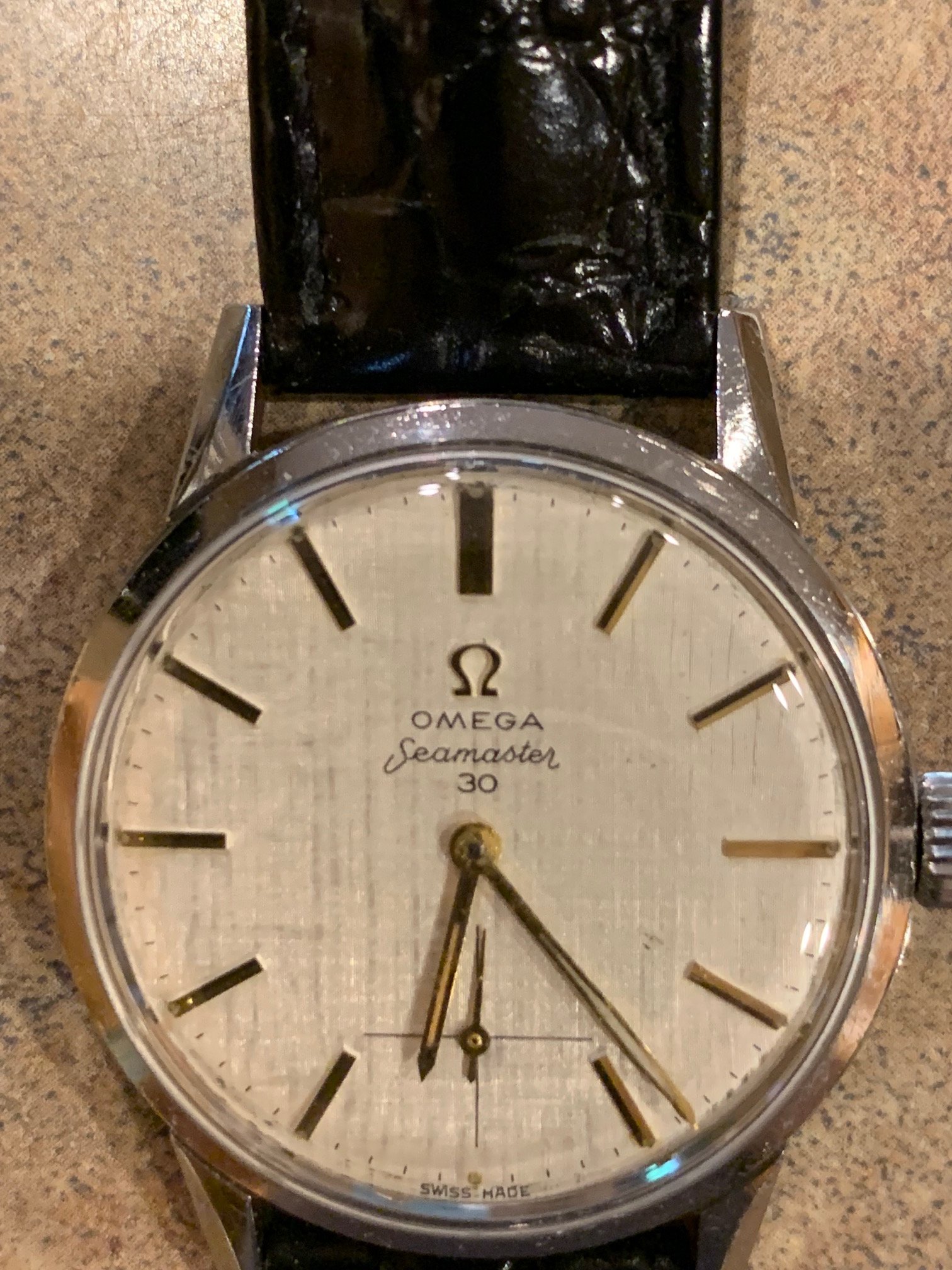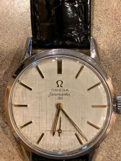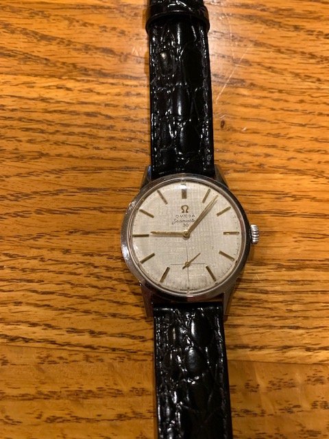 I purchased this watch from a gentleman who's Step Father passed away and it was in the safe he cleaned out. He said it was in the safe since 1973. It's an Omega Seamaster 30 and is in great shape. He said it's a 1963 model, but from my limited research, I understand it may be a 1962 or 1961 model. I paid $350 and then took it to a watch guy who serviced it. He charged me $80 to clean it, oil it and he replaced the crystal because it was previously replaced but not installed correctly. The watch face has a linen finish and a second sweep hand as you can see from the pics. It is a manual wind watch. So, I have $430 invested. The watch is gorgeous and runs perfectly.