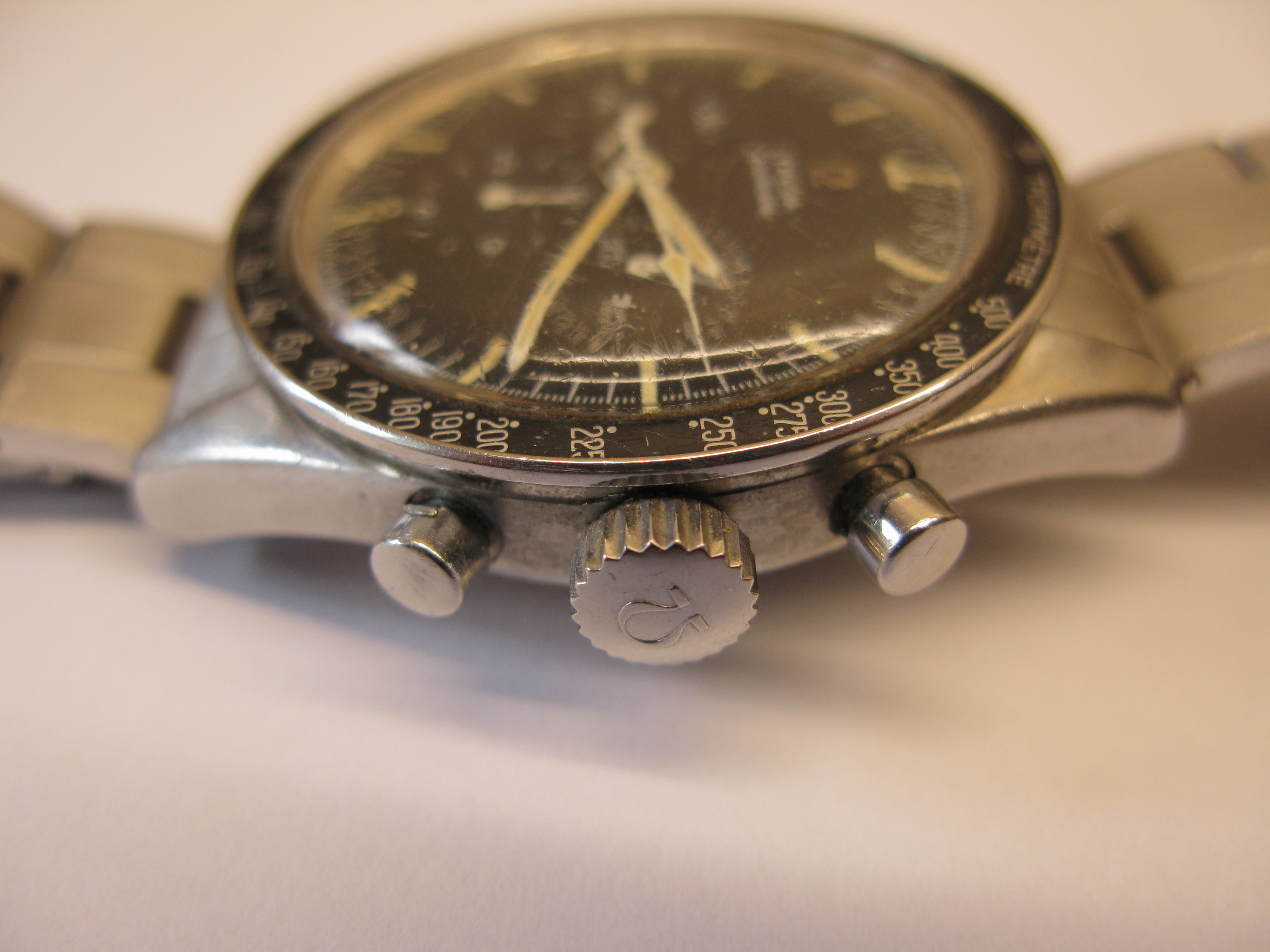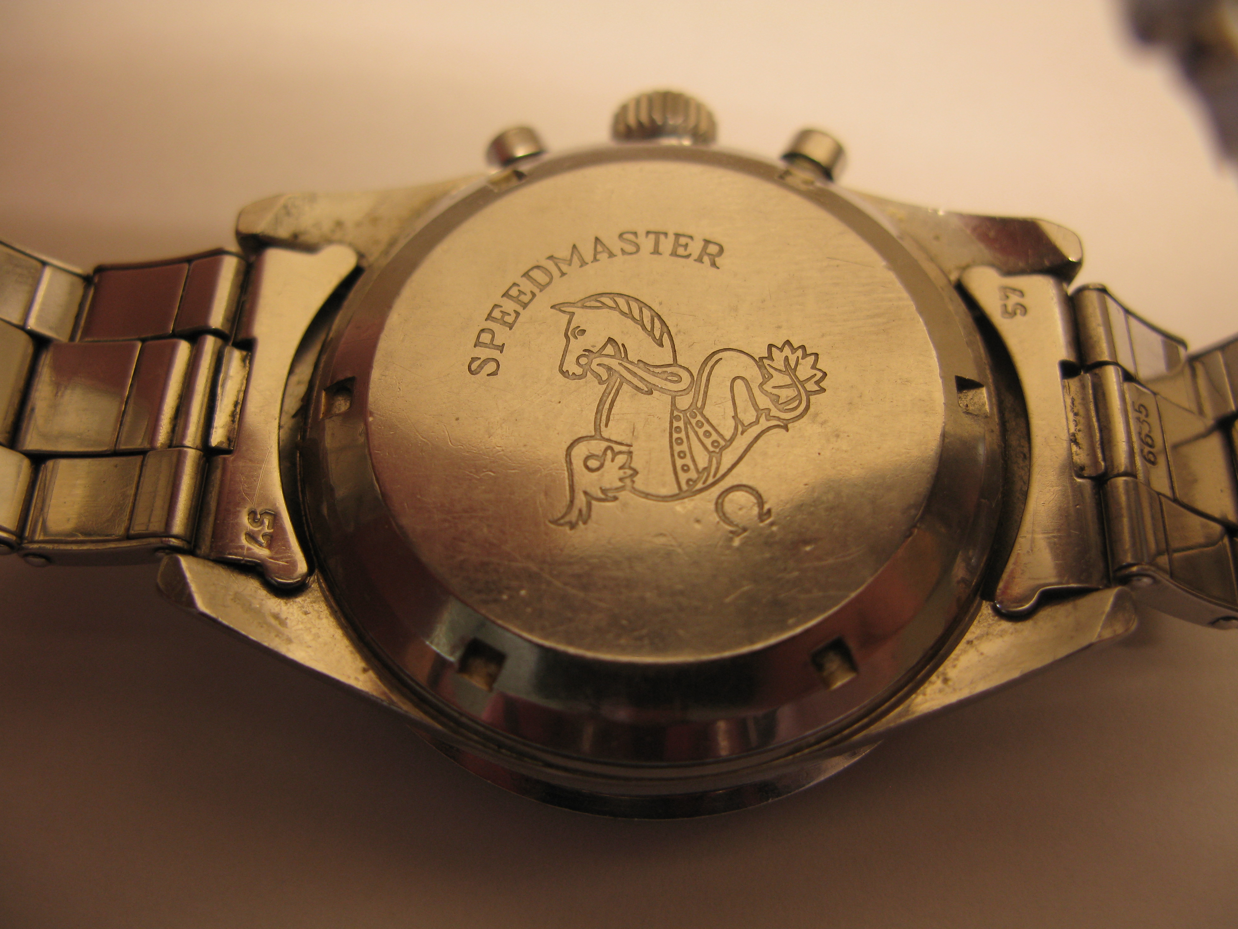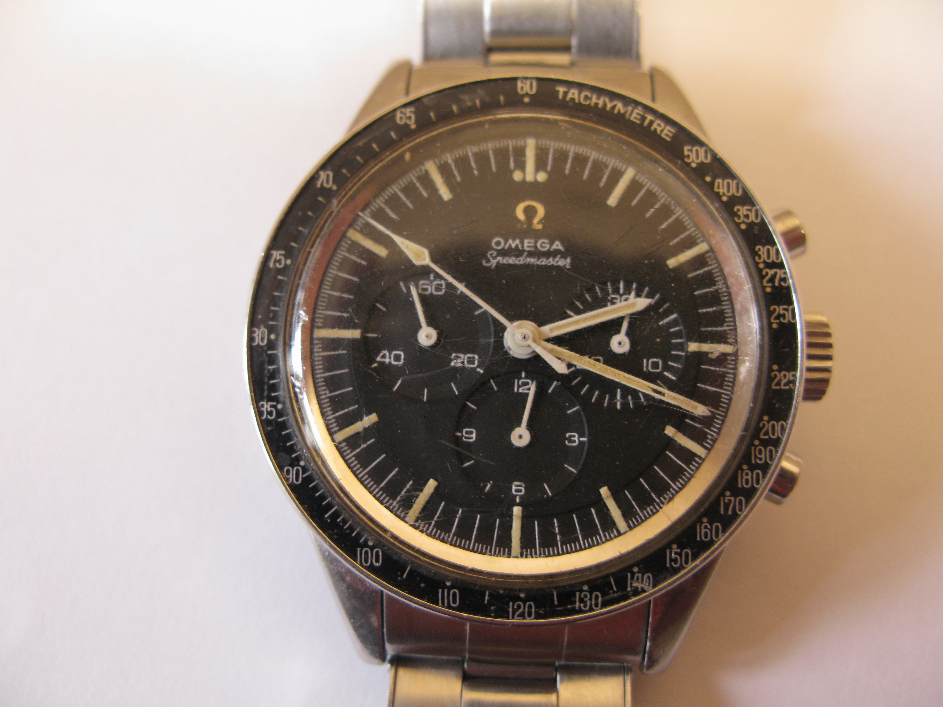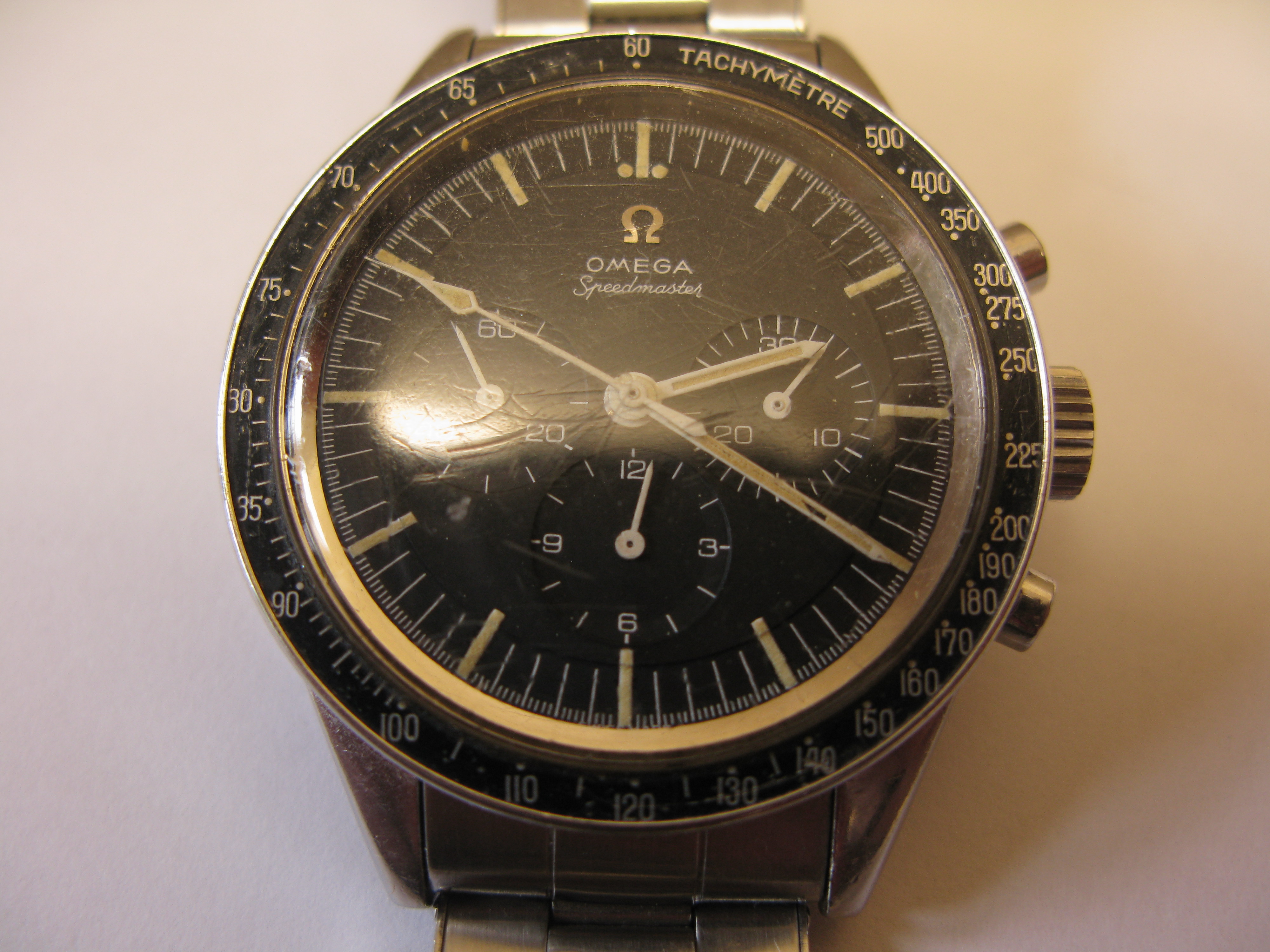 My father-in-law has come across what we think is a Omega Speedmaster watch, which has been in long term storage. He bought it over yesterday and I took a few photos which I hope will give a better idea. The watch was working fine, but has has scratches on the glass, and the bracelet is a ladies Rolex (it was worn by mother mother-in-law occasionally). Box / paperwork sadly long gone.