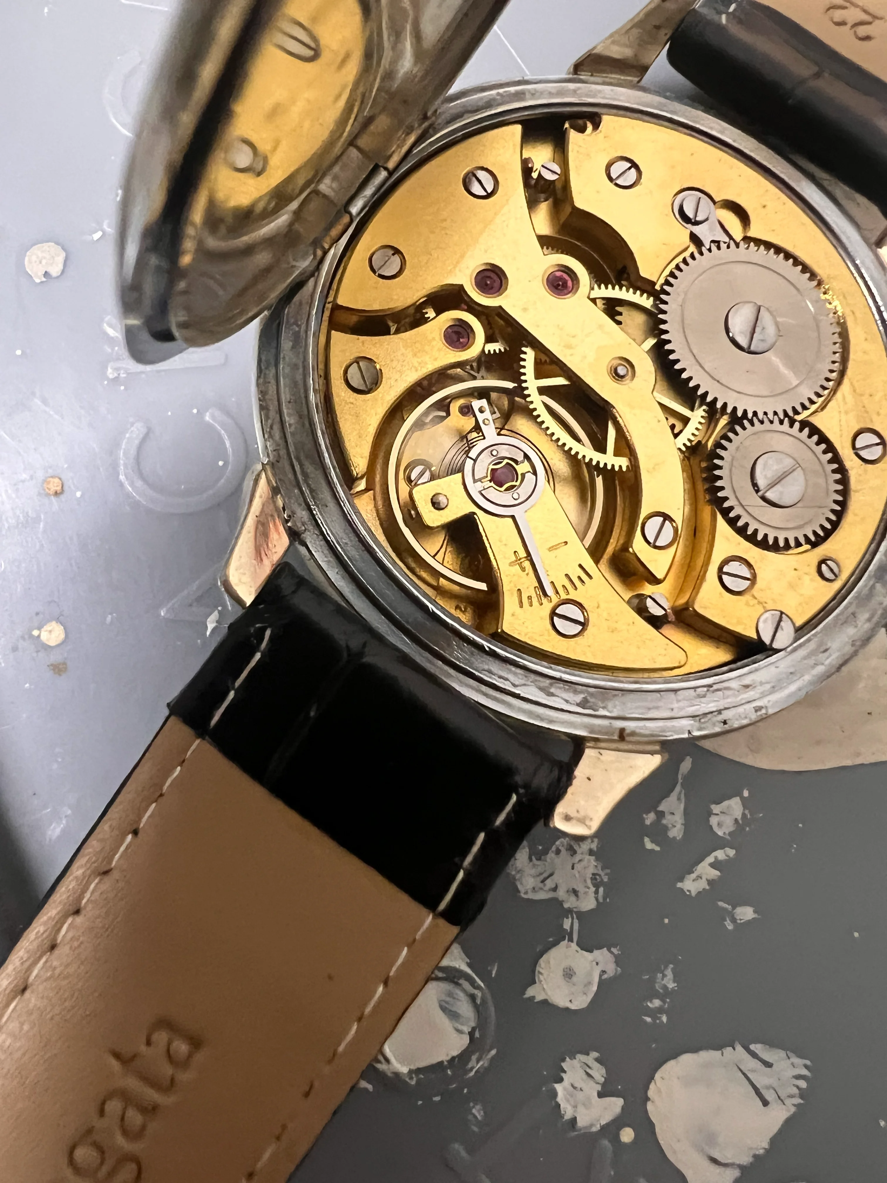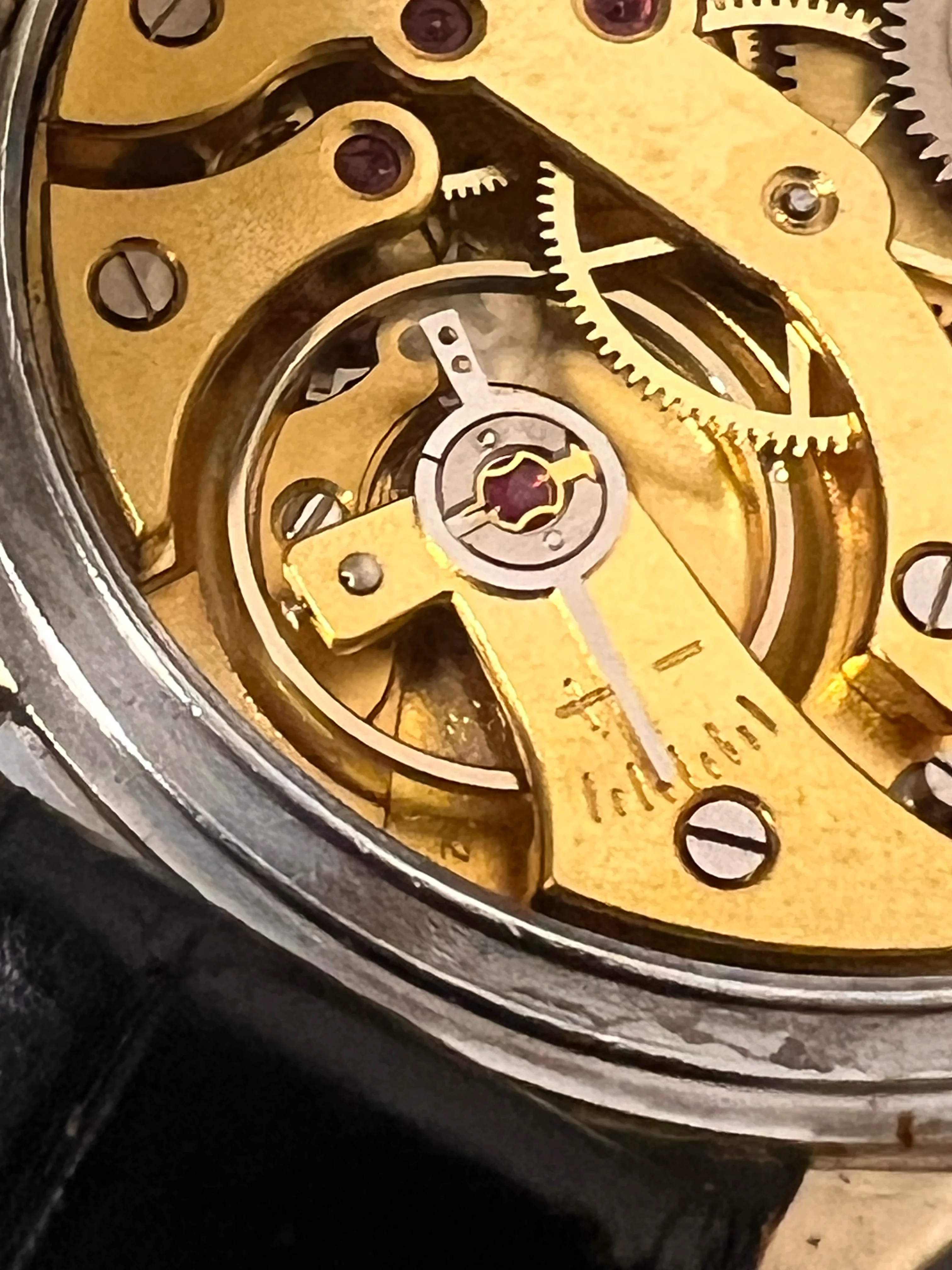It's wristwatch but in a hunter case, so some kind of marriage pocket watch job I thought. I was expecting to find a fake movement, and opened it up and found the following . I immediately thought it looked way too new for a 1930s/40s movement and no Minerva markers etc., so case closed. But on closer inspiection, but it does look similar to some Minerva models on Ranfft like https://ranfft.org/caliber/7897-Minerva-12-open-face - there are some small markings under the balance but can't make them out