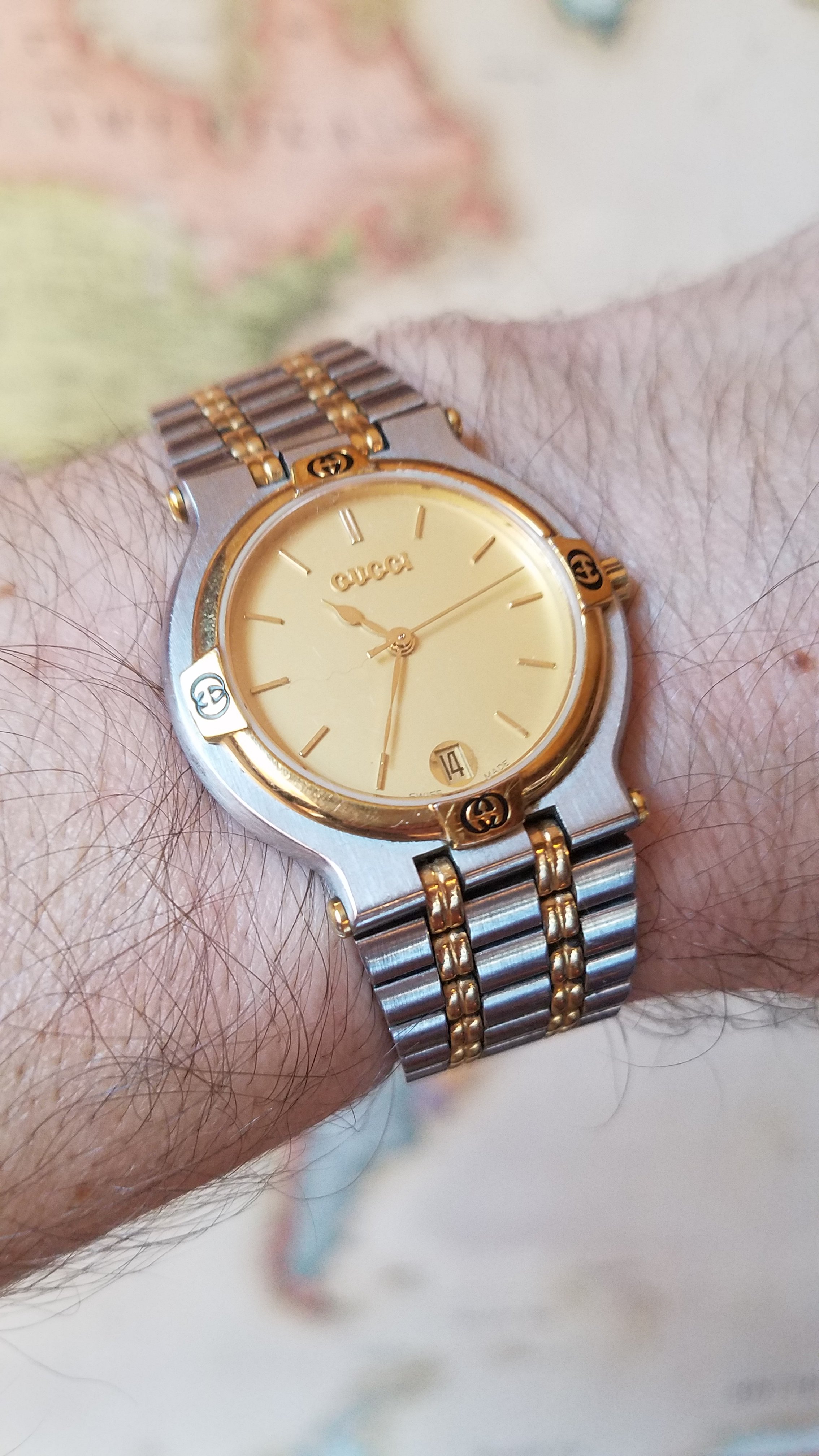 路My first "luxury" watch was a Gucci when I was 17. My dad and I were on a vacation in Los Angeles, and we were driving around Beverly Hills. We parked on Rodeo Drive right out in front of the Gucci store. We walked in and he bought me a $500 watch and then we walked to a restaurant to have lunch. I remember that day like it was yesterday. I thought it was the greatest watch ever. I still have it. It makes me laugh now. Especially the idea of it being a $500 watch back in the 1990s (stainless steel, quartz, really nothing special but a Gucci logo and a "Swiss Made" mark; the model was 9000M). Just pulled it out of the drawer, and it still fits! Well, it cuts off the circulation in my arm, but I was able to get the clasp to close.