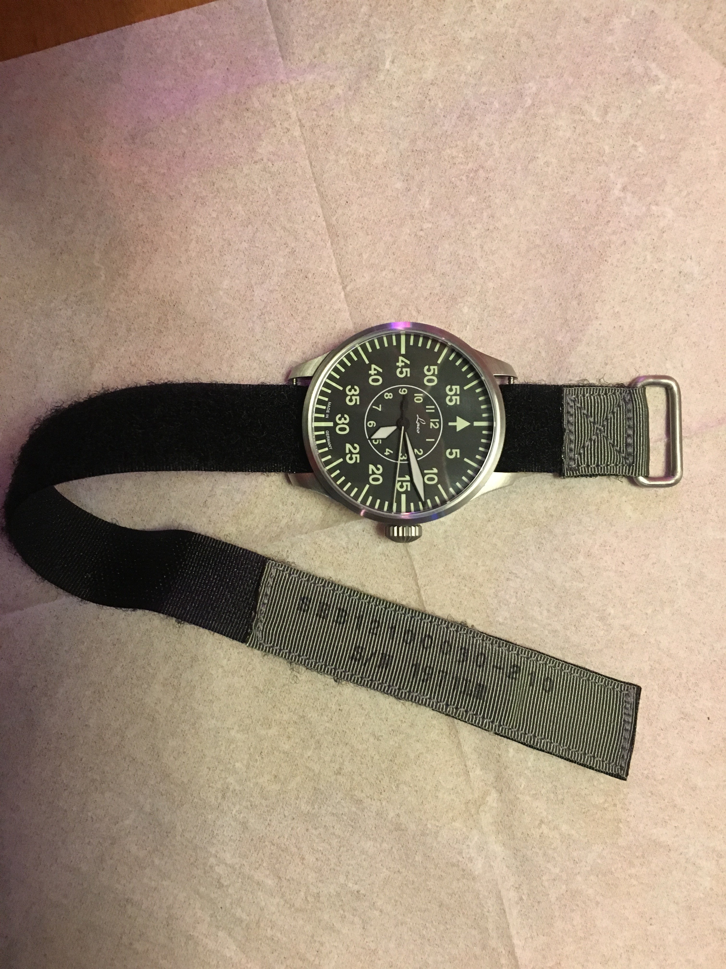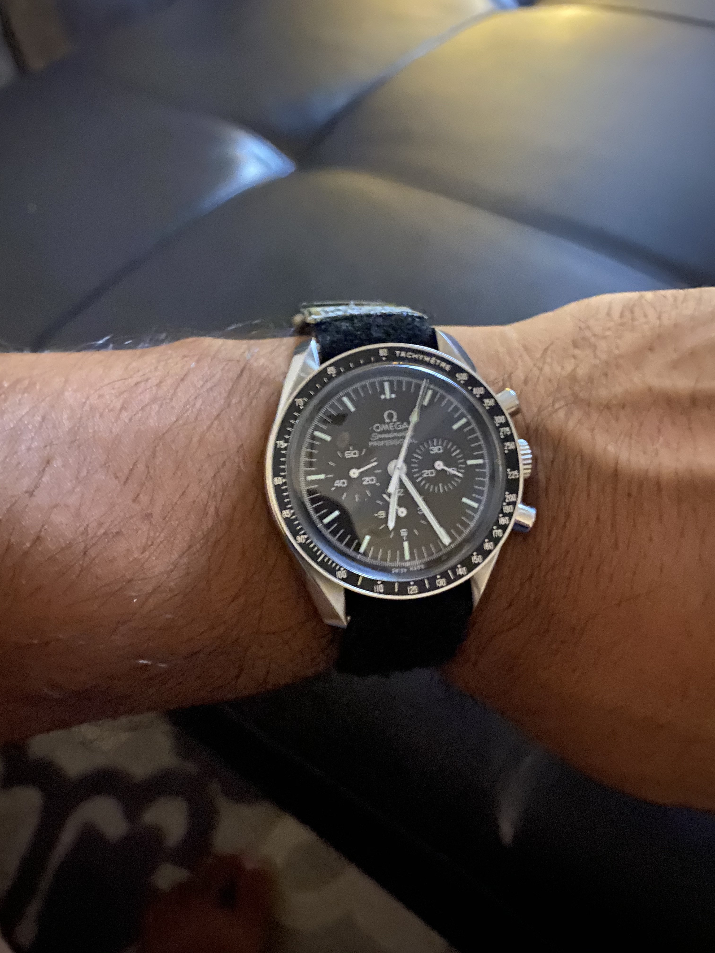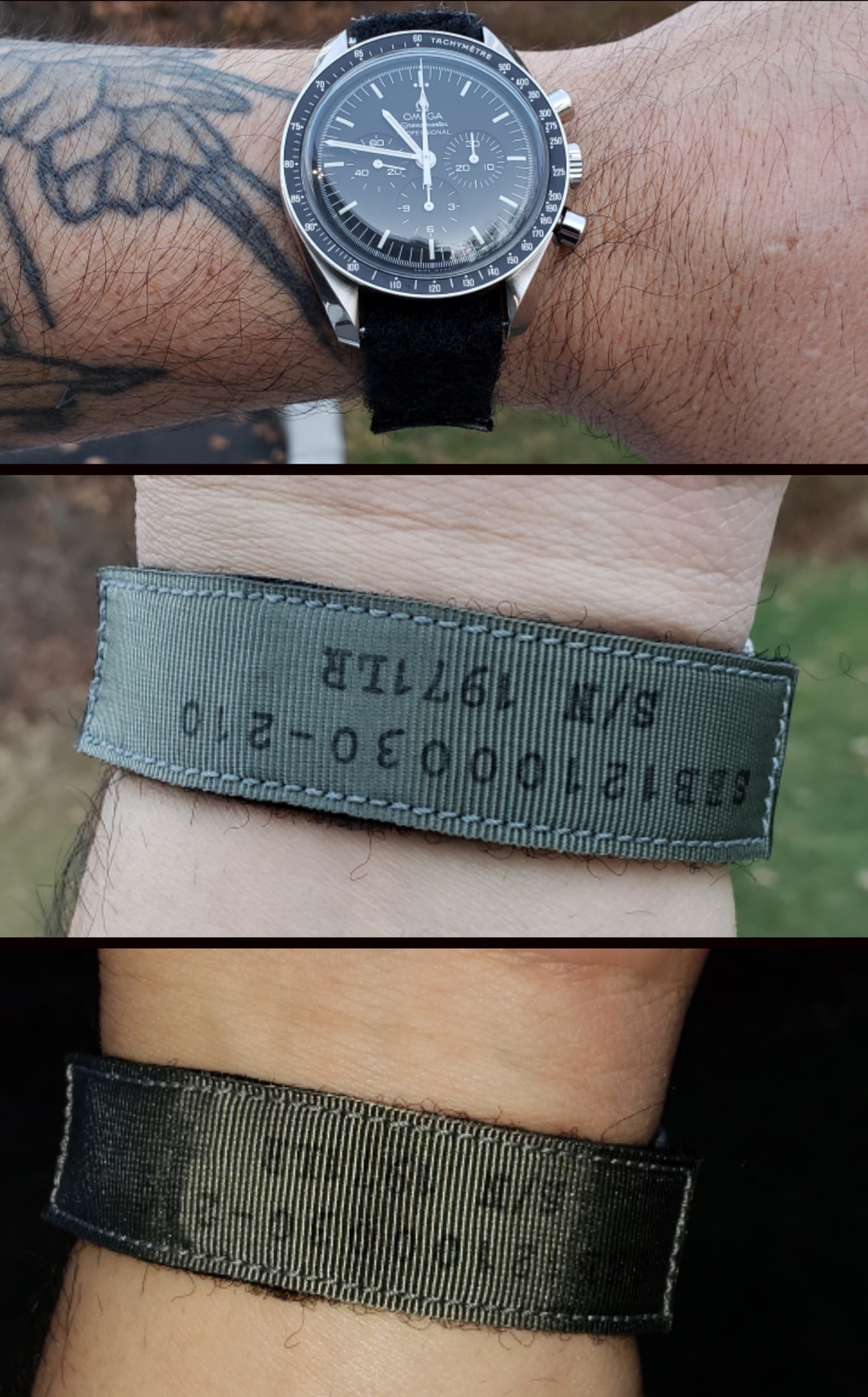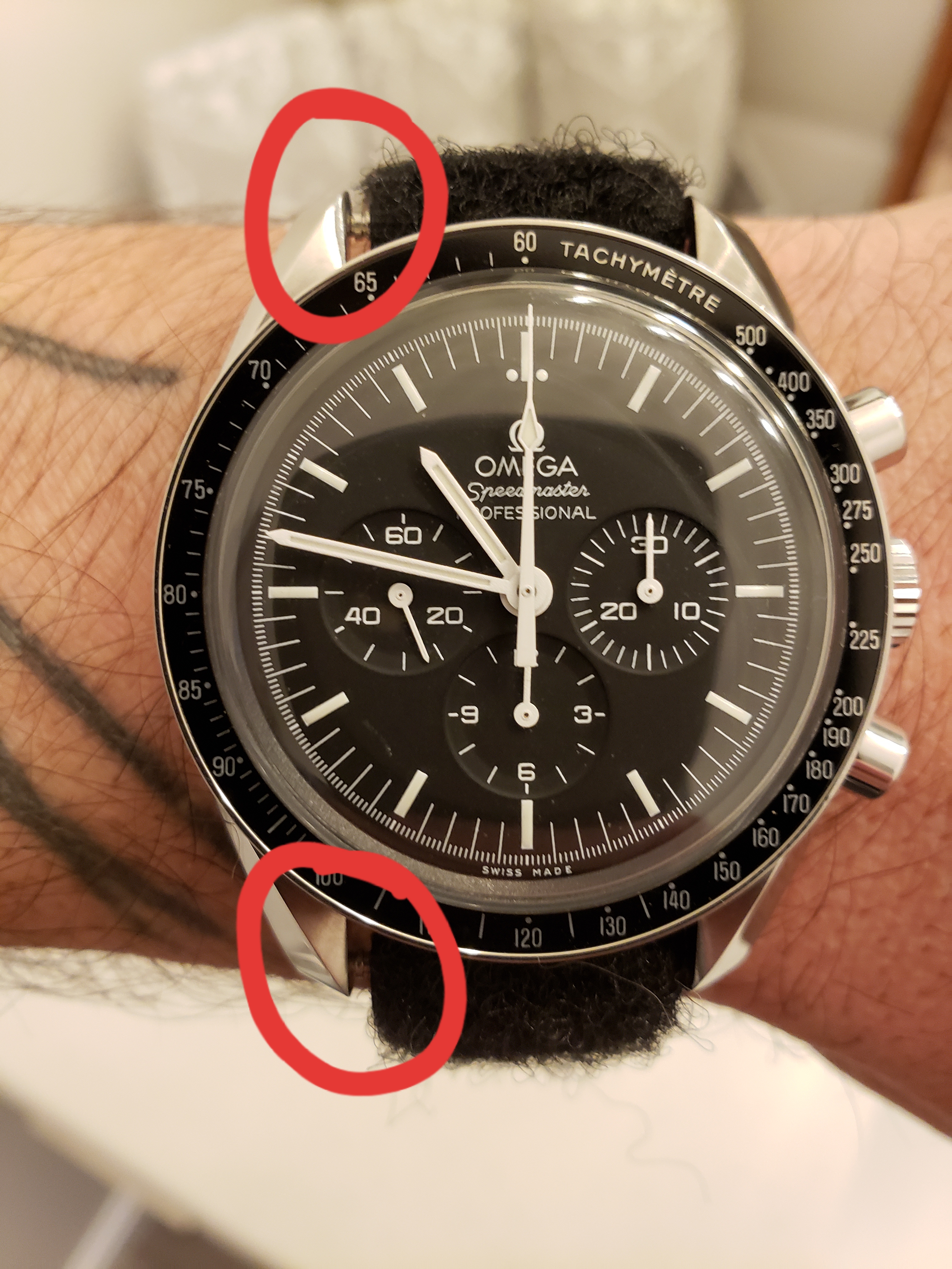 路Hate to say it but I'm not a huge fan. Like @Cenzo said the hook material could be longer but then I think it would reduce the size range of wrists it would fit. It still feels plenty secure so its fine. My gripes however would be the material that contacts the skin is super scratchy. I had to blow the dust off my speedy suitcase just to compare it to the included astronaut strap and this one is clearly more "rough" than the long one that omega includes. The grey color comes off as a light green in natural and artificial light. I thought as soon as I opened the package that I was shipped the wrong color but comparing it to the green online it's clearly the grey. Regardless, it still looks green to me and I was turned off from the green one posted basically for that reason...... I didn't want a green strap Haha. Next on the list of my complaints, the gap that is left from this not being a full 20mm (see red circles in pic) Being a replica to something nasa would use, you'd assume the first watch that comes to mind would be a speedmaster with 20mm lug width. Lastly, and maybe this is my OCD, it annoys me that the p/n-s/n arent facing me when worn. (See picture) In the example shown the wearer has his writing facing him and thats what I would have preferred. Maybe that last one is me being picky.