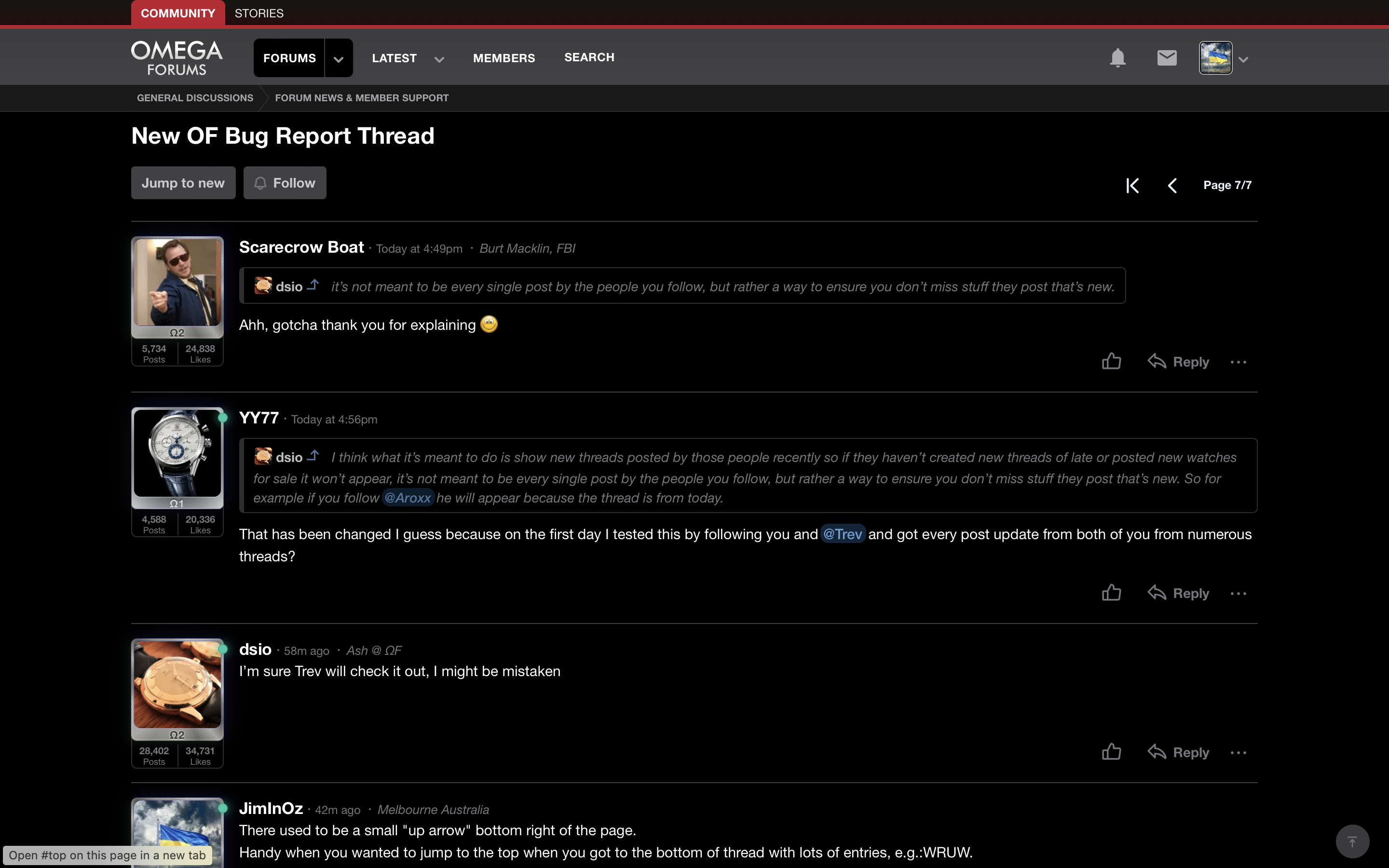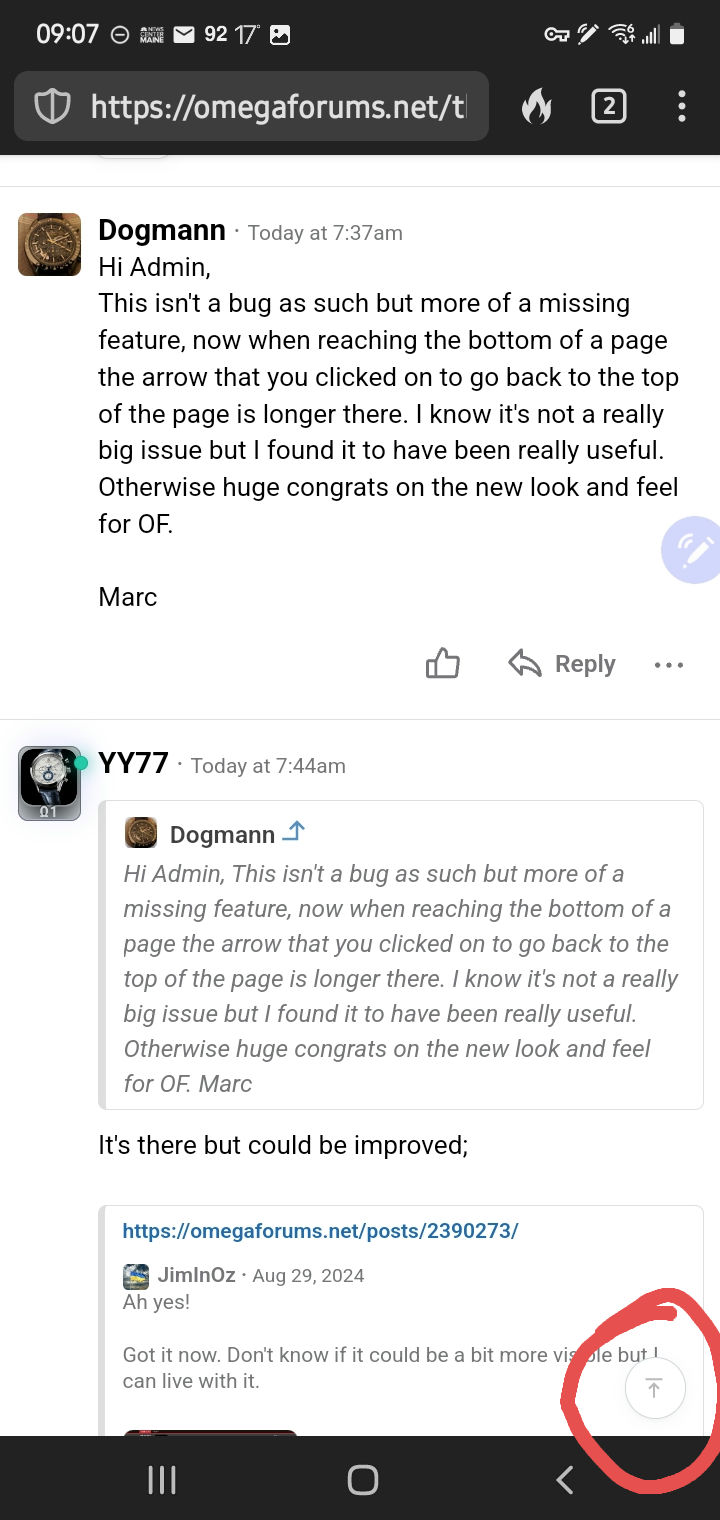 This isn't a bug as such but more of a missing feature, now when reaching the bottom of a page the arrow that you clicked on to go back to the top of the page is longer there. I know it's not a really big issue but I found it to have been really useful. Otherwise huge congrats on the new look and feel for OF.