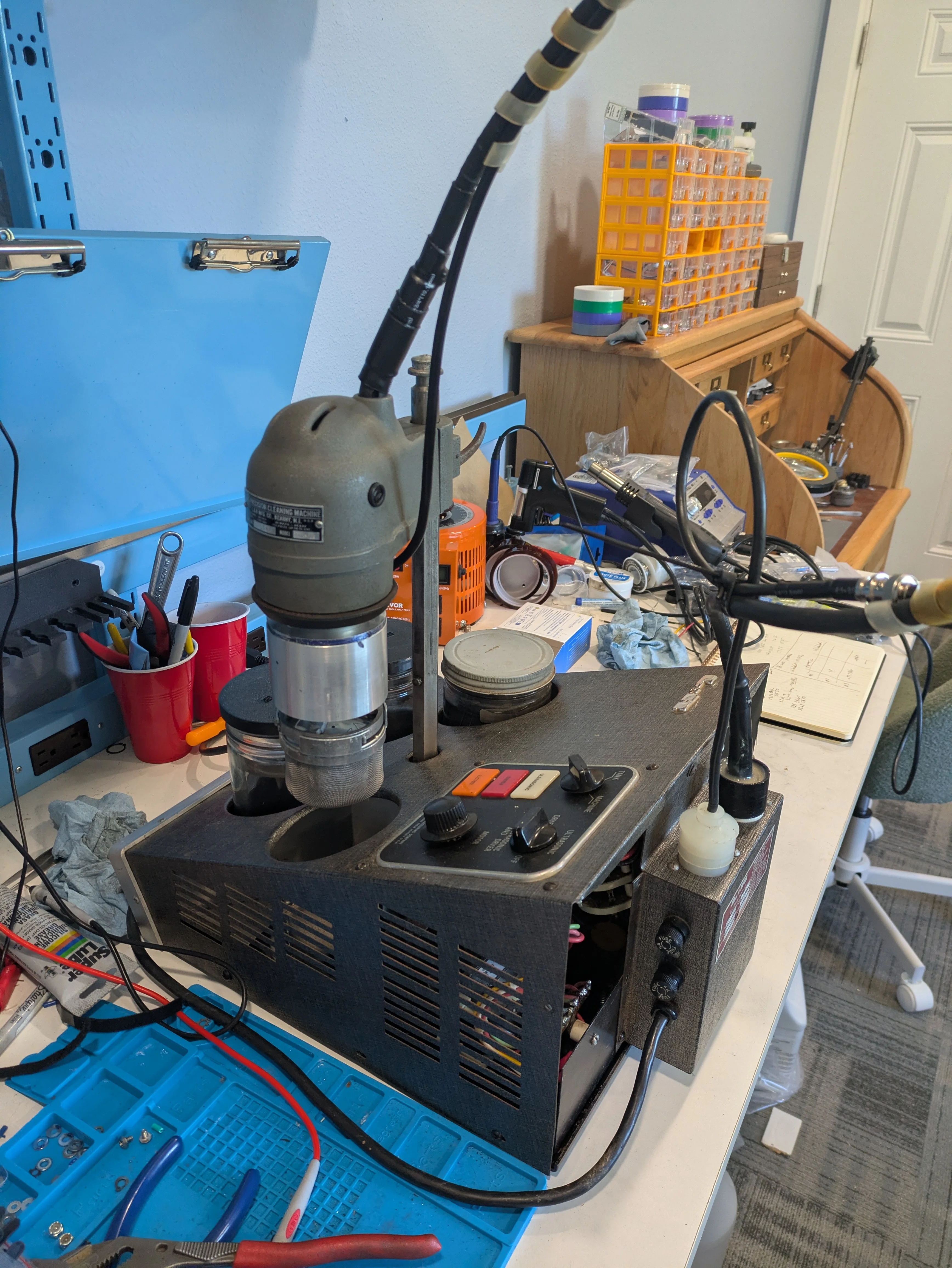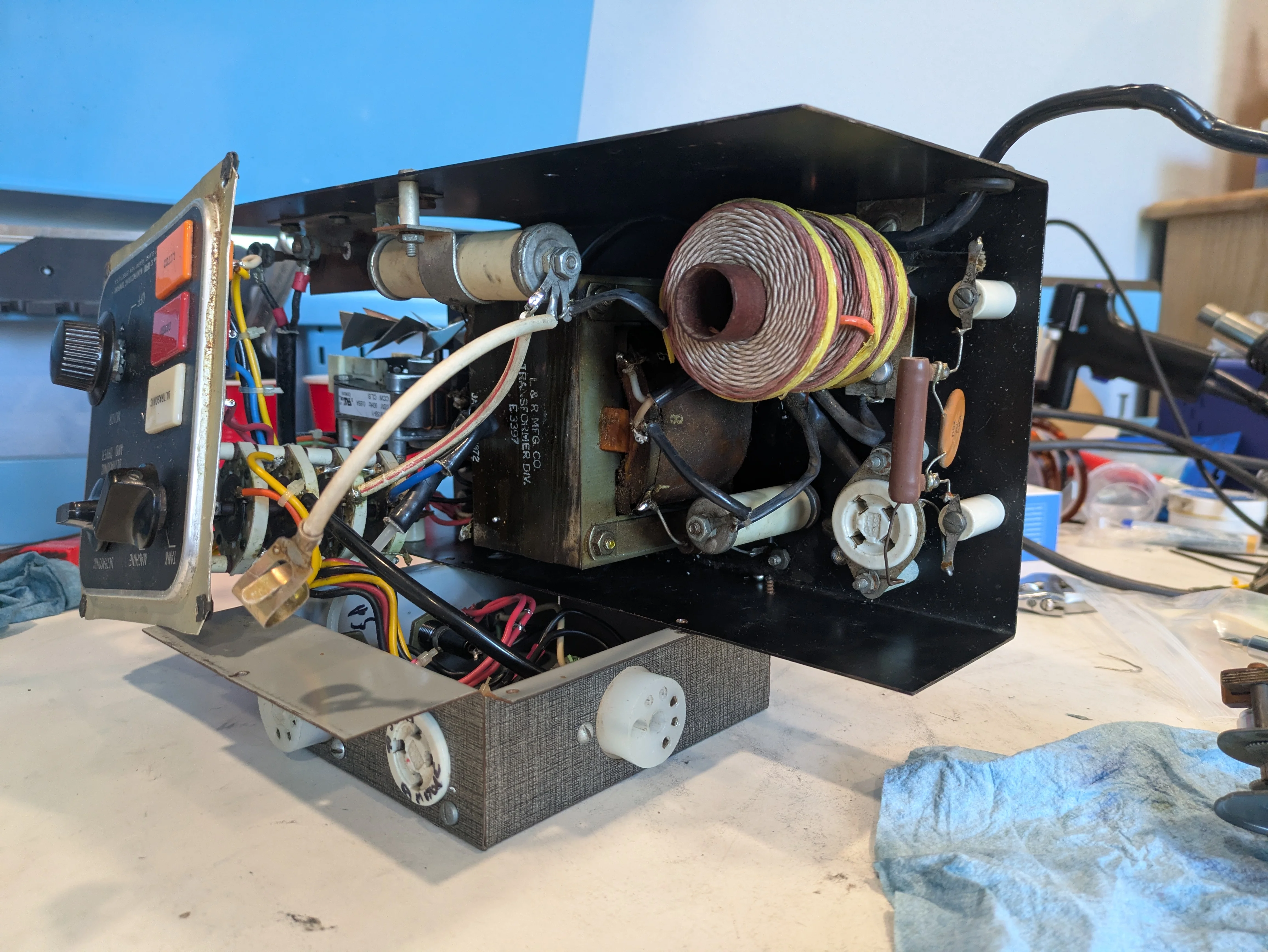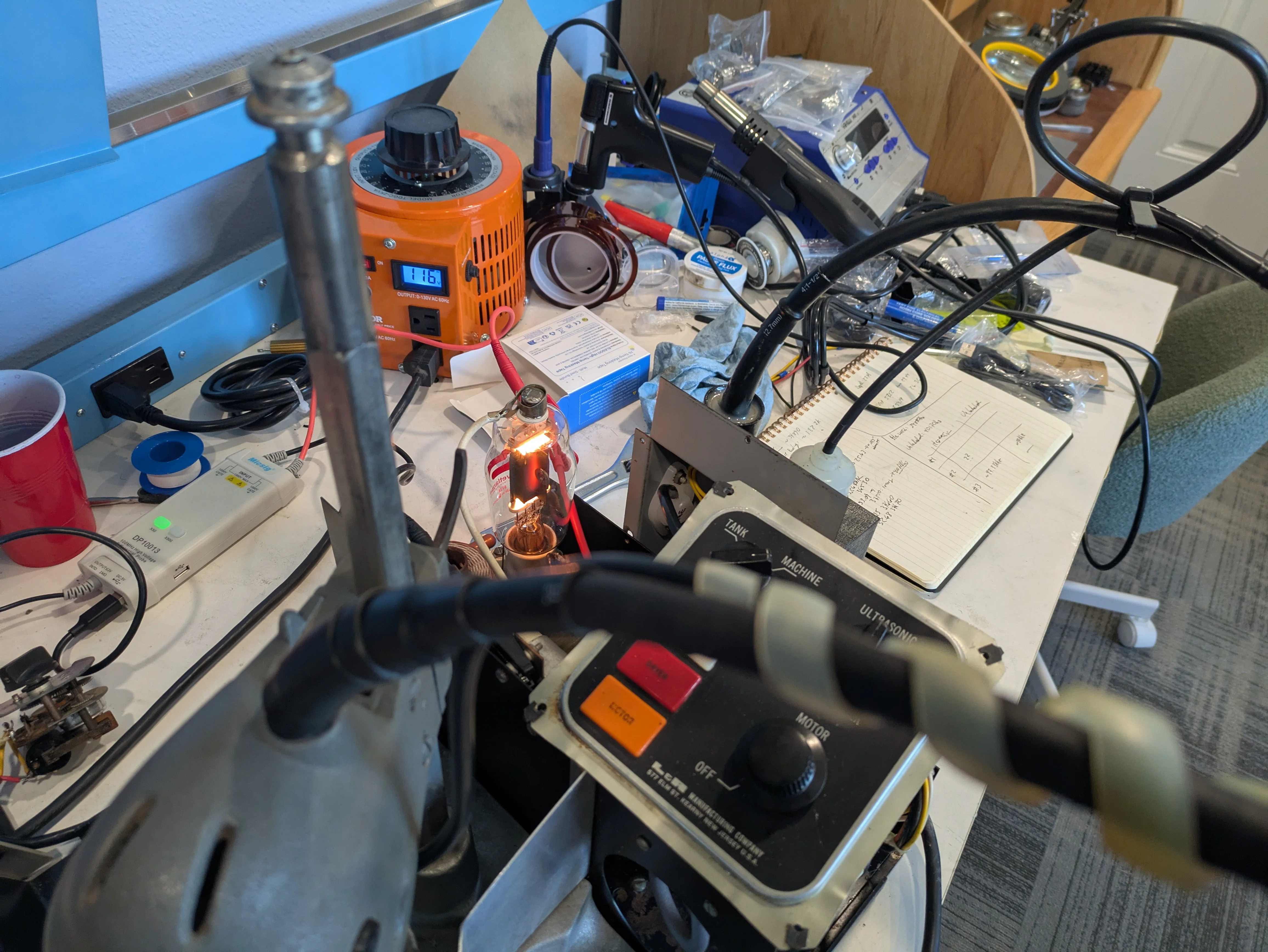 路No good pictures today, but I got the whole transducer assembled and tried to test it. What you do do is have a signal generator run a sine wave through it and a resistor, then use the oscilloscope to measure the frequency input and the current-only (via the resistor) and see when the two line up/maximize the current use, which should be your point of resonation.