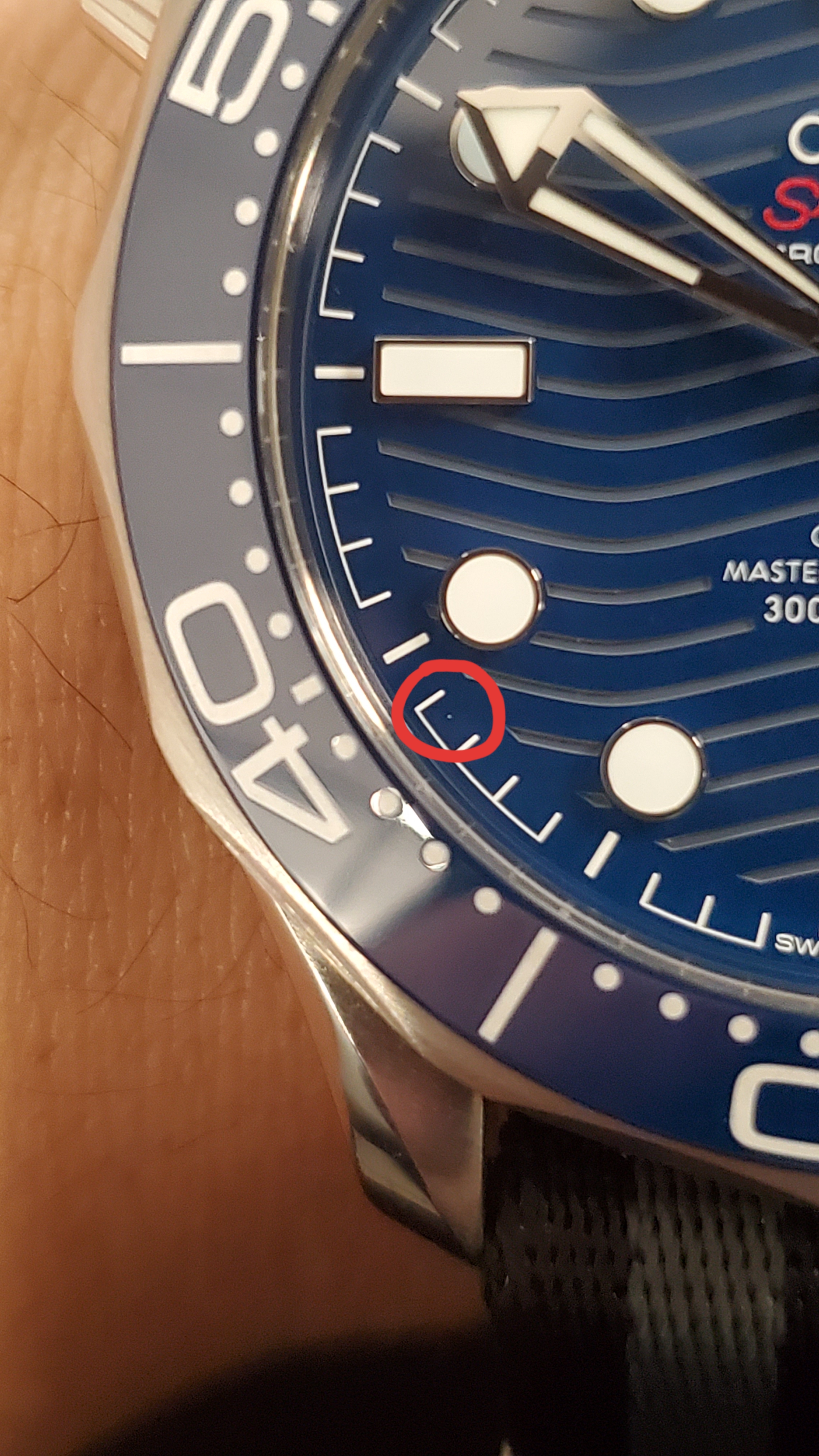 ·New to watch collection and got a 300M Seamaster as my first Swiss watch. Got it during Christmas and I loved the watch. One sunny day when i was outside I saw a white spot under the 8 o'clock position. I thought it was something on the sapphire crystal, try to clean it and nothing happened. After I went home I took a closer look and found out the white dot is on the dial. Originally I thought it was a spec of paint and I contacted the AD in Las Vegas where I got it, the person ensure me that it would not damage the function of the watch and offer that if it bother me I can send the watch back to them and they'll take care of it. Orignally I thought it's not gonna bother me, but it end up being an eye sore for me so I took it to an AD locally where I live to have them to have a closer look. They placed it under a magnifier and determined that it's not a paint spot but a chip on the dial. Really sad to hear that but shout out to the AD they said they'll take care of everything. Just our of curiosity, is this common among the new Seamater with ceramic dial? I would say it's a little bit discouraging this is my first watch and I have to send it back after 2 months.