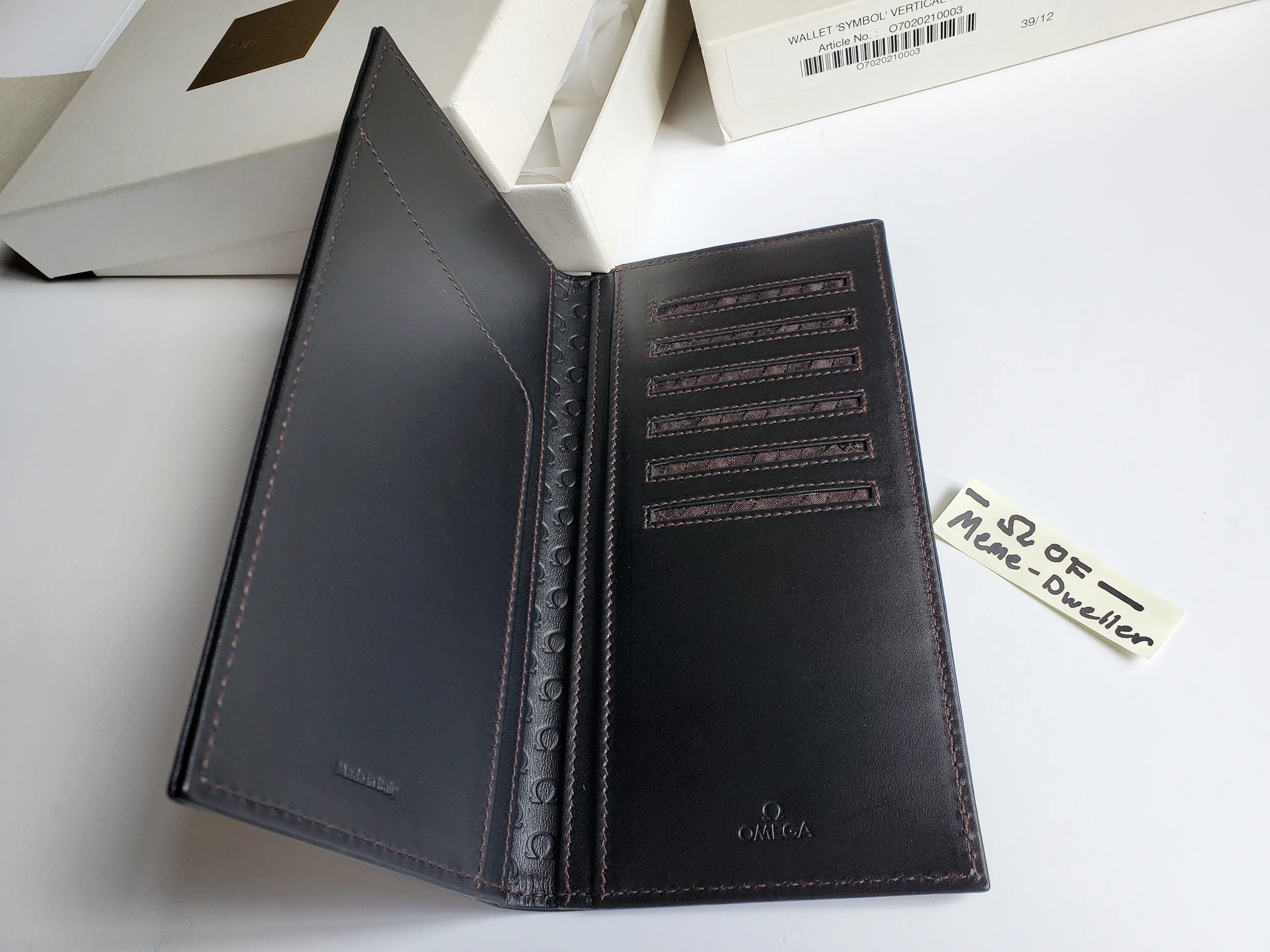 Up for sale is a brand new fine leather Omega logo pattern long wallet purchased from the Omega Boutique. The retail price of the long wallet is currently $600 + tax. Omega Boutique exclusive. Yes, Omega sells wallets! Has 6 inner slots for cards inside and another in the back. There are 4 inner pockets that are long enough to hold cash (USD-sized) unfolded. Measures approx 7.25" x 3.75" (18.4cm x 9.5cm). Made in Italy. This style is no longer produced and I've never seen one of these pop-up on the used market, so it's relatively rare. Comes with original box and dust cover pouch.