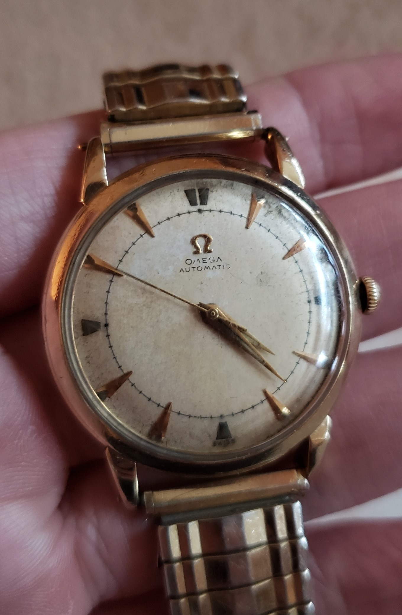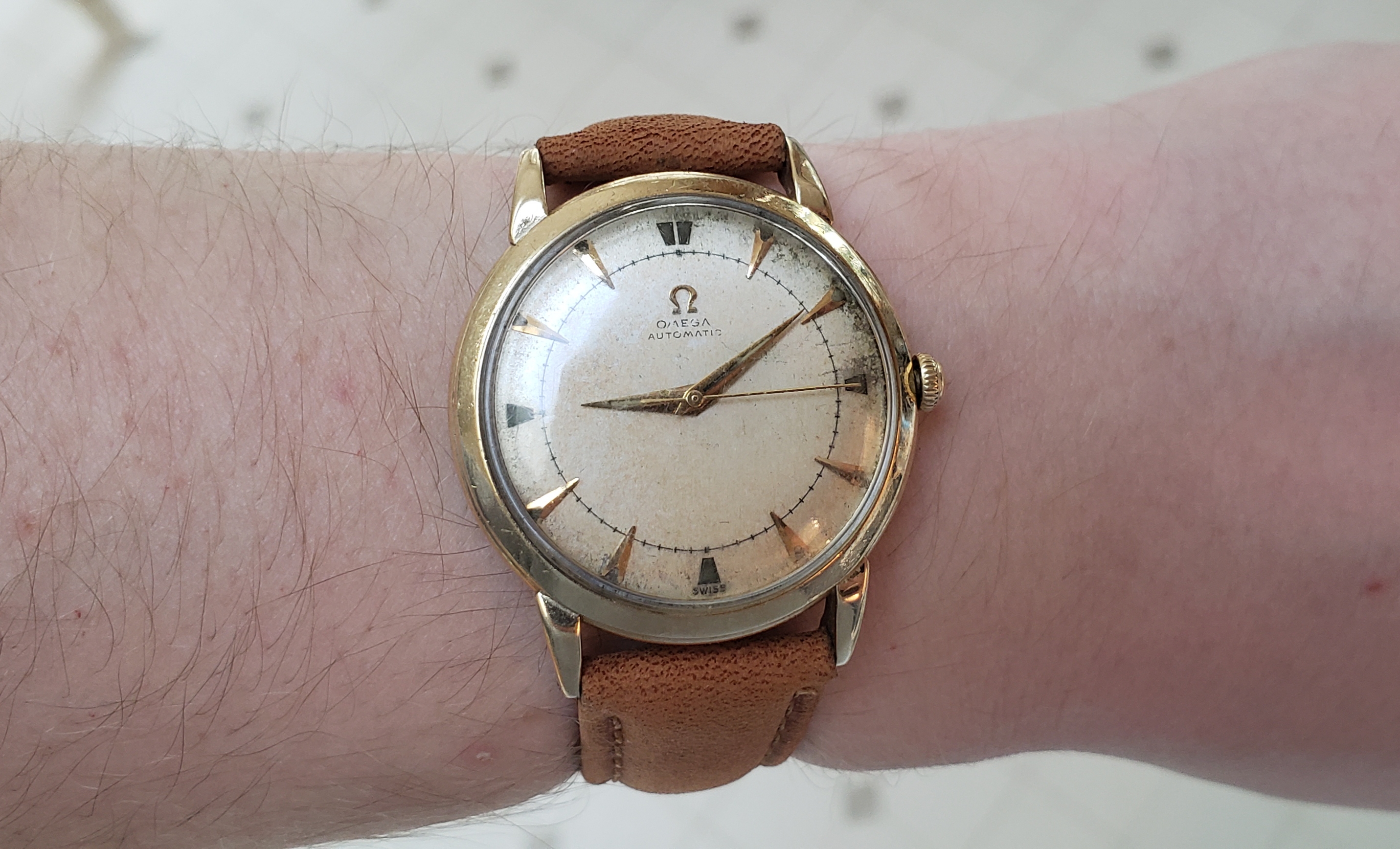 Grabbed this today for around gold price. Unfortunately the dial is a bit messed up. It doesn't appear to have been redialed before but there are some bad nicks on the font of Omega and Automatic. I'd hate to get it redialed and lose the originality of it.... what do you all think about it?