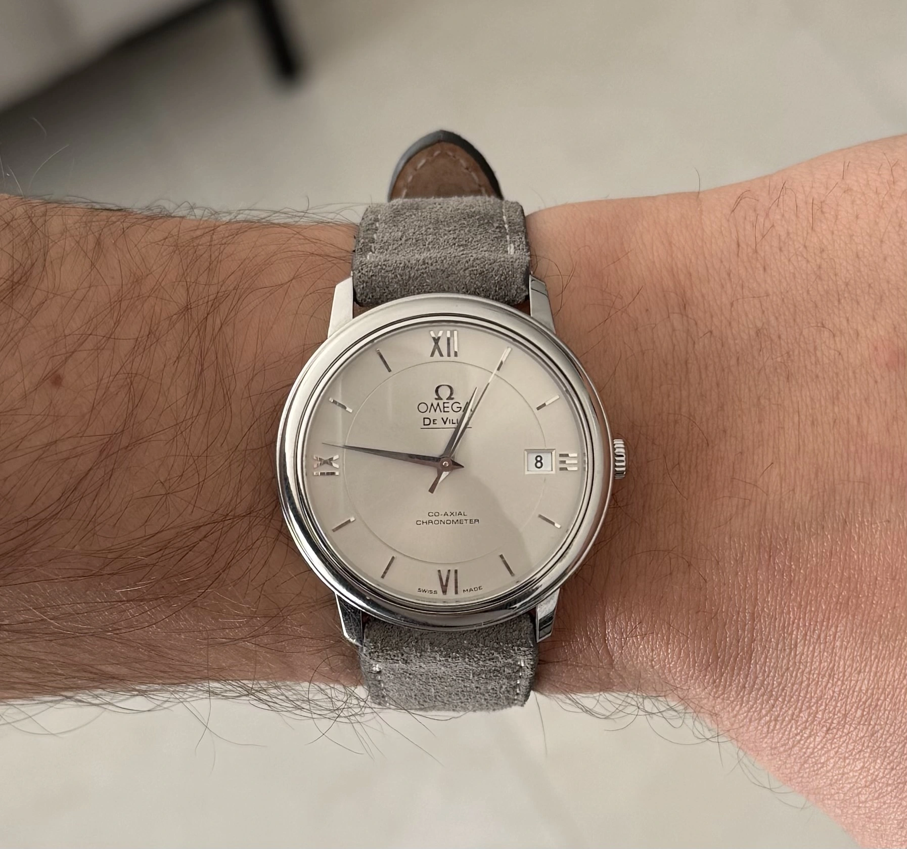 My continued search led me to proper dress watches, a category I absolutely didn’t care for before. Here I discovered my new grail watch: the Patek Calatrava 5107G (sadly not within my budget atm). As the Calatravas have a pretty generic design that at some point has been part of most watch manufacturer’s catalogues I decided to check out Omega’s dress offering. Their current pieces starting at 39mm I consider too big so I turned to vintage. The pieces I liked most were the pie pan dial Constellations of the sixties and seventies. Some things put me off there, questionable (service) history, non hacking movements without quick set date and a size of 34mm which I would consider being slightly too small for modern standards, even though I definitely prefer modestly sized watches.