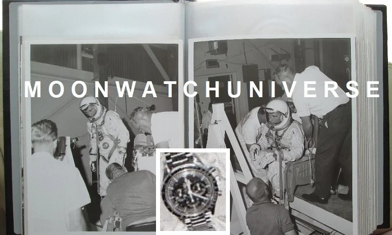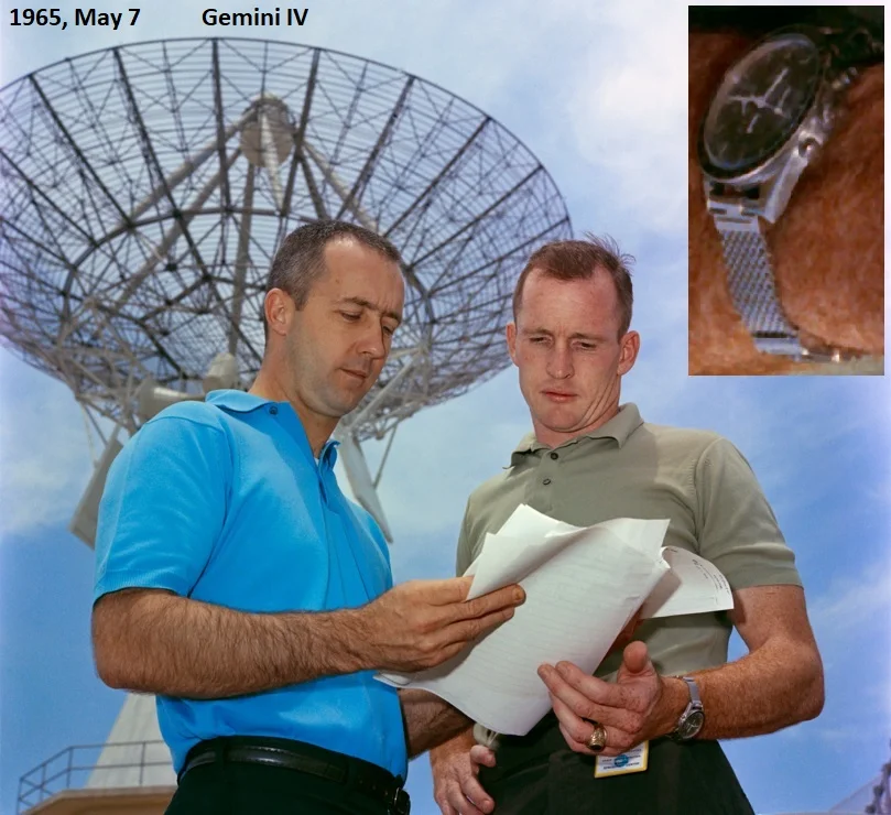 Wrist-watch wise we notice the first Omega Speedmaster chronograph on Young's wrist at NASA during a Gemini III weight-&-balance check dated March 3, 1965. Hugely interesting as NASA had just tested chronographs for spaceflight and Gemini III astronauts Grissom & Young each wore an Accutron Astronaut GMT pilot watch and Omega Speedmaster chronograph during their March 23, 1965 spaceflight mission.