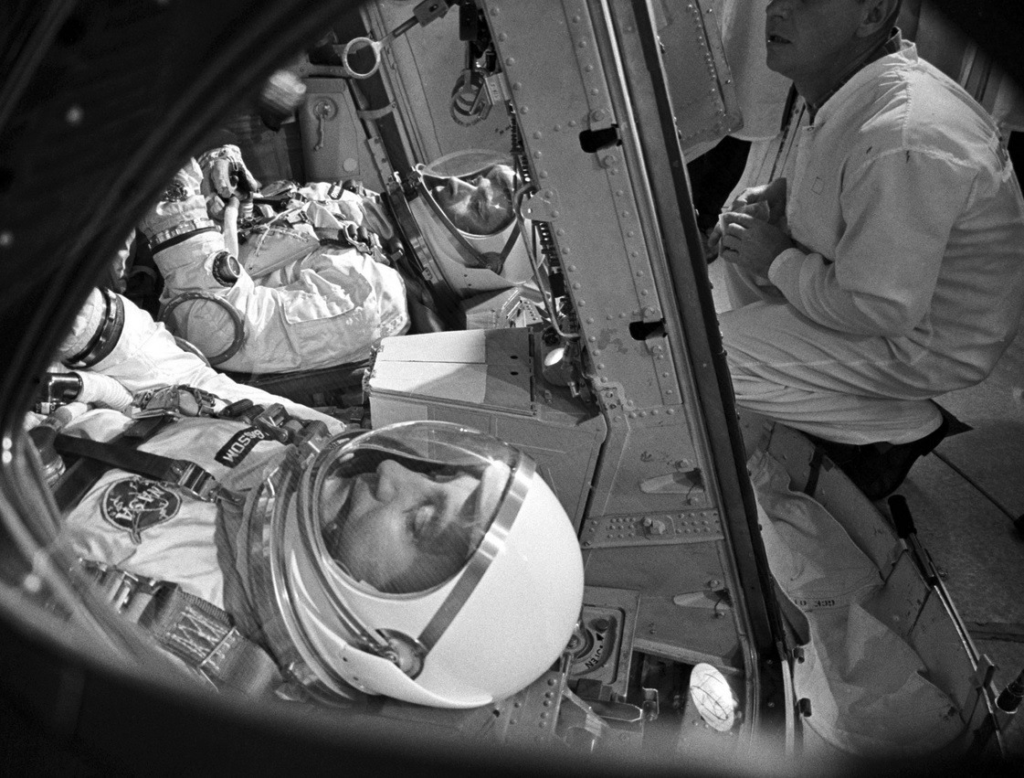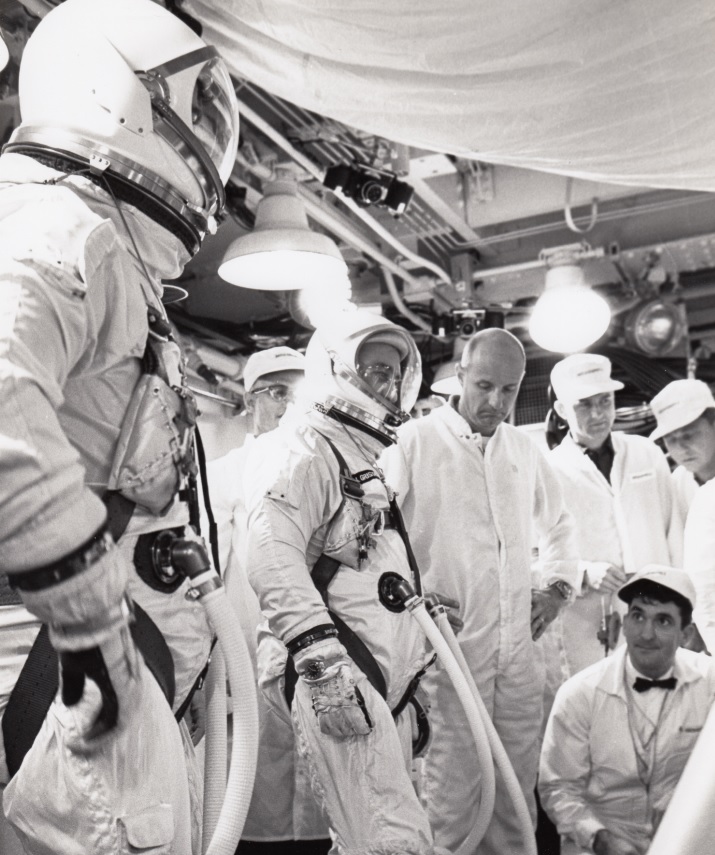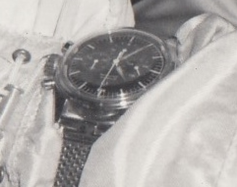 The two men Gemini III mission marked the first use of officially flight-qualified accepted Omega Speedmaster watches by NASA astronauts. Veteran command pilot Virgil Grissom wore a Speedmaster and an Accutron Astronaut while astronaut John Young wore two Speedmaster chronographs. On the launchpad, astronaut Thomas Stafford assisted with capsule ingress and also wore an Omega Speedmaster (NASA photo 65-H-441).