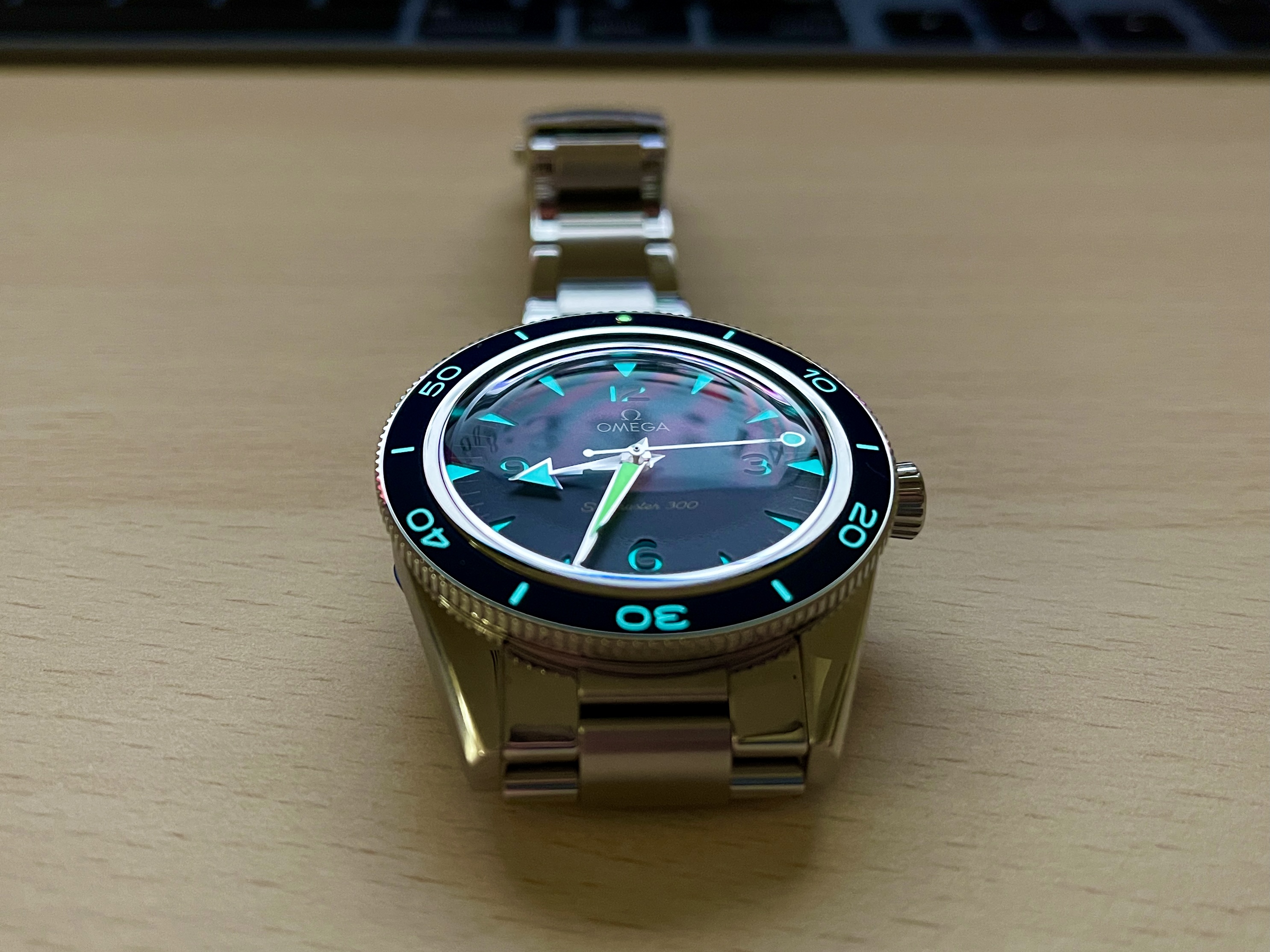 Looking great in the daylight more like an anthracite blue, dark hue, great size/weight/feel, excellent bracelet and clasp, silent motor (thank you Ω, at last!!!) they really improved it over the last generation