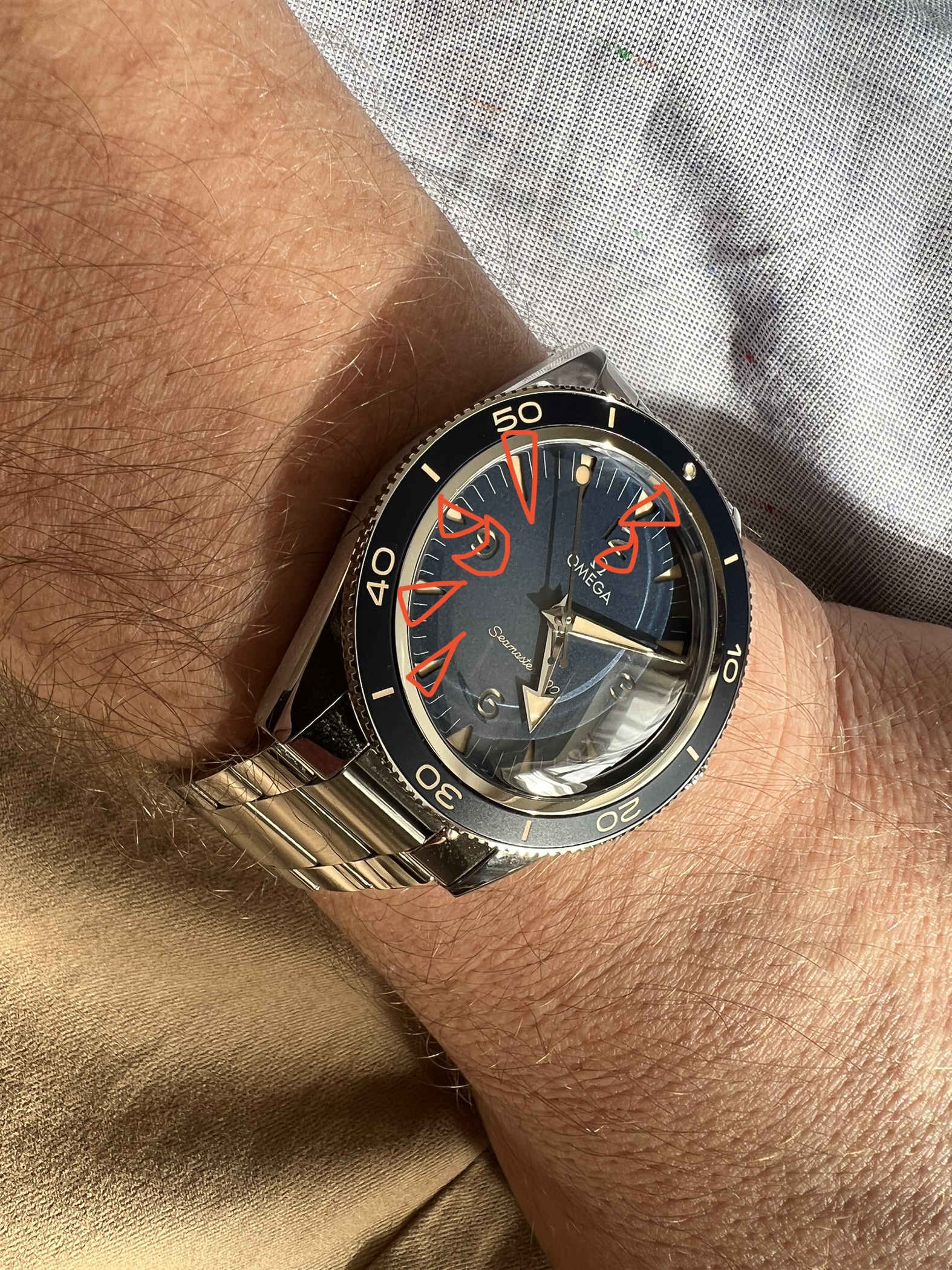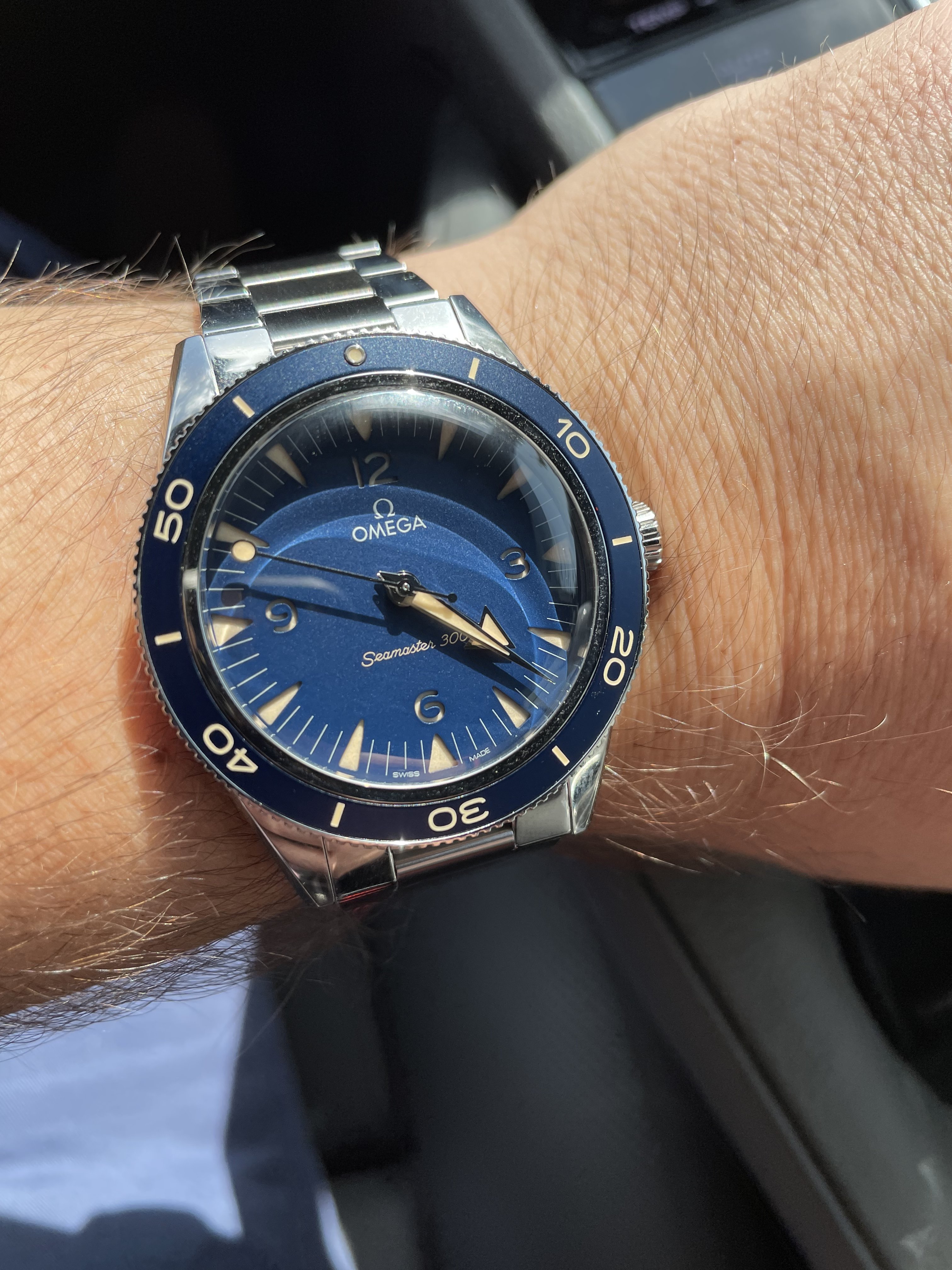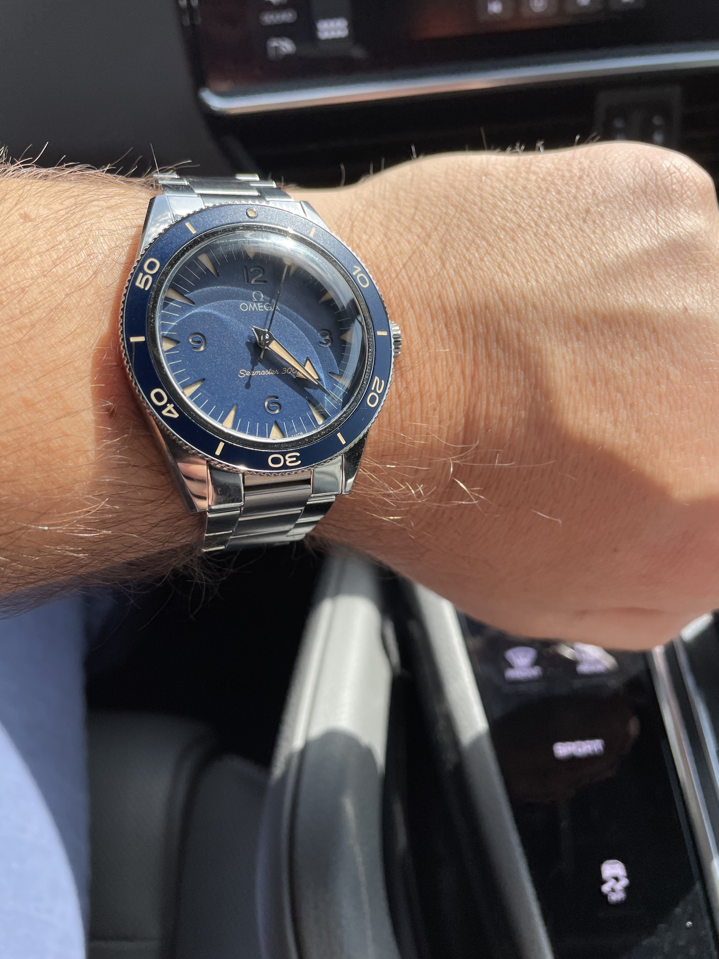 I tried both on at the Omega boutique in London (Oxford St) and it may have been the lighting but I found the blue washed out, in particular when it came to the bezel. I thought the contrast between the black and the faux patina worked better and that the black would be a more timeless design. I’ve ordered the black (from somewhere else for a fair bit less) and am waiting for it to be delivered. I’ll post some detailed pics when it arrives.....