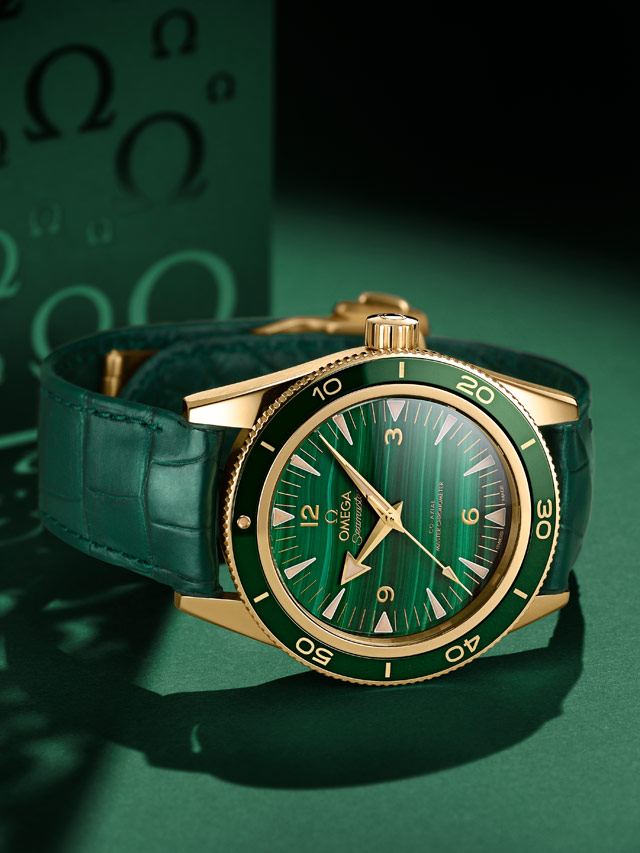 ·The new Seamaster has a 41 mm case made from 18K yellow gold and features a green ceramic bezel with an OMEGA Ceragold™ diving scale. Most captivating of all is the watch’s deep green dial, which is made from the precious stone malachite. It includes 18K yellow gold hands that are filled with “vintage” Super-LumiNova.
