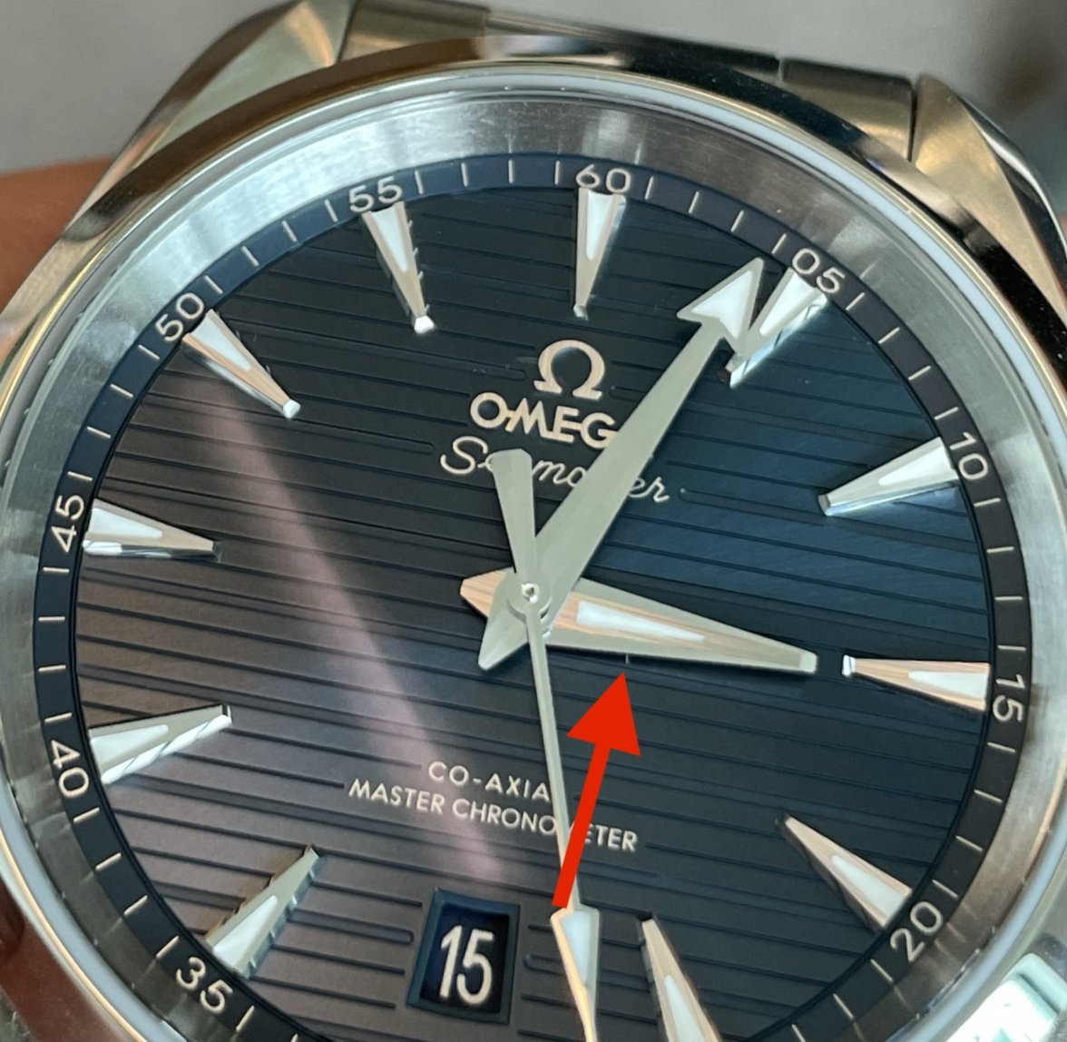 I am quite happy with it, but kind of upset that I have discovered a particle hanging under the hour hand. It is either white or silver (the colour of the hands). It seems to be a piece of dust or perhaps a piece of metal that got left behind while finishing the hand. It is visible from various angles (also the normal viewing angle). Unfortunately, I can't help but notice it every time now. Please see the picture below.