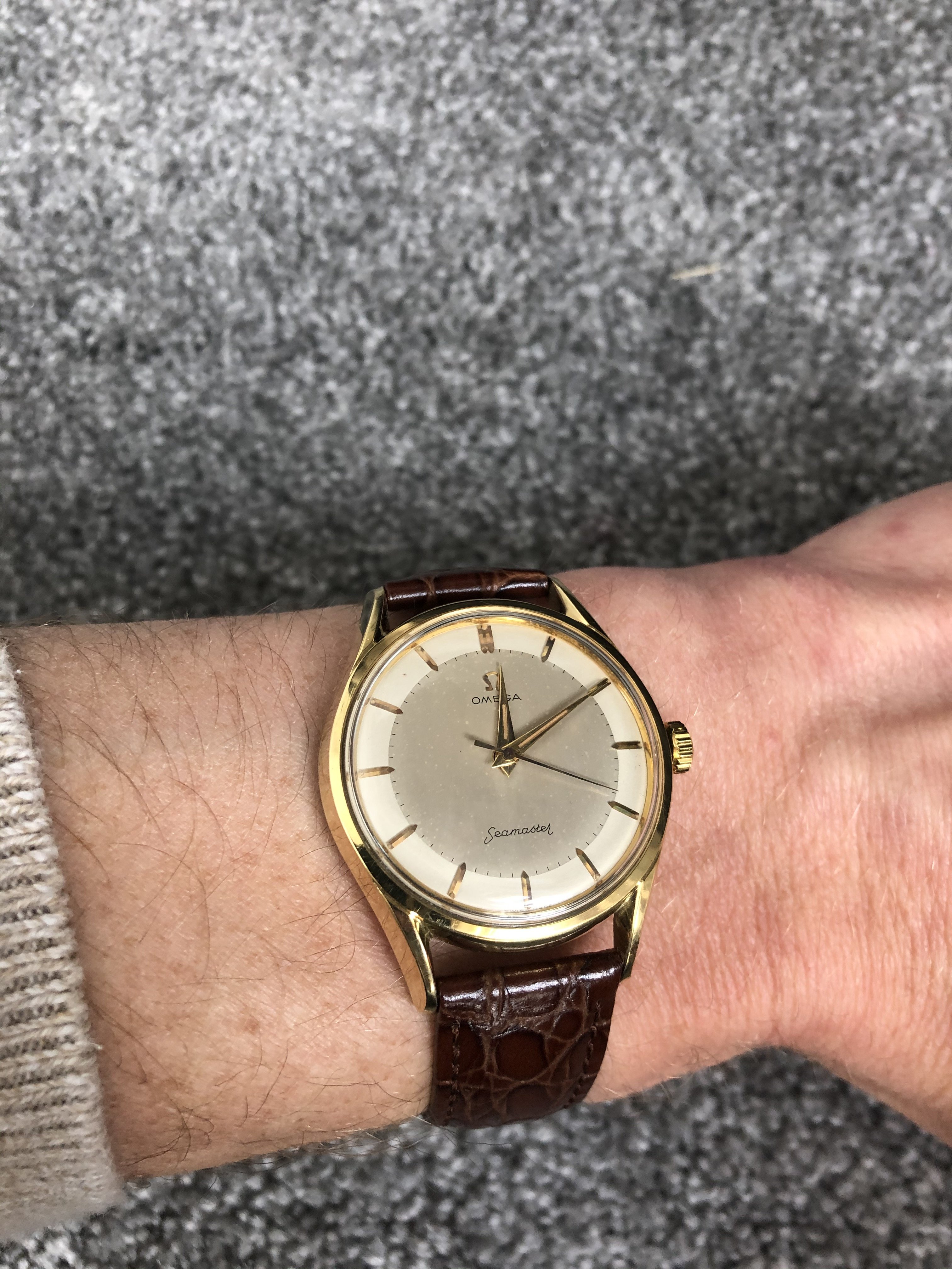 ... I want to find a watch for my husband to be proud of and this one is nearly it. I know he wants a 1950's era Omega with Dauphine hands and gold case (capped or otherwise).
