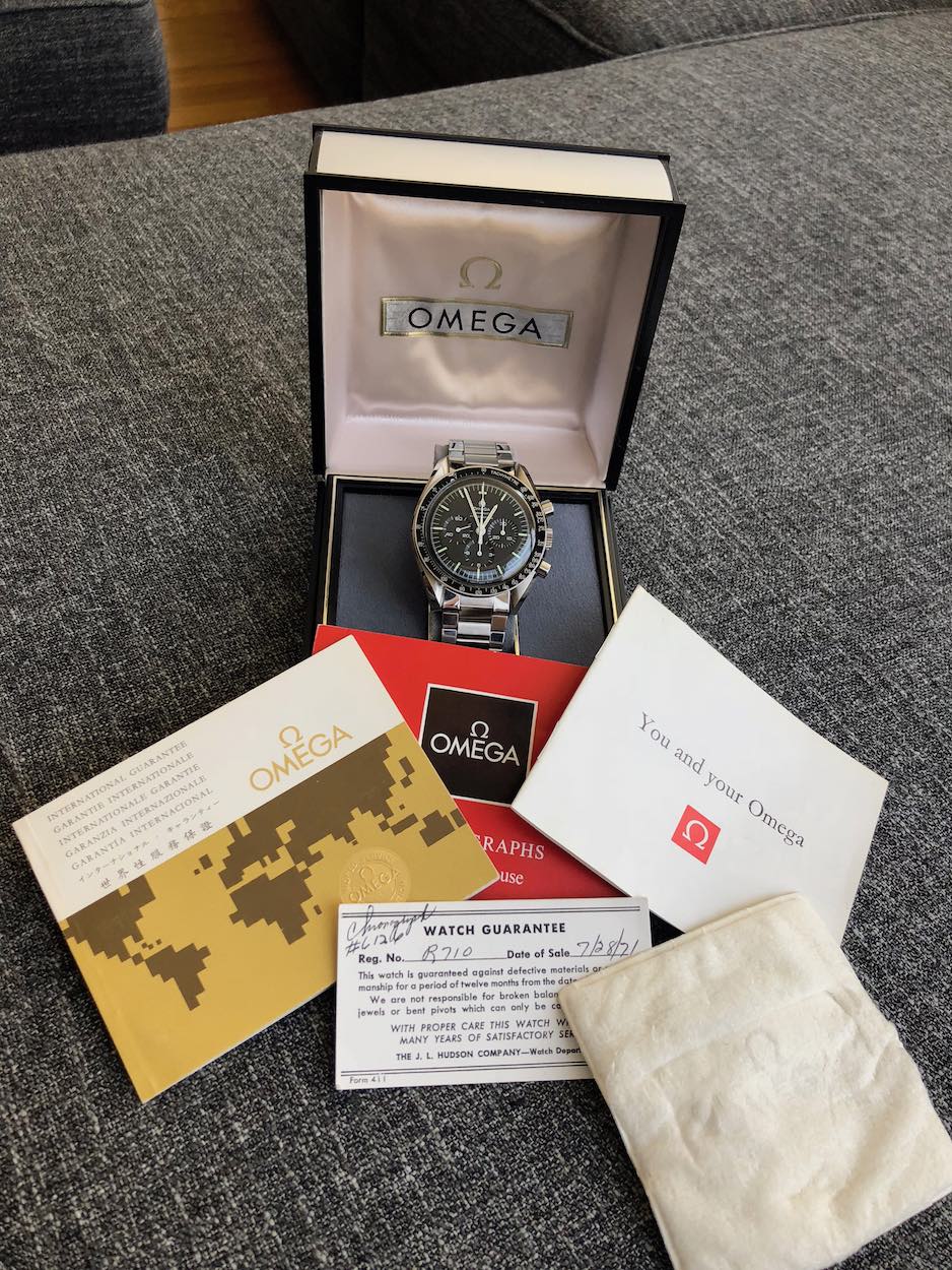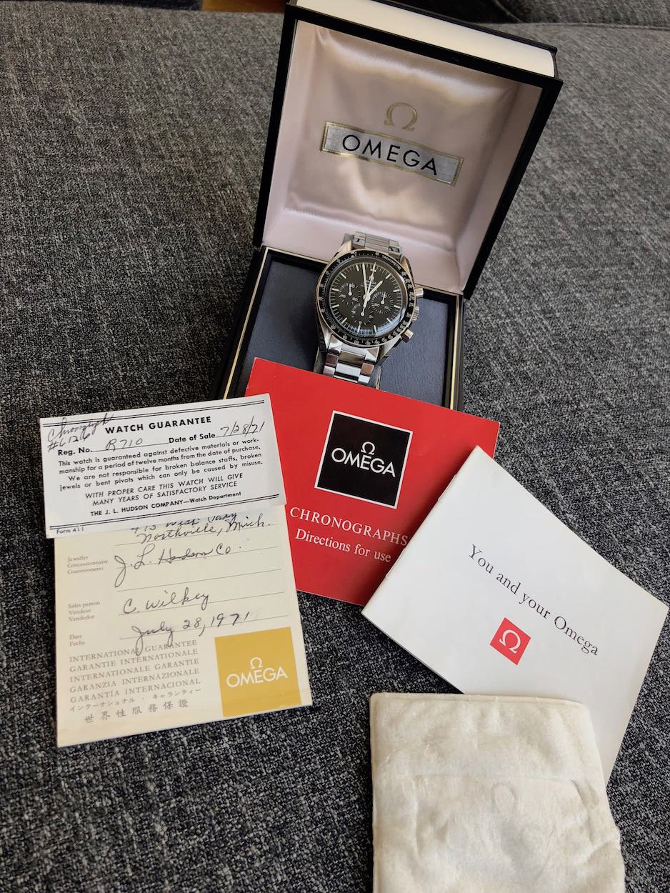 The icing was all the original paperwork, manuals and box. It was a one-owner watch that was rarely worn, and then tucked away for decades. The owner passed away and the family sold it. This Speedy was originally purchased at the watch department of the then-famous (and now-defunct) Hudson Department Store in Detroit in July 1971.