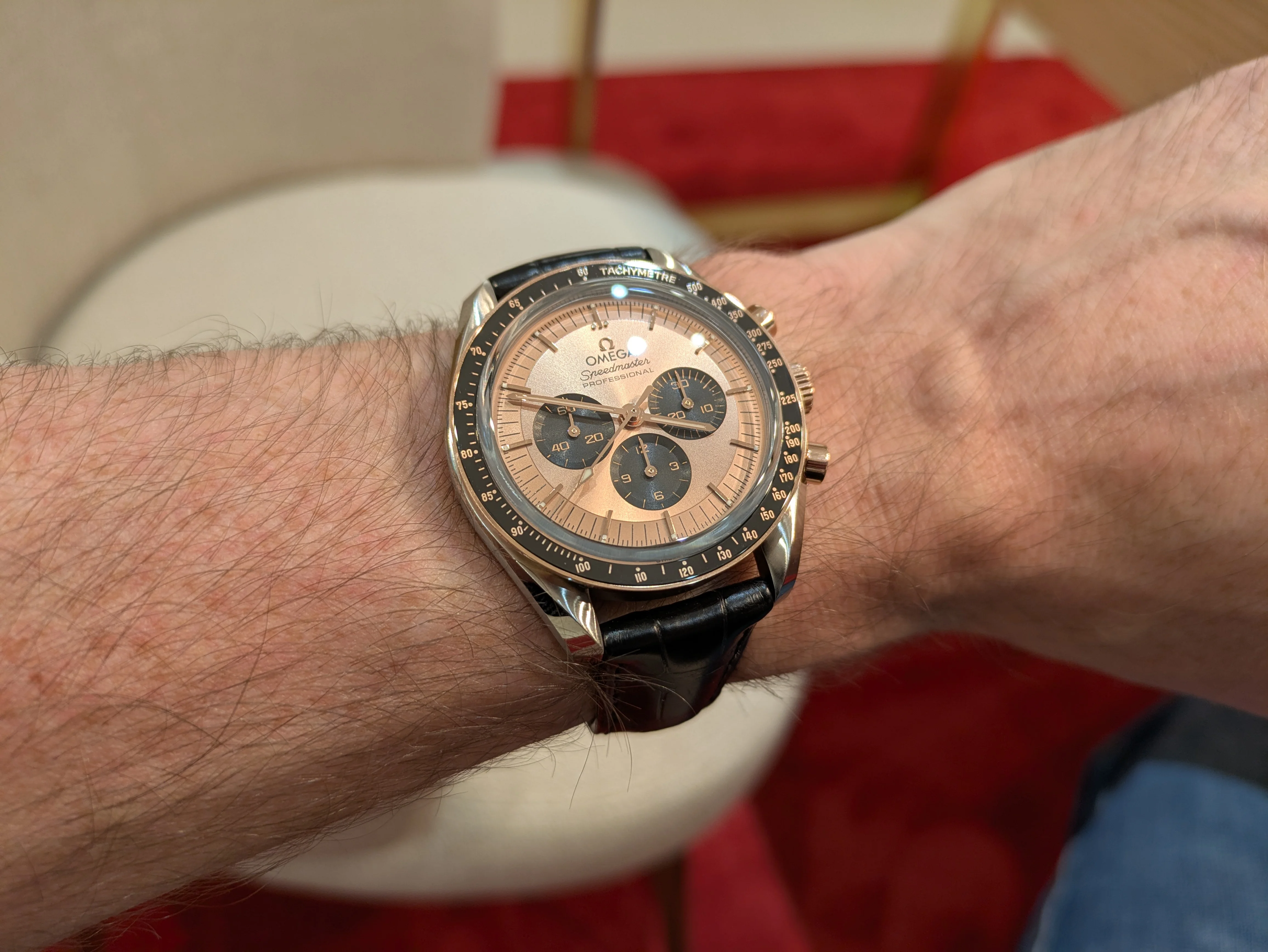 Unfortunately many people have an aversion to anything two-tone, we tend to have a herd mentality and if enough people say it's not acceptable, then it's not acceptable. People can make their own minds up. My first good watch was a 1976 Rolex DJ in steel/gold, the standard 'good' watch of the 70's, then they went out of style and I never had another two-tone watch. No animus against them but other than Rolex there weren't many of them made. Now there are a few entering the catalogues again. When Omega introduced the Sedna and Moonshine editions last year I immediately liked the Sedna version better than the silver dialled Moonshine version. Last August I was stumbling around Chrono24 and a BNIB Sedna/steel one popped up for a price that didn't seem right, just too low. So I sent a note to the US seller to confirm the price and he came back knocking another $500 off without asking. I'm in. Got the watch in a couple of days, completely new, all cards, watch sold through an AD just a month before. I like it, the pink dial, the pink bezel and pink numbered ceramic insert, and the pink bracelet. It has a bit of a vintage feel to it. I don't wear it enough, so I strapped it on today for the first time in months.