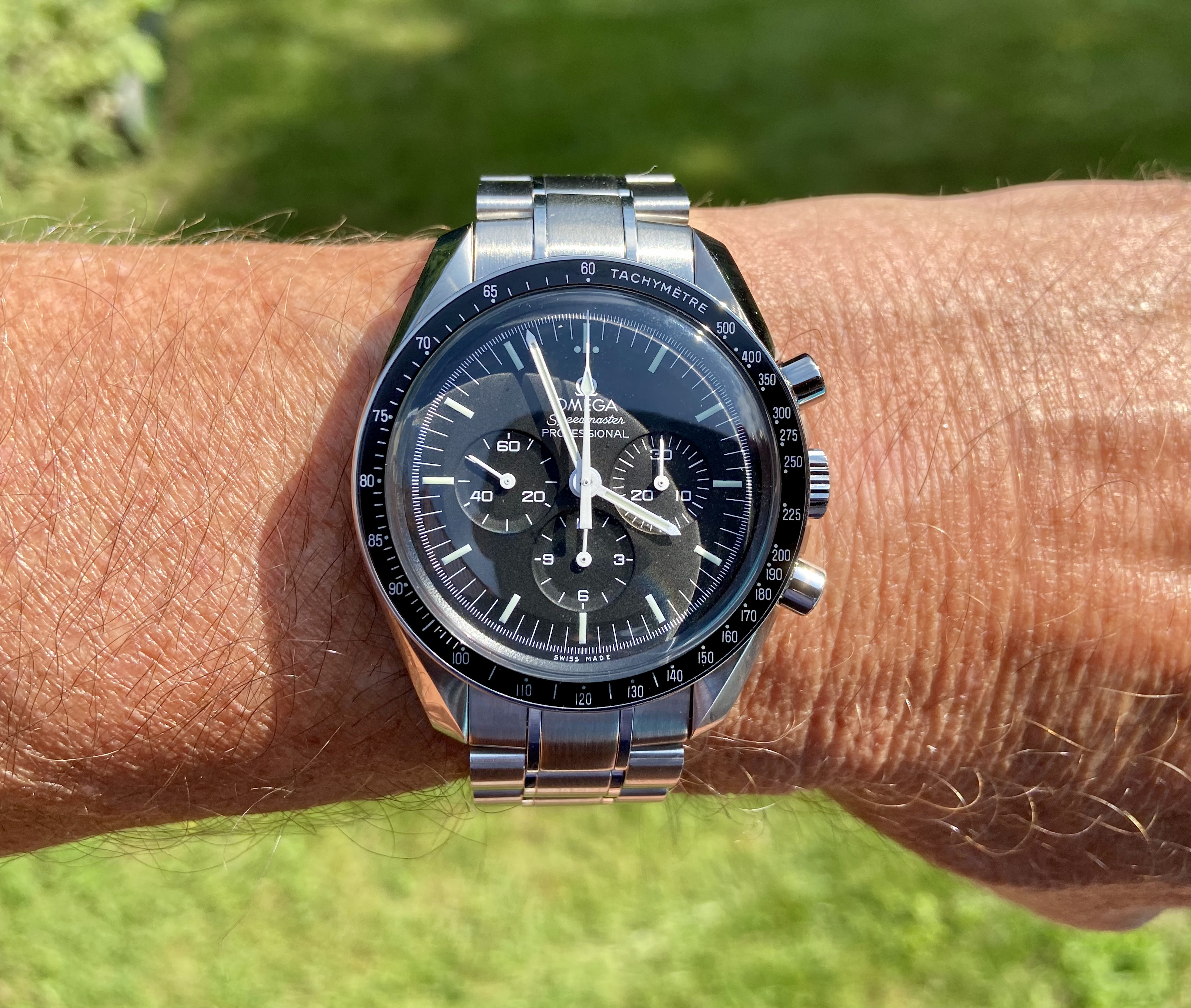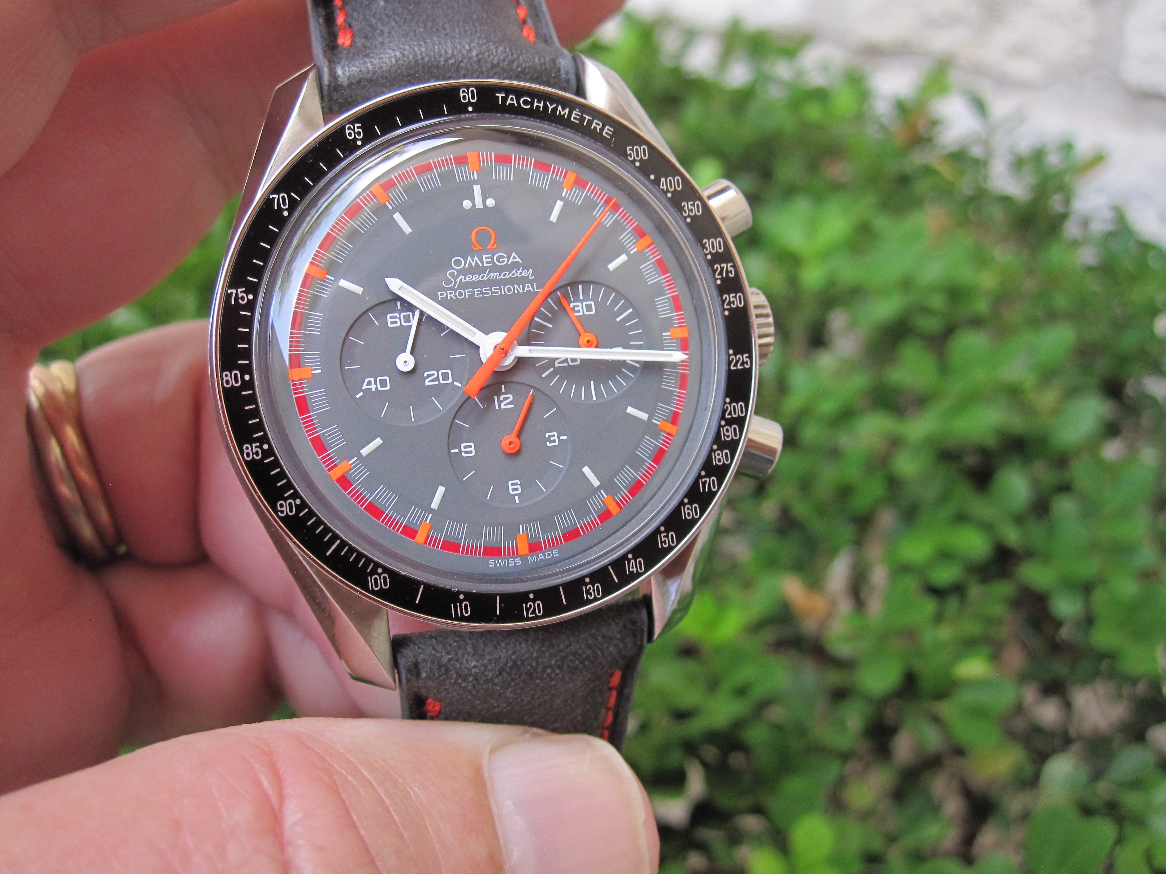 I'm not a great fan of steel bracelets on most Speedmasters so I ordered a Genteel charcoal Maya leather strap with orange stitching fitted to a 16mm Omega deployant clasp. It all ties together, imo, and presents a very sporty appearance.
