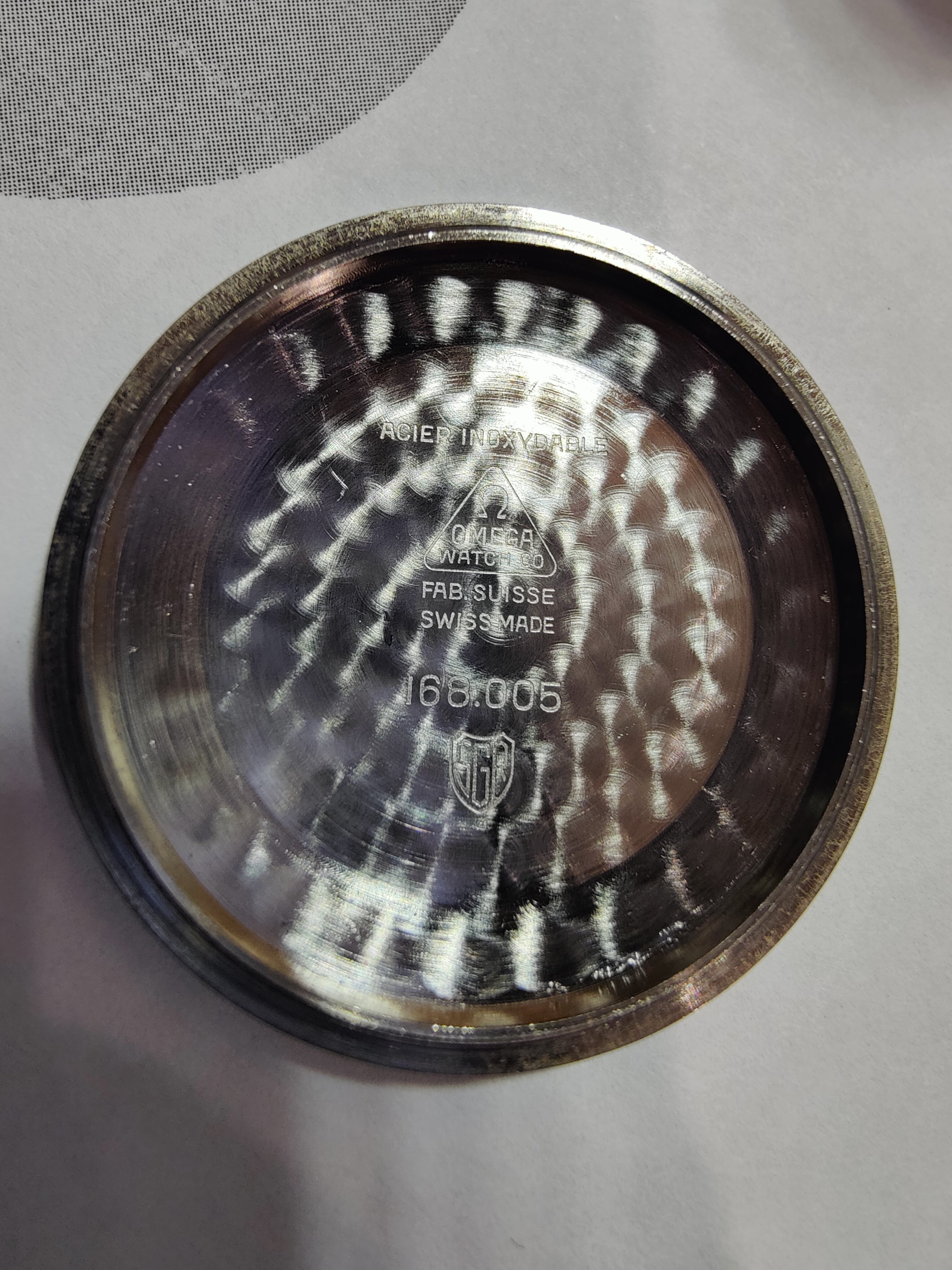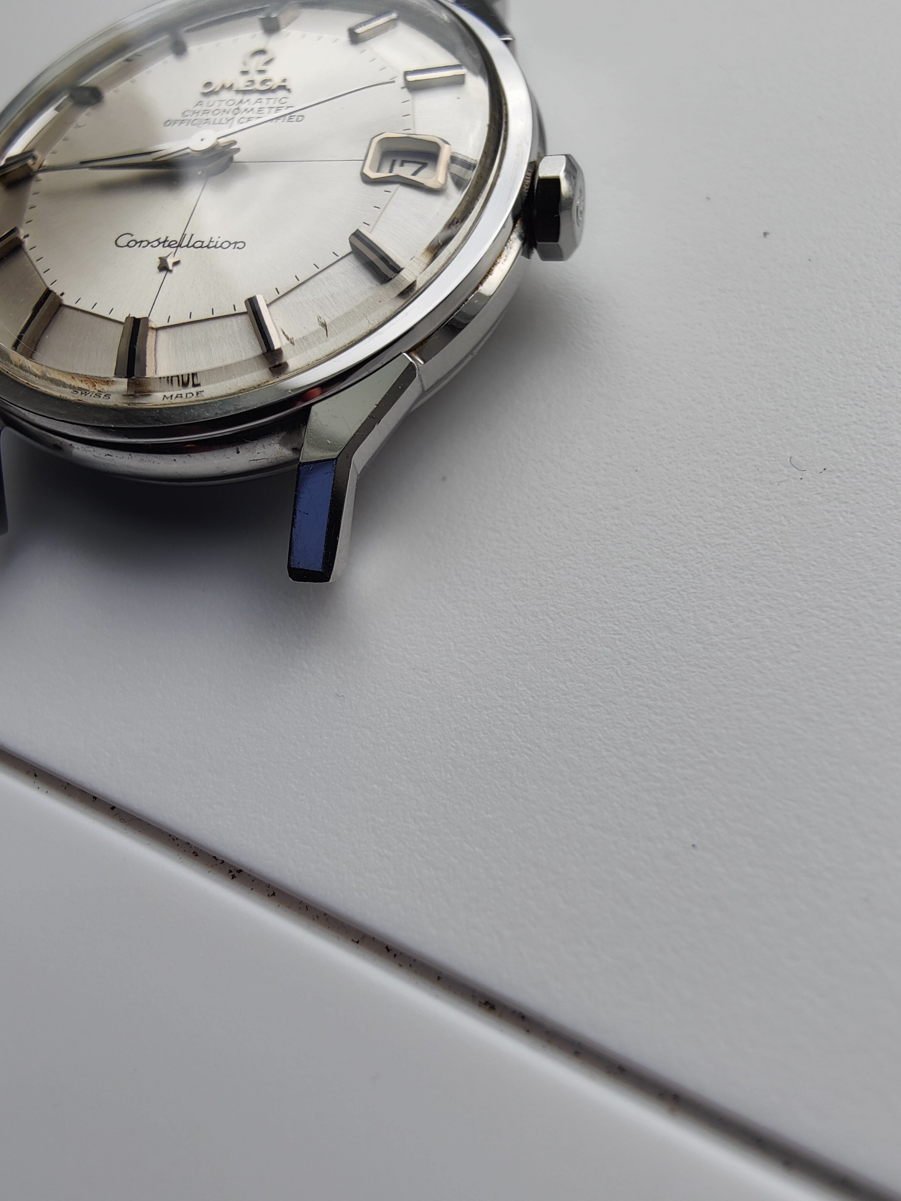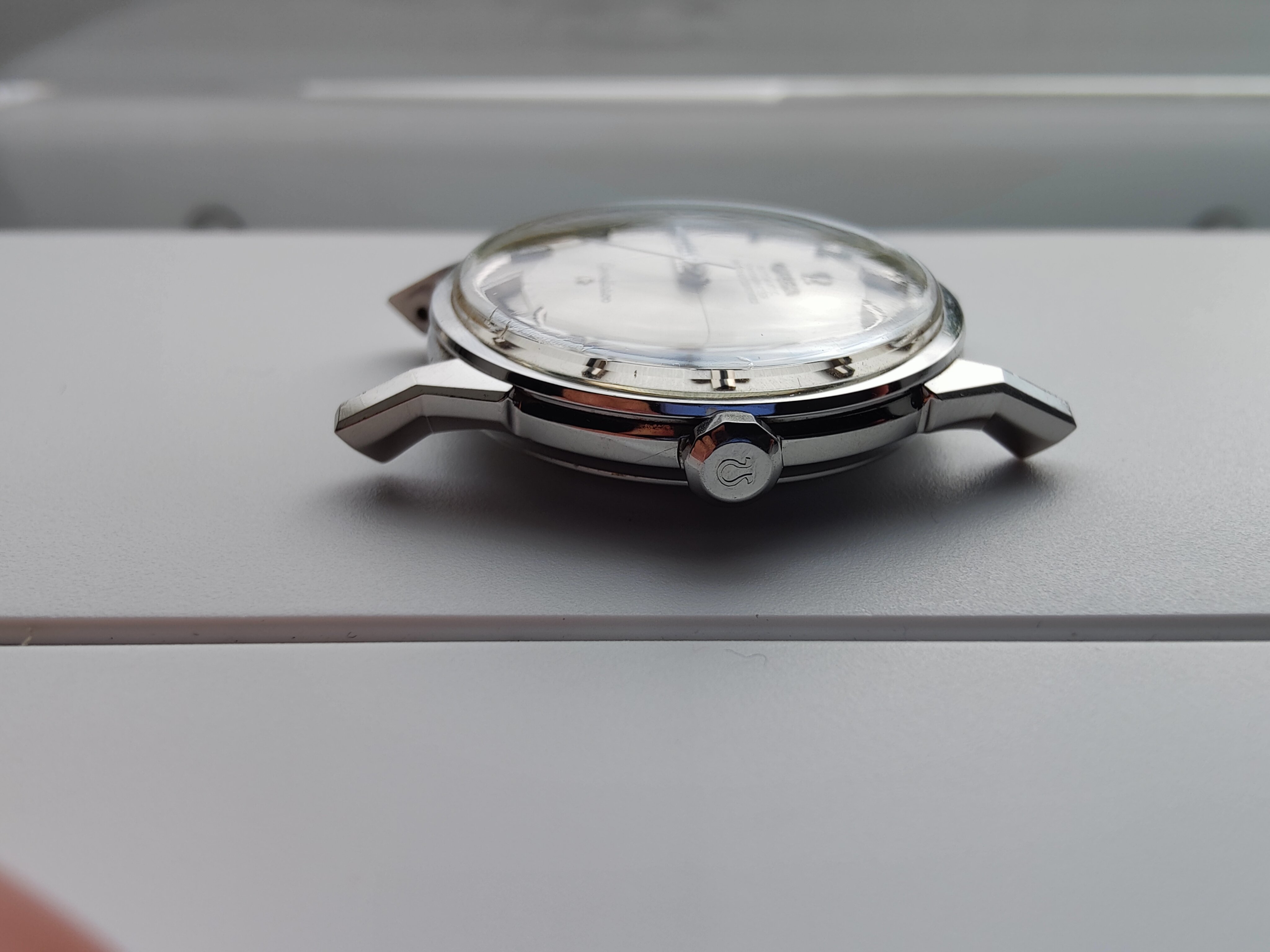 Crystal: Crystal has the Omega logo in the center. There is a small gouge around the 6 and 7 o'clock position.