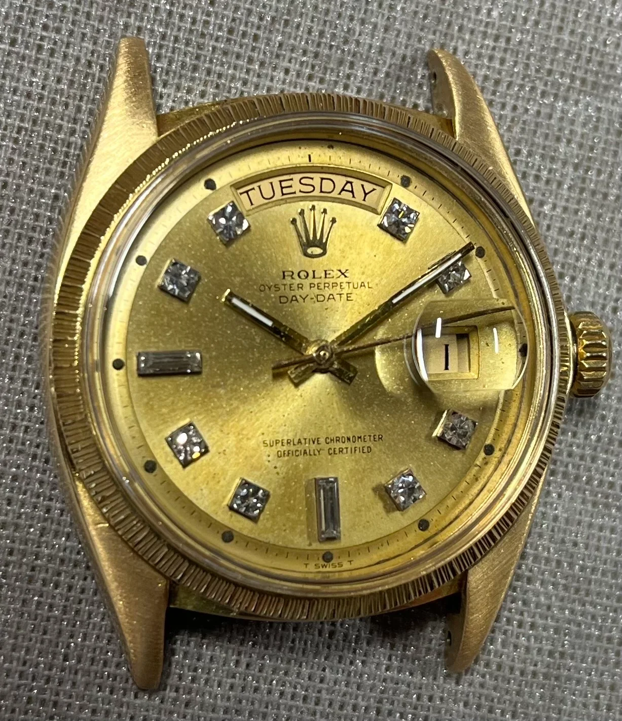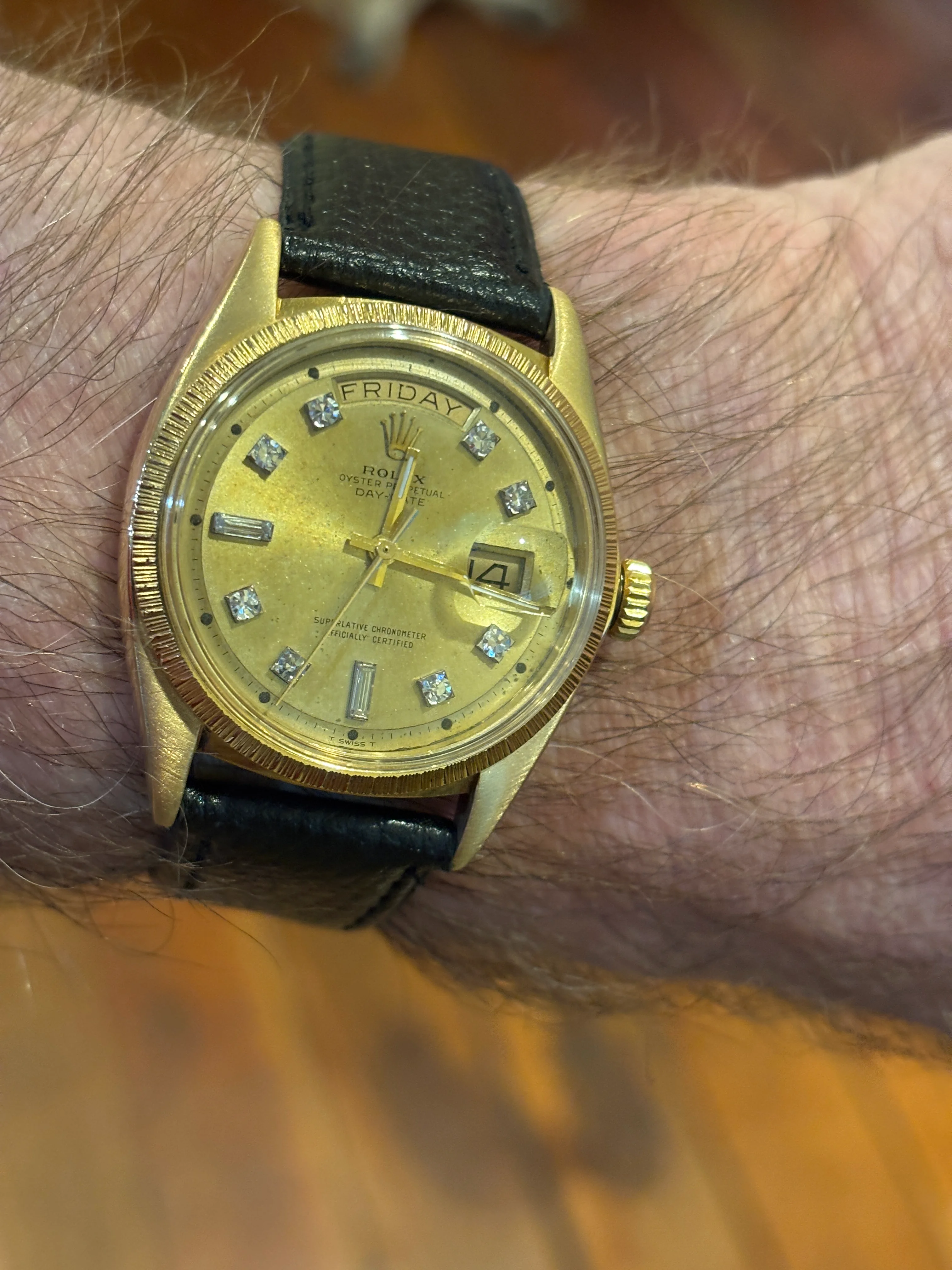 ·1556 Diamond Dial, bark bezel, serial number dates to 1973. I sent it off to my watchmaker for service. He responded that the service was complete with a new mainspring but the date mechanism was balky. He wound up getting a NOS date wheel that fixed the issue. New gaskets, replacement crystal and out it shipped. I received it midday Friday. I put a strap on it and set it to my time source. Saturday morning I was impressed enough with the timekeeping to wear it for a while (it's going to my son Thanksgiving) and record some timing. Here's what I've recorded so far: