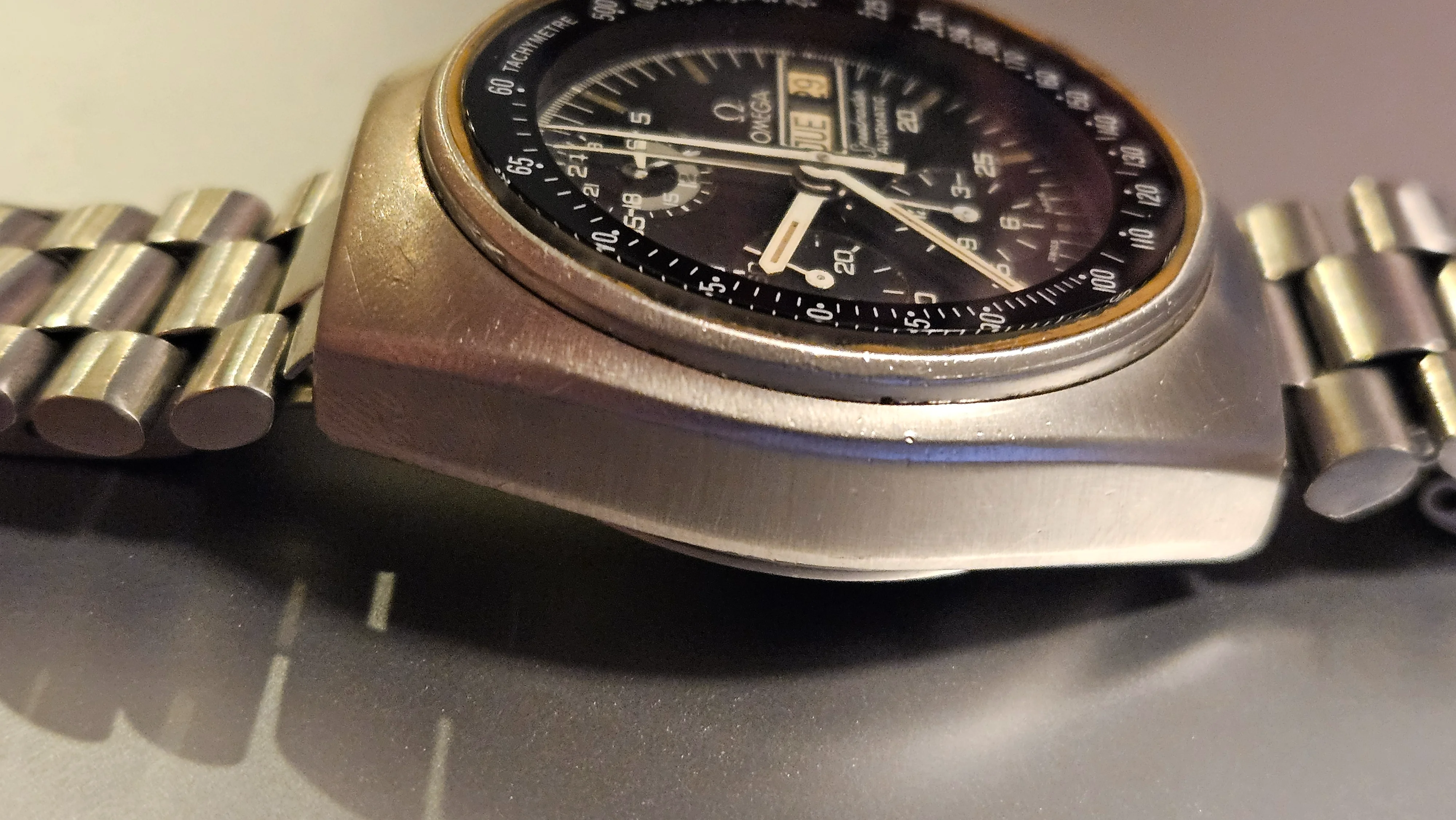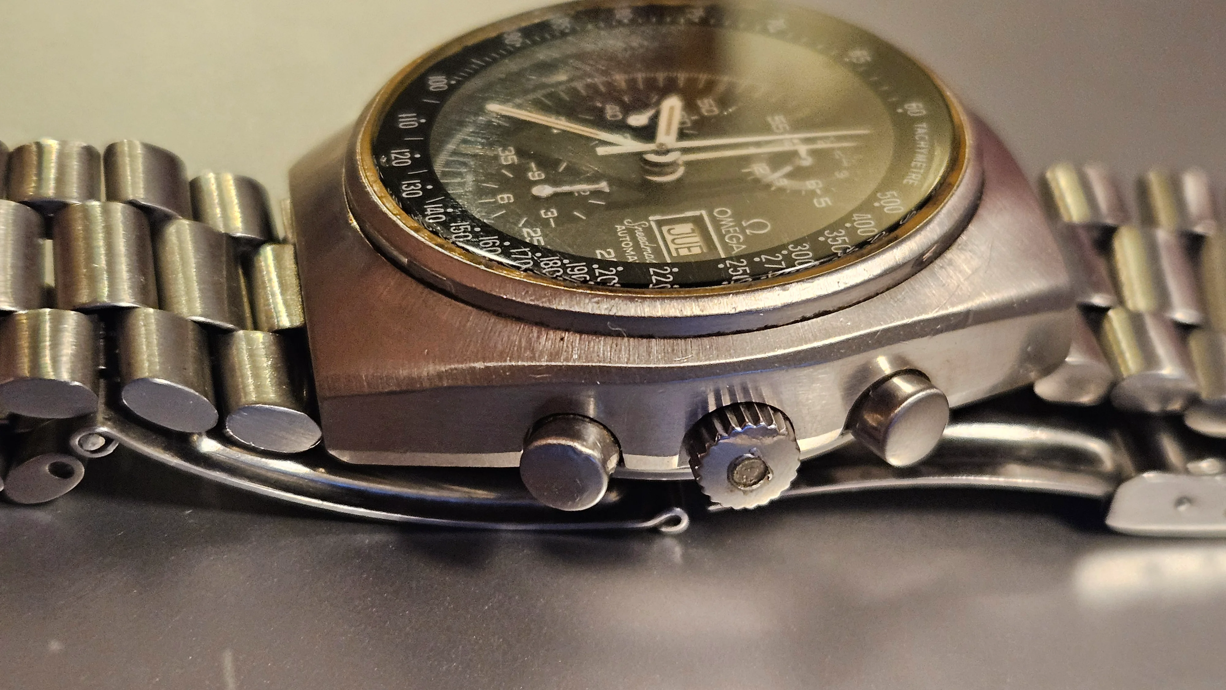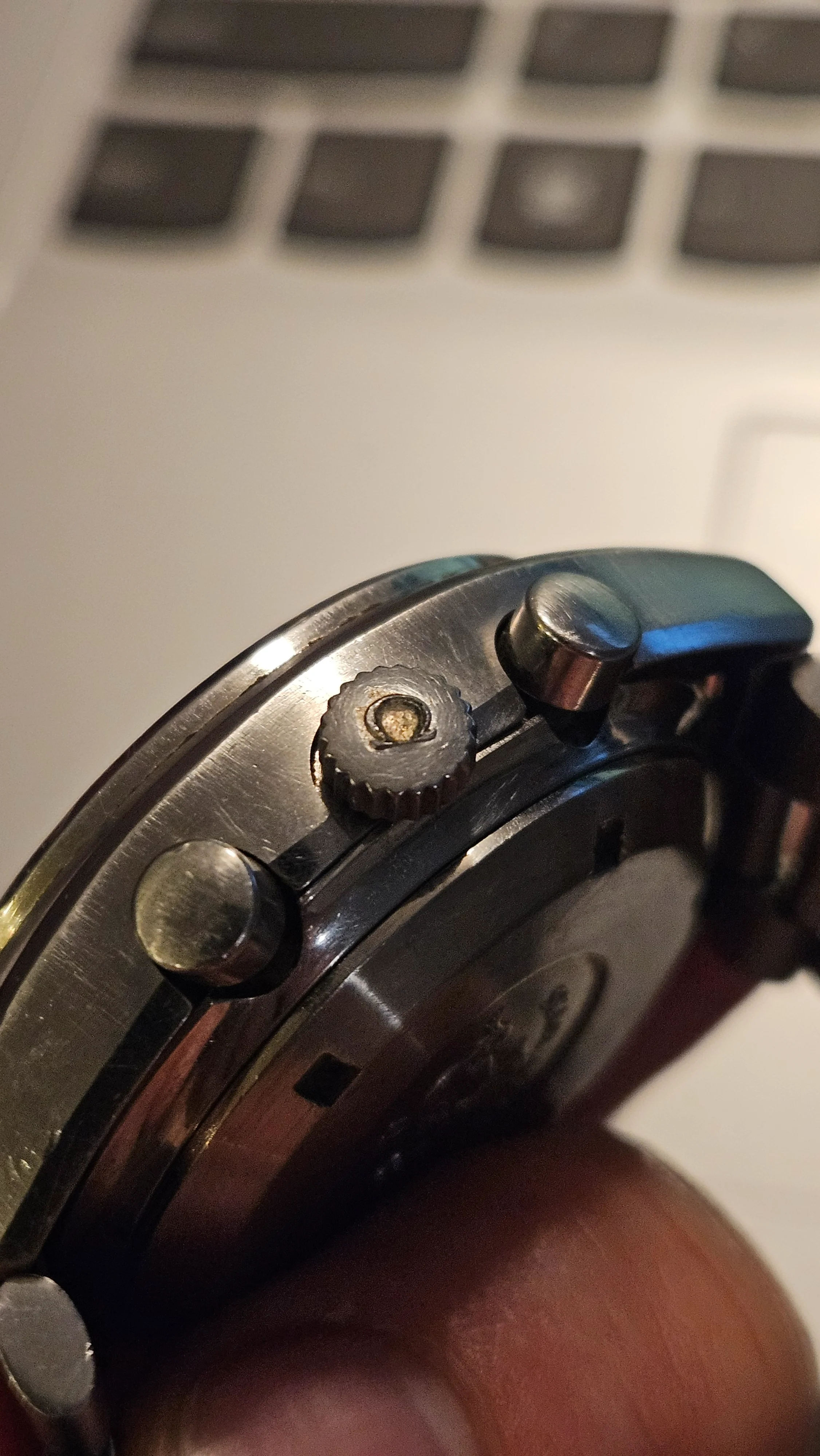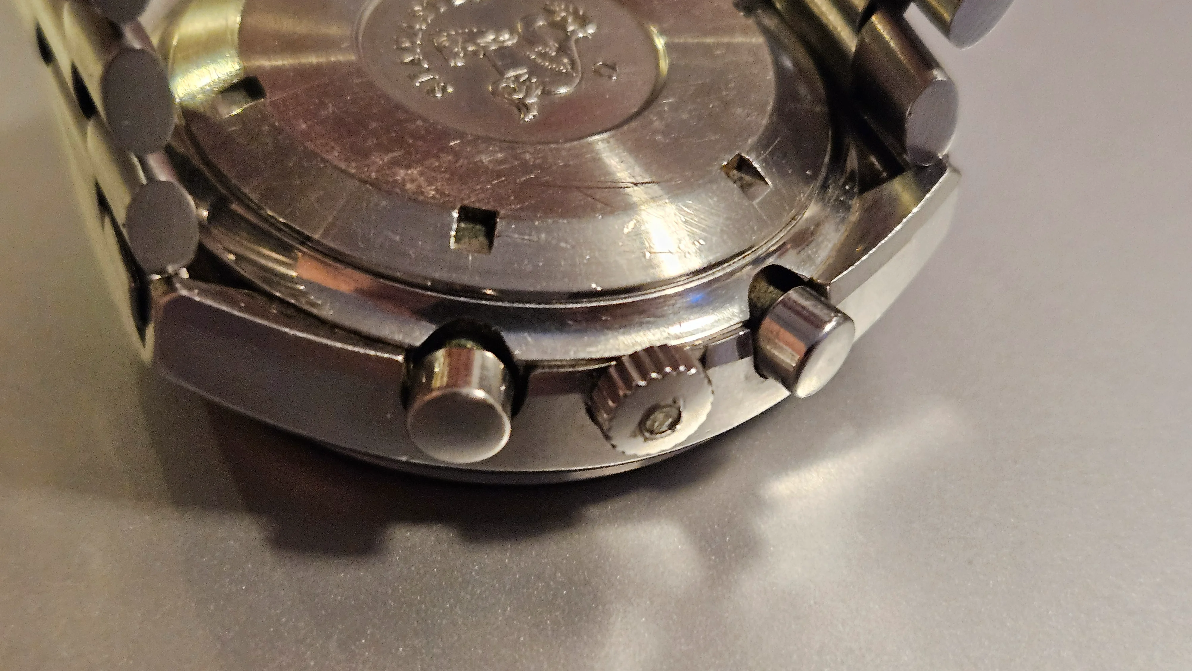 It runs great, winds and sets time/dates smoothly. Small scratches all around, slightly rounded edges of the case, few service marks on the case back.