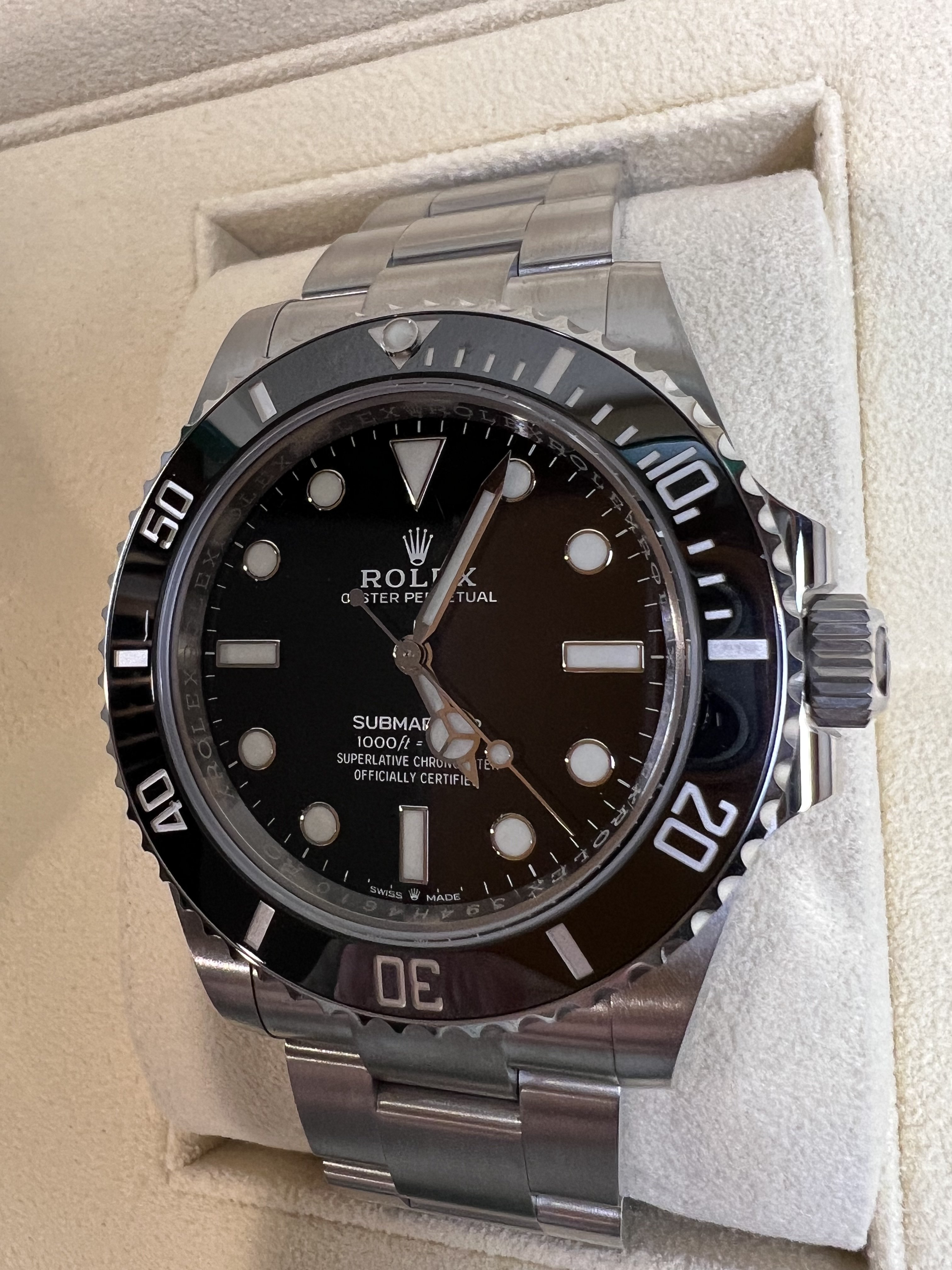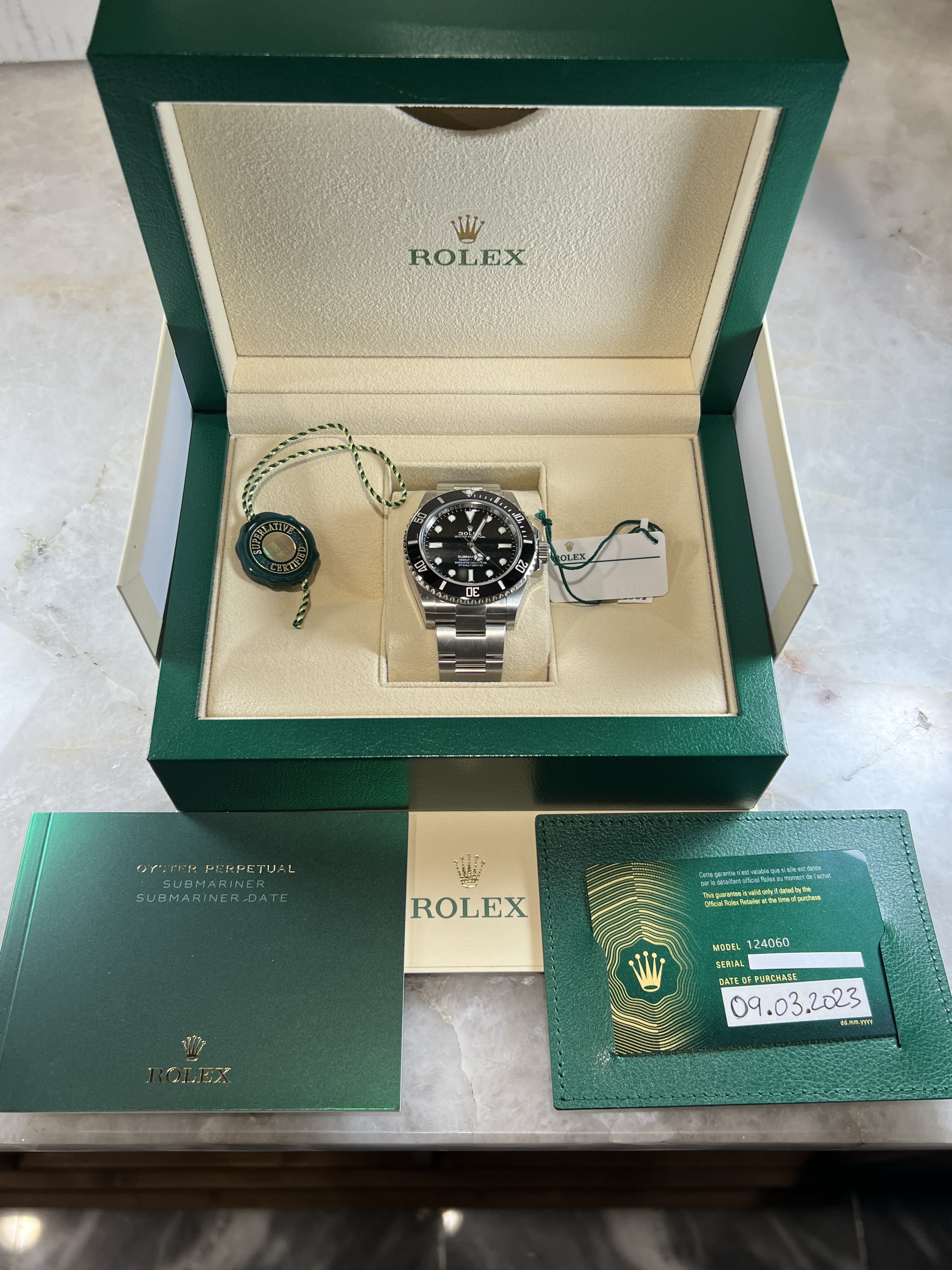 路For sale is a new, unworn, and unsized 2023 Rolex Submariner (No Date), model 124060, with full set.
