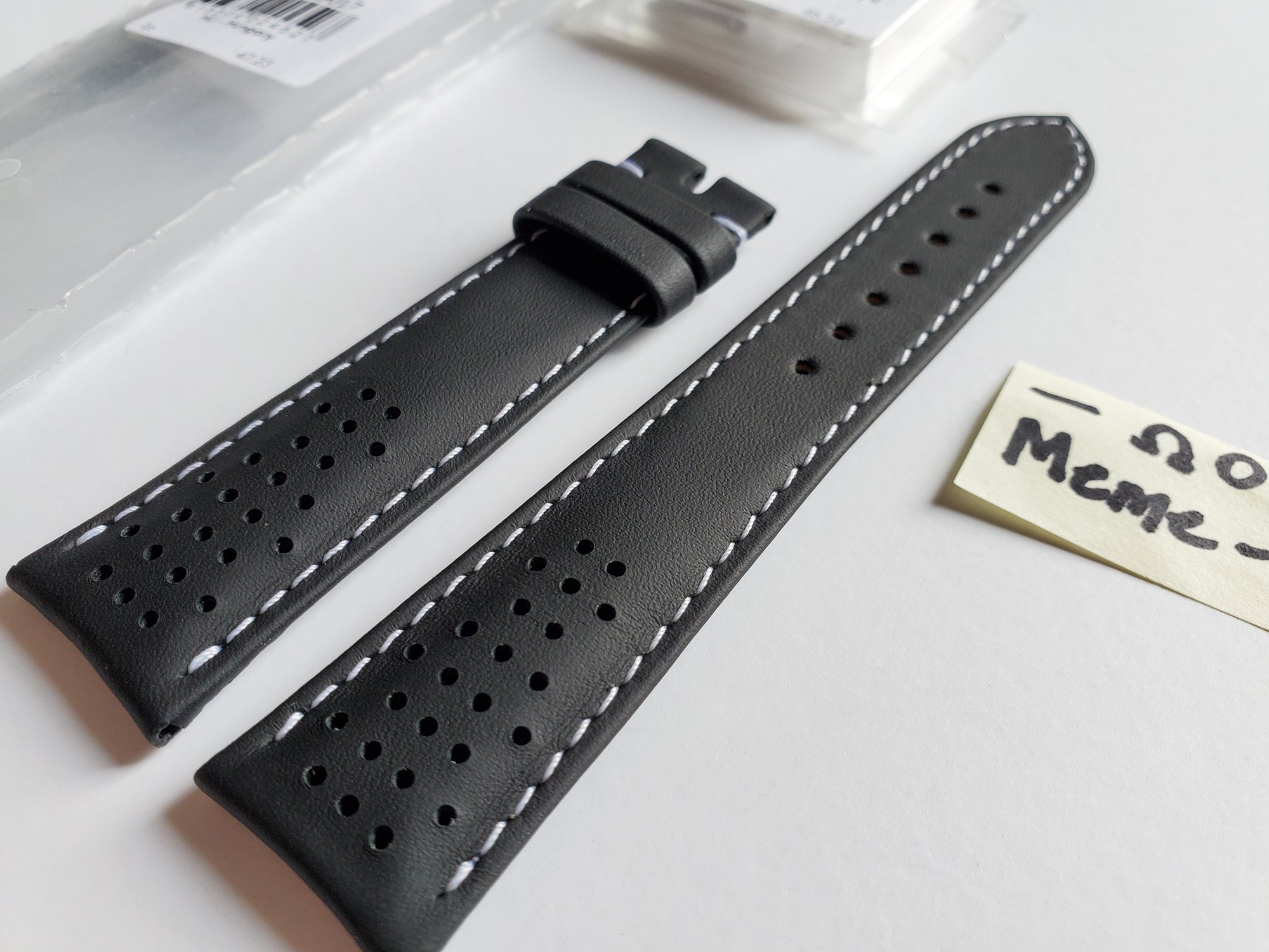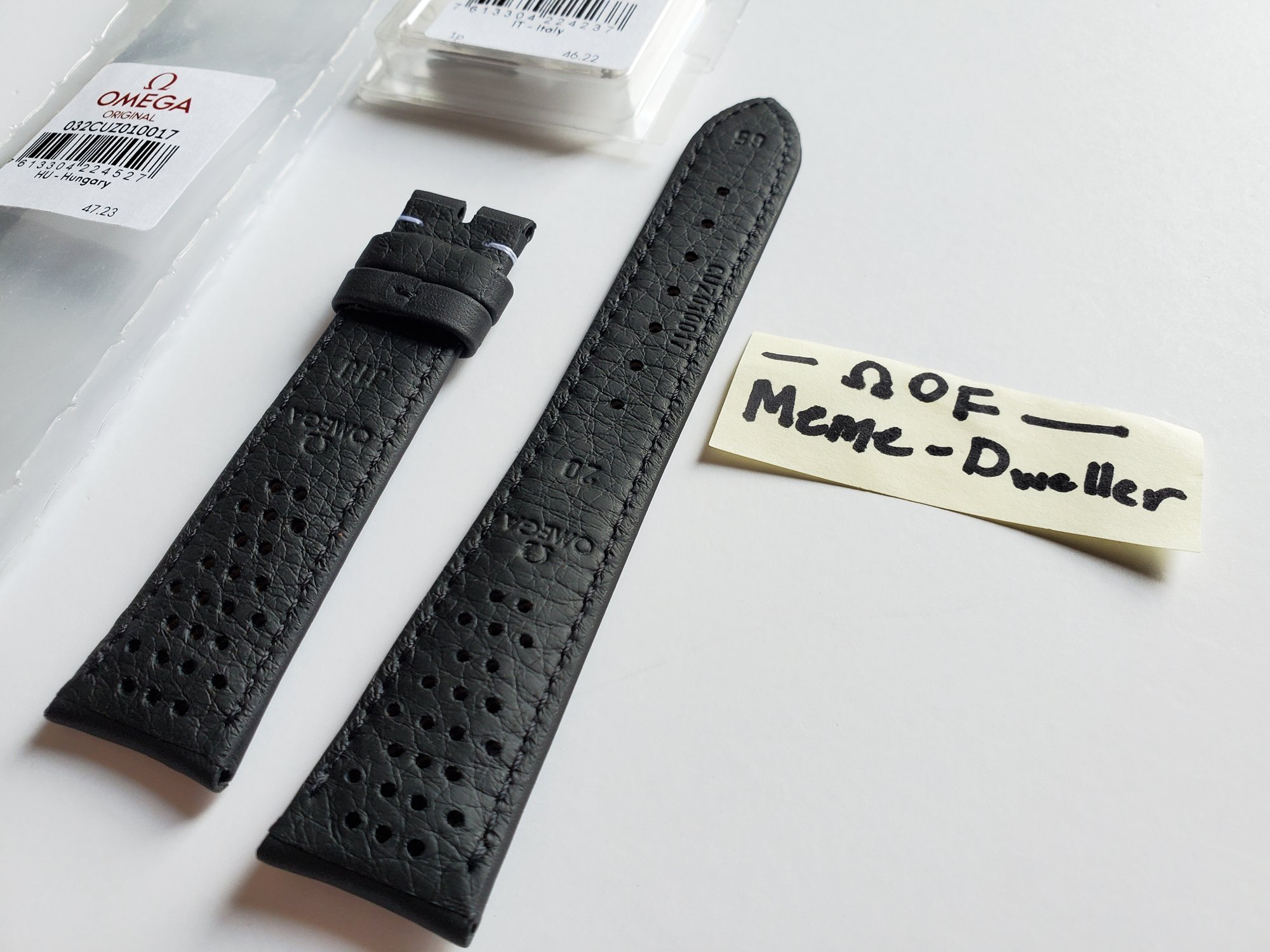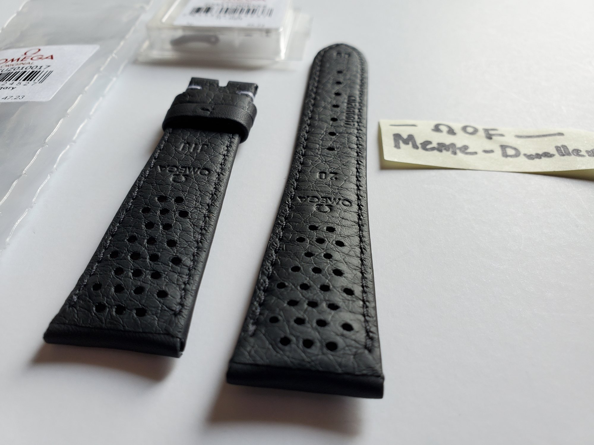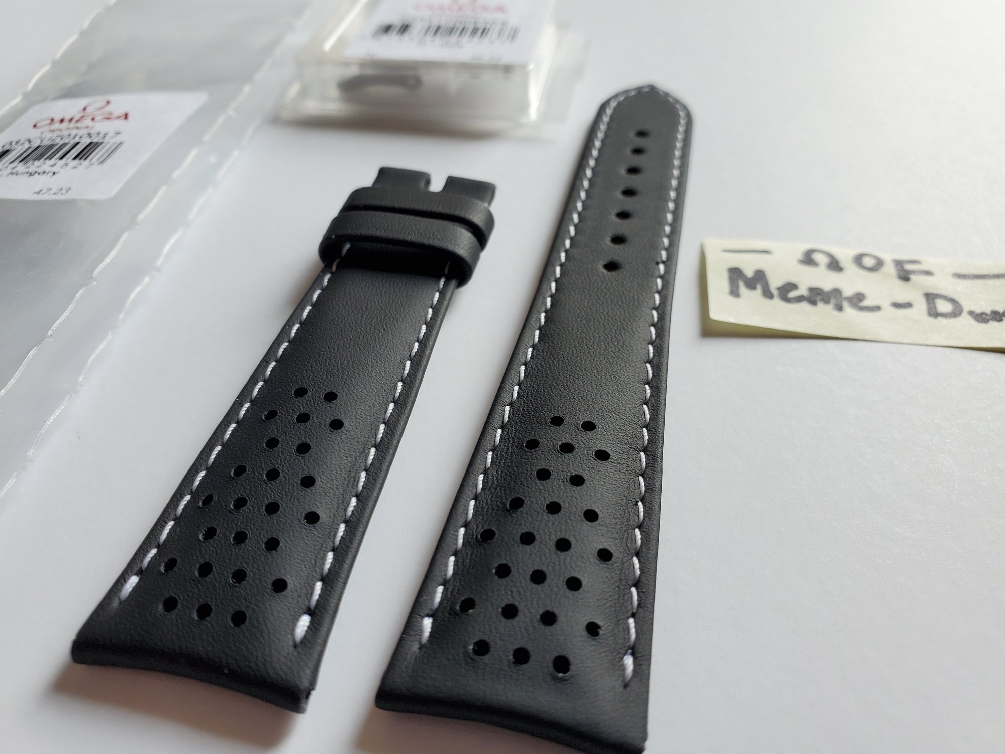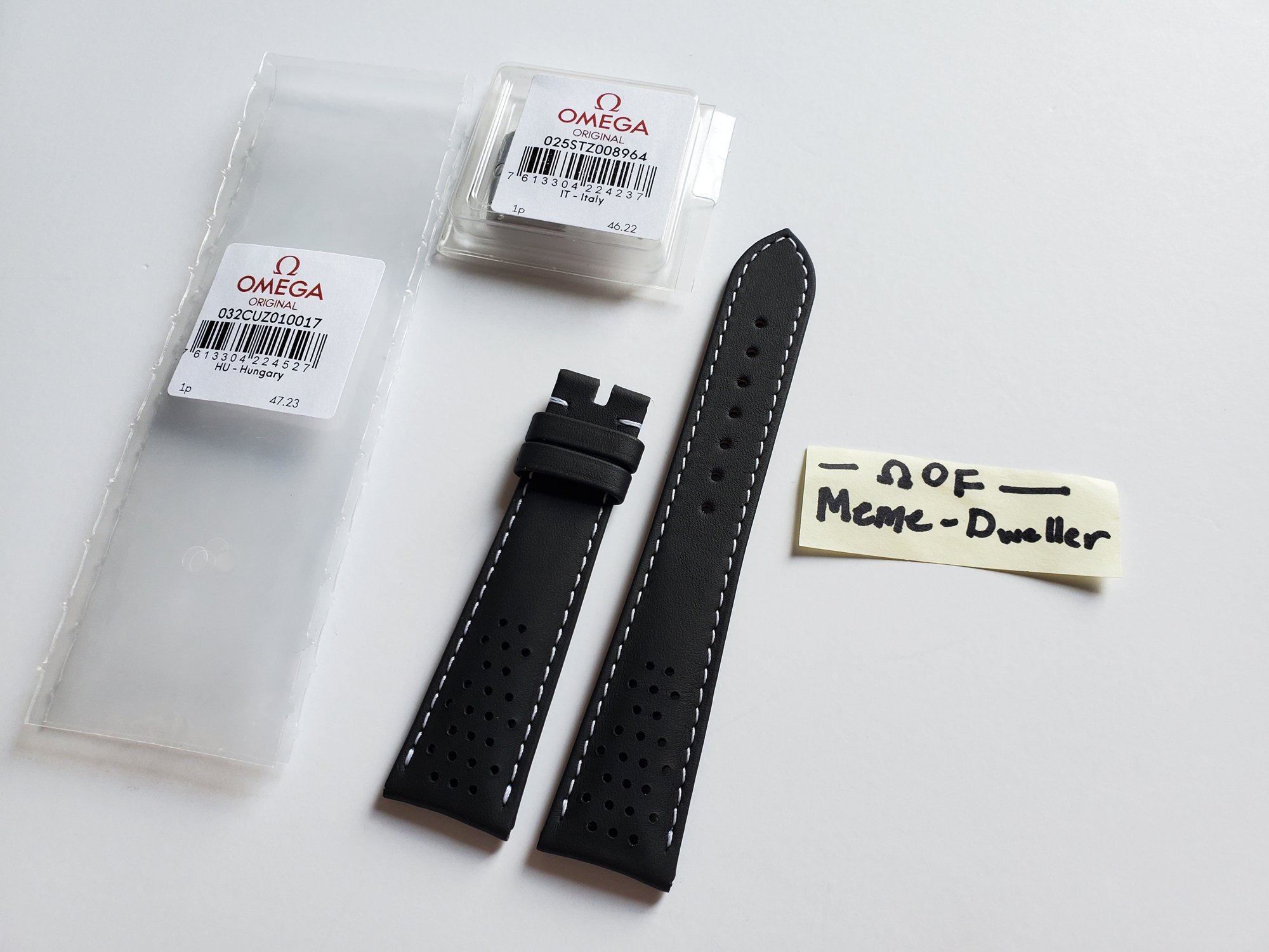 Up for sale is a brand new genuine Omega black rally style leather strap with white stitching including a genuine Omega polished stainless steel buckle. It's 20mm wide at the lugs and tapers to 16mm at the buckle.