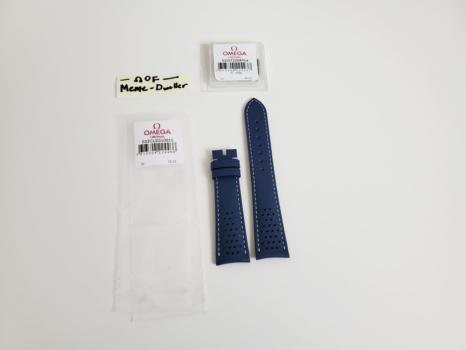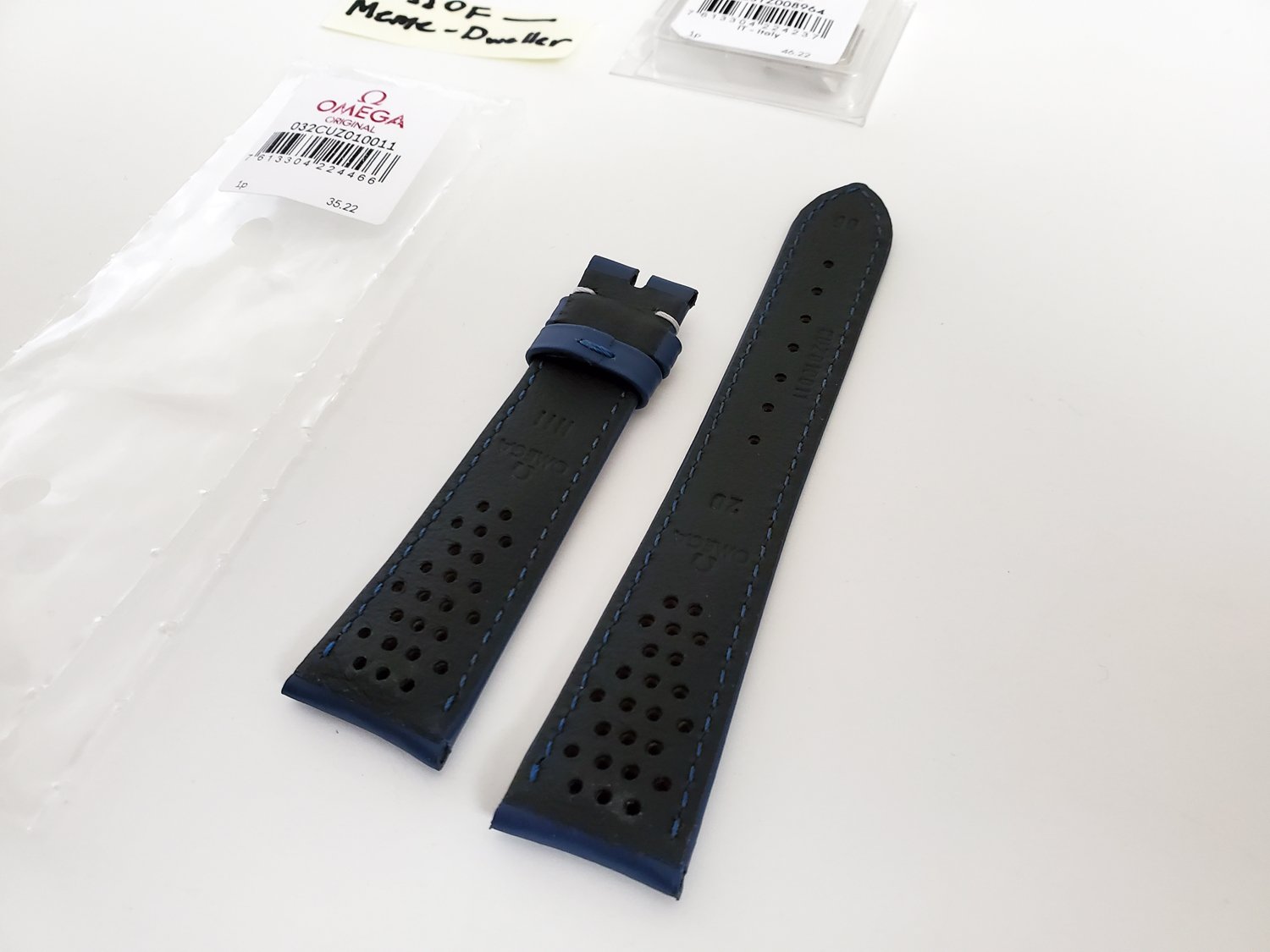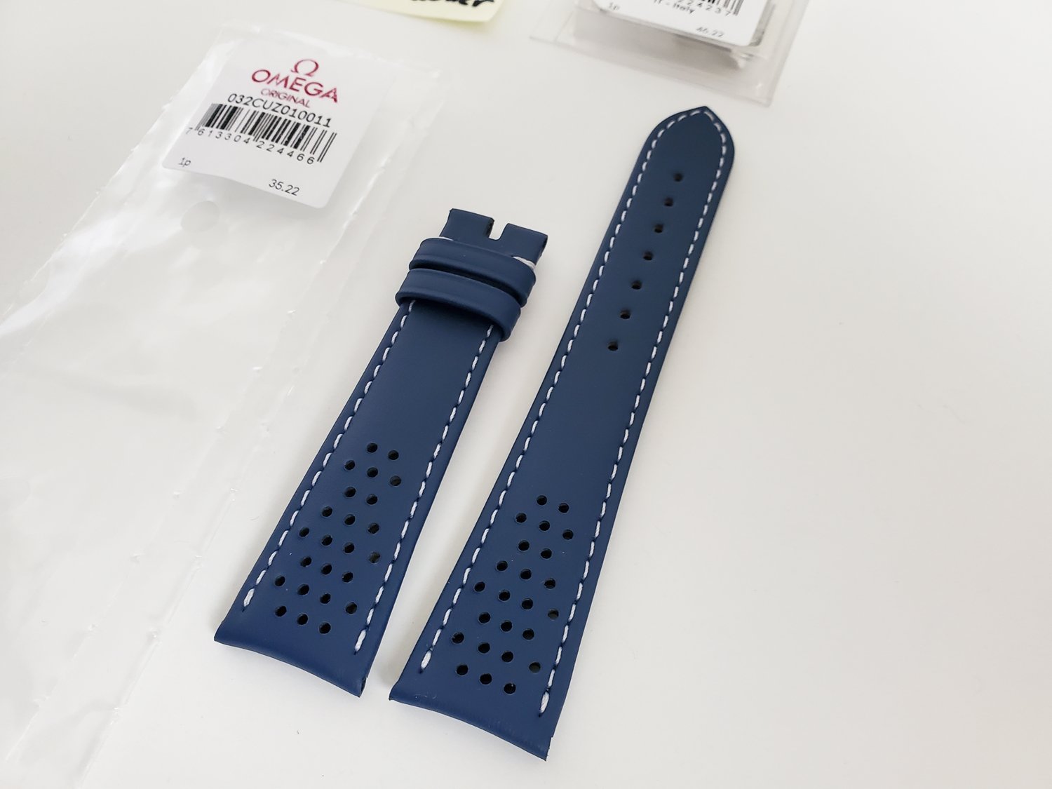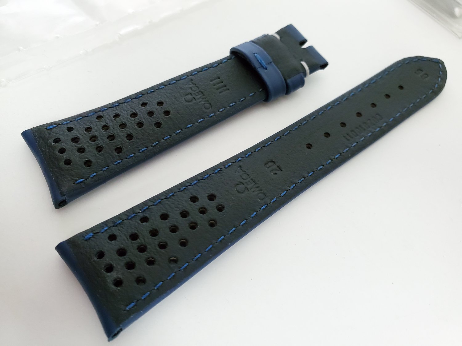 Up for sale is a brand new genuine Omega navy blue leather strap including a genuine Omega polished stainless steel buckle. It's 20mm wide at the lugs and tapers to 16mm at the buckle.