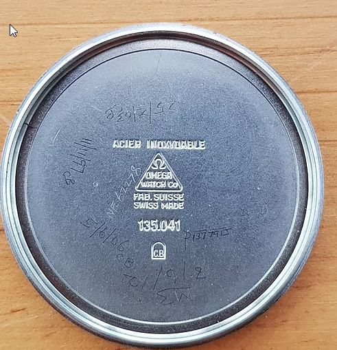 The case has been polished and has only very minor dents and scratches. The screw-fit case back has a few marks where it has been opened. Inside the case-back, it is fully marked Omega.