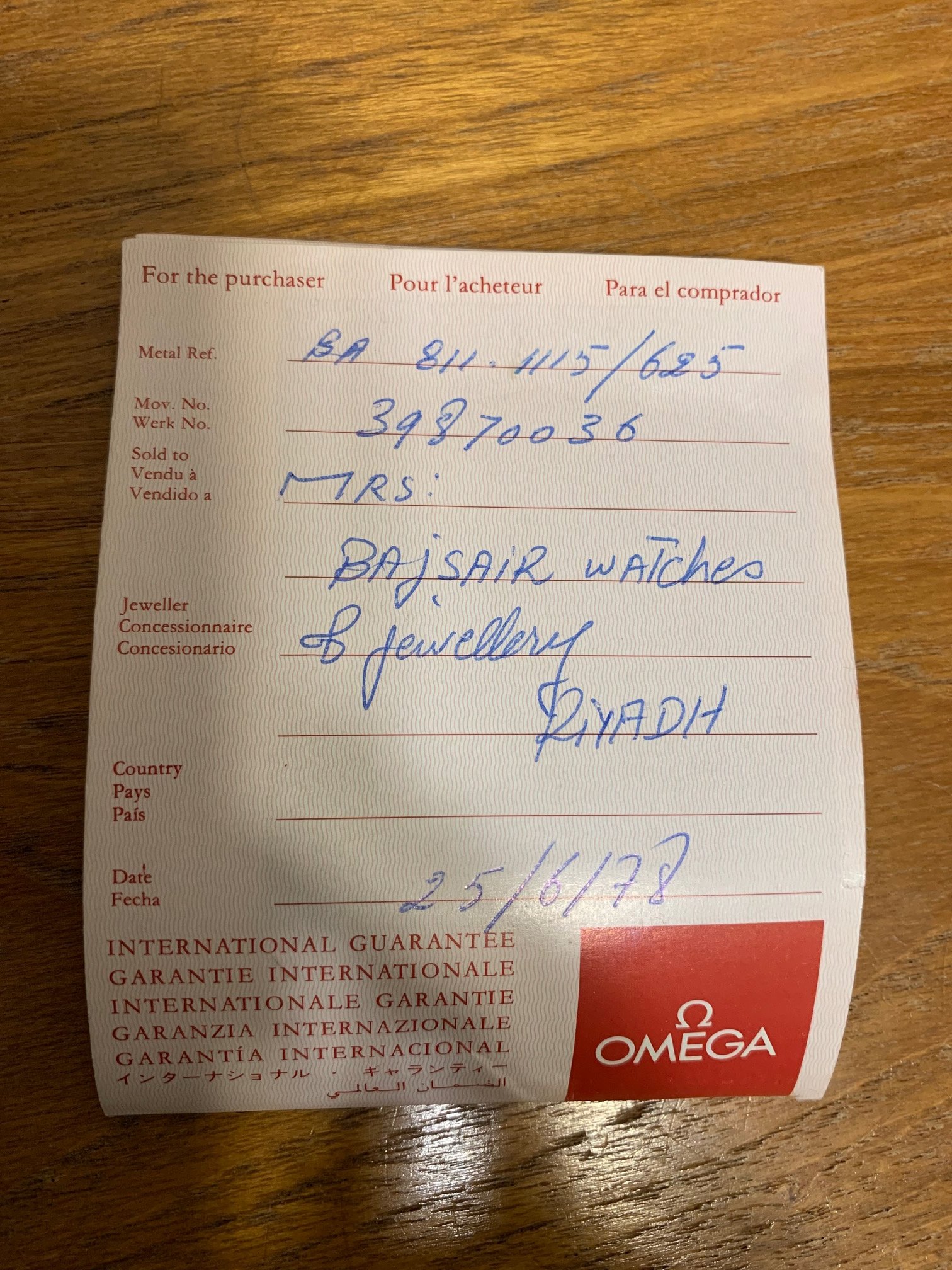 My wife has an older Omega De Ville watch that was given to her many years ago, and we're trying to find information about it, but I've been having trouble doing that. I've looked through a number of online Omega catalogs from the 1970s but have been unable to find this exact watch. I've attached pictures. Here is what info I have so far, from a "For the Purchaser" form that was in the case with the watch:
