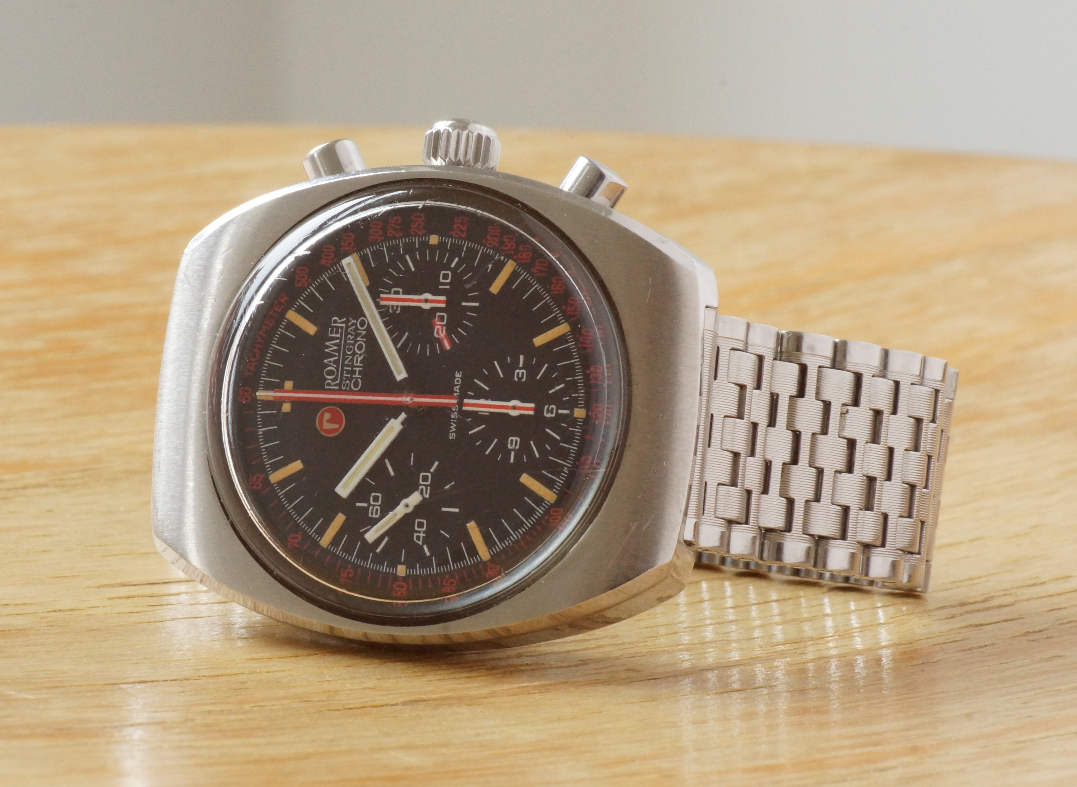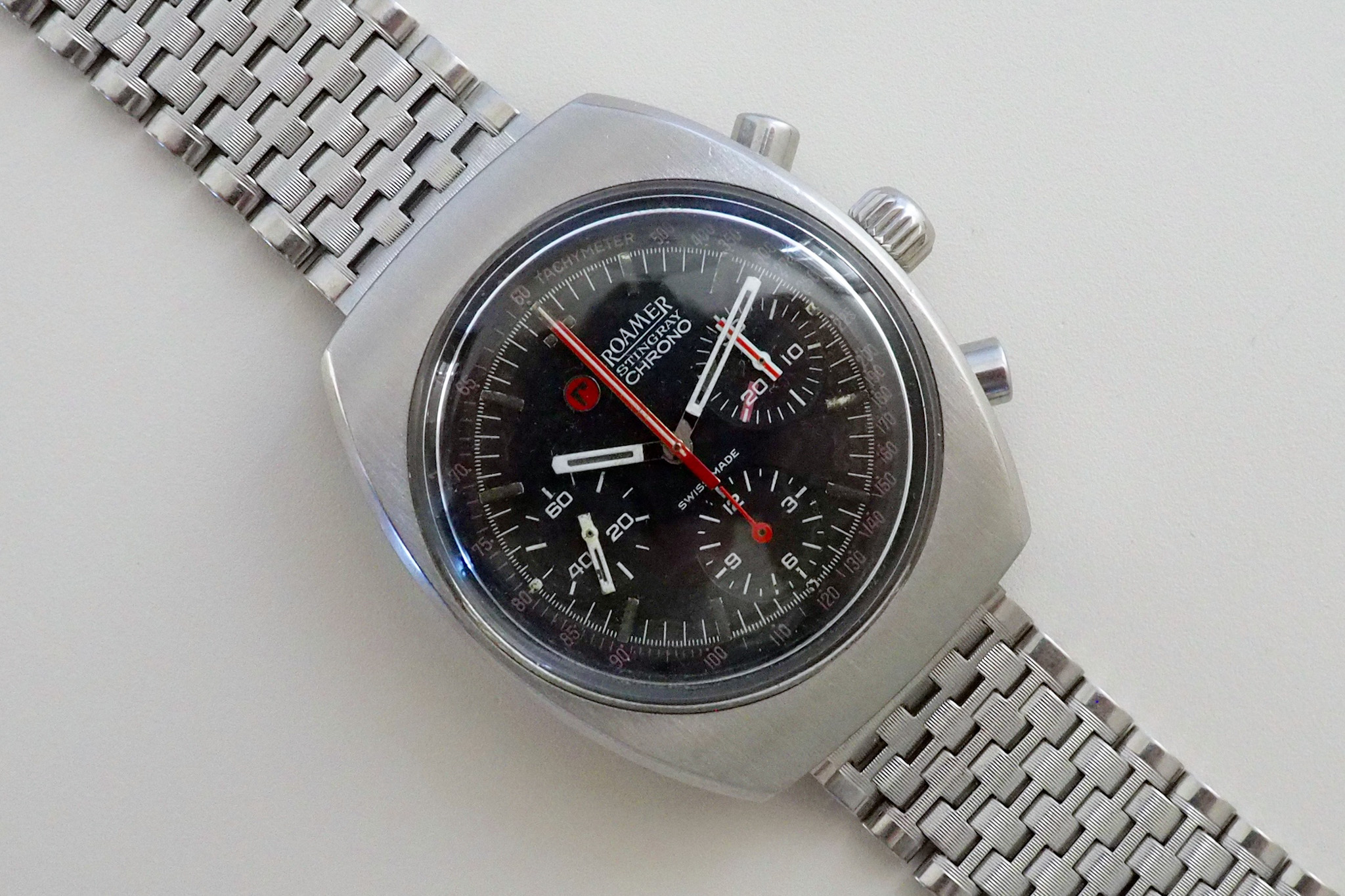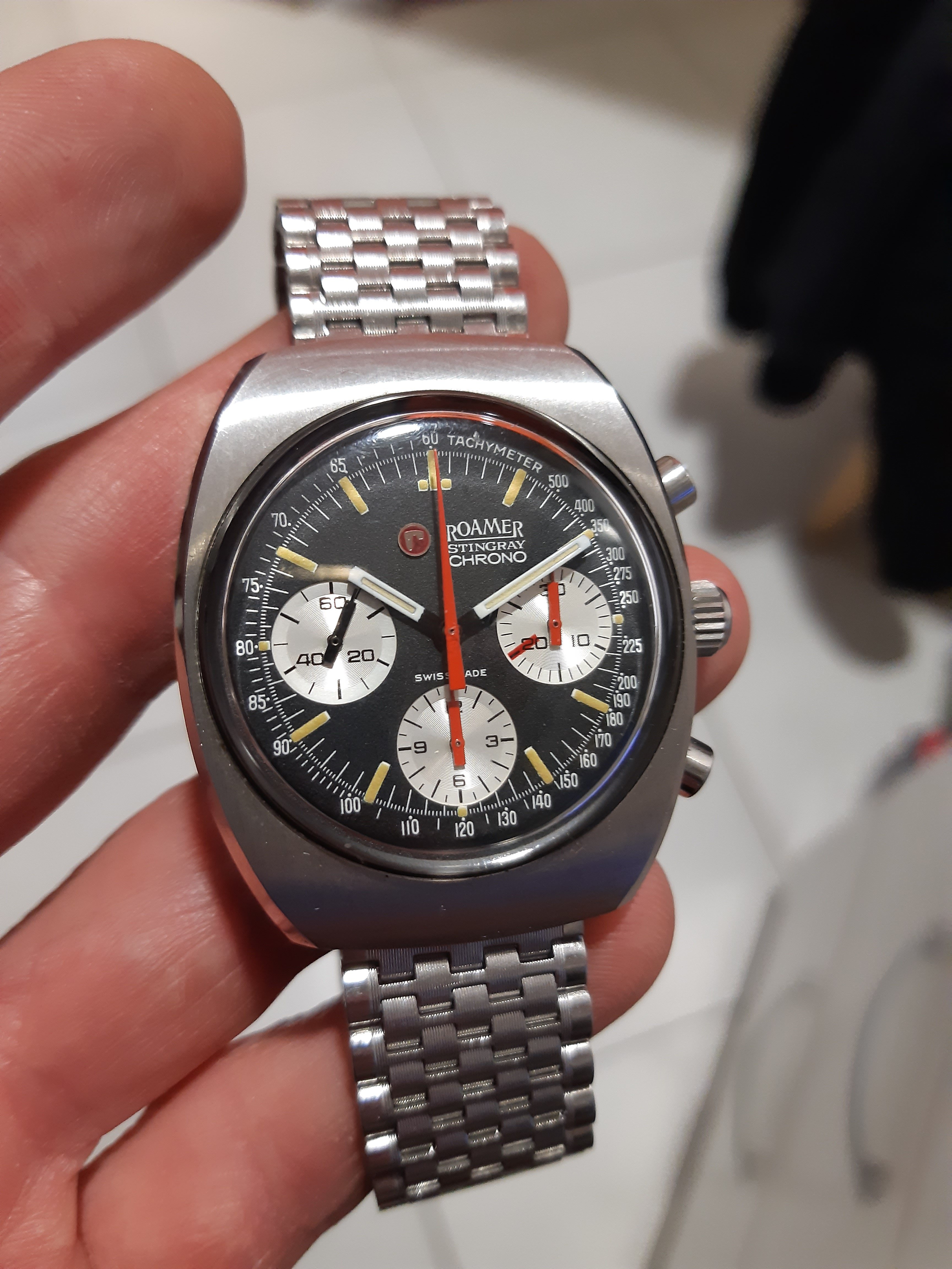 Yet another Valjoux 72 chrono bought this afternoon, but this time from the very confidential brand Roamer, here the Stingray. The watch is very rare and sought after by collectors of chrono valjoux 72, I jumped at the opportunity given the very good condition of the watch. Photo of the seller, I will post mine as soon as it arrives.