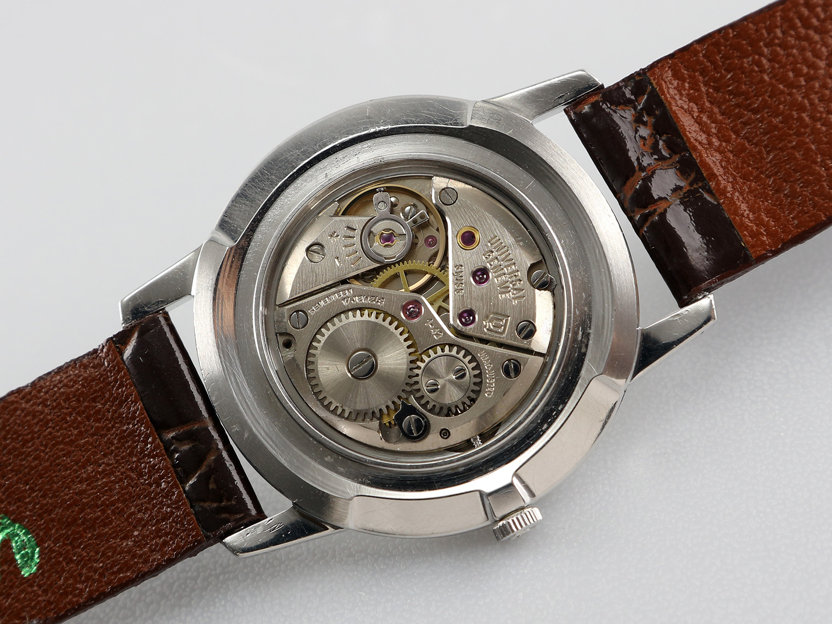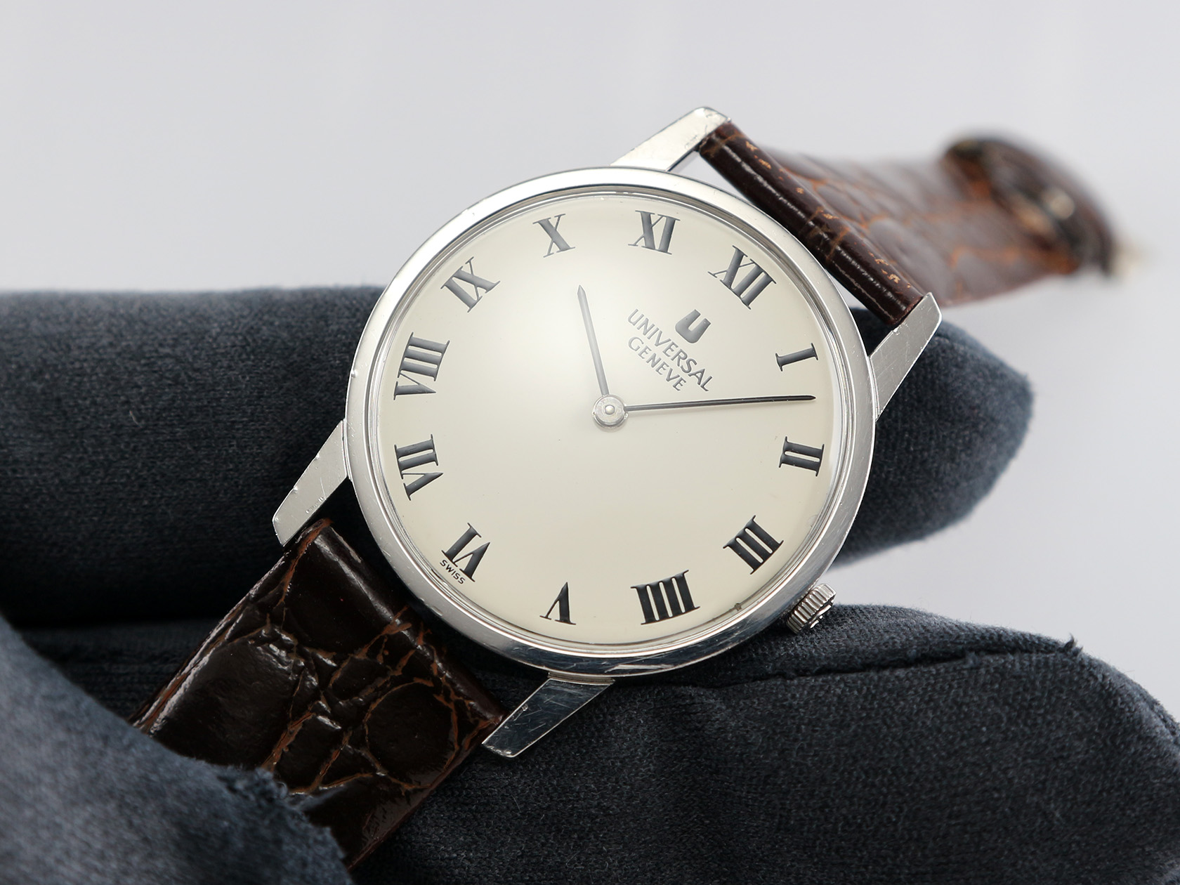·Up for sale is a very nice UG dress watch Ref. 842101. The original creamy white dial with Roman numerals looks elegant. The case is unpolished and in great shape plus the original crown. It is measure 31mm wide without crown and 37.5mm lug to lug, lug width is 16mm. Thanks to the ultra-slim profile: only 6.8mm in thickness, it wears larger. Inside is the UG cal. 1-42, service history unknown but still running strong & keeping time.