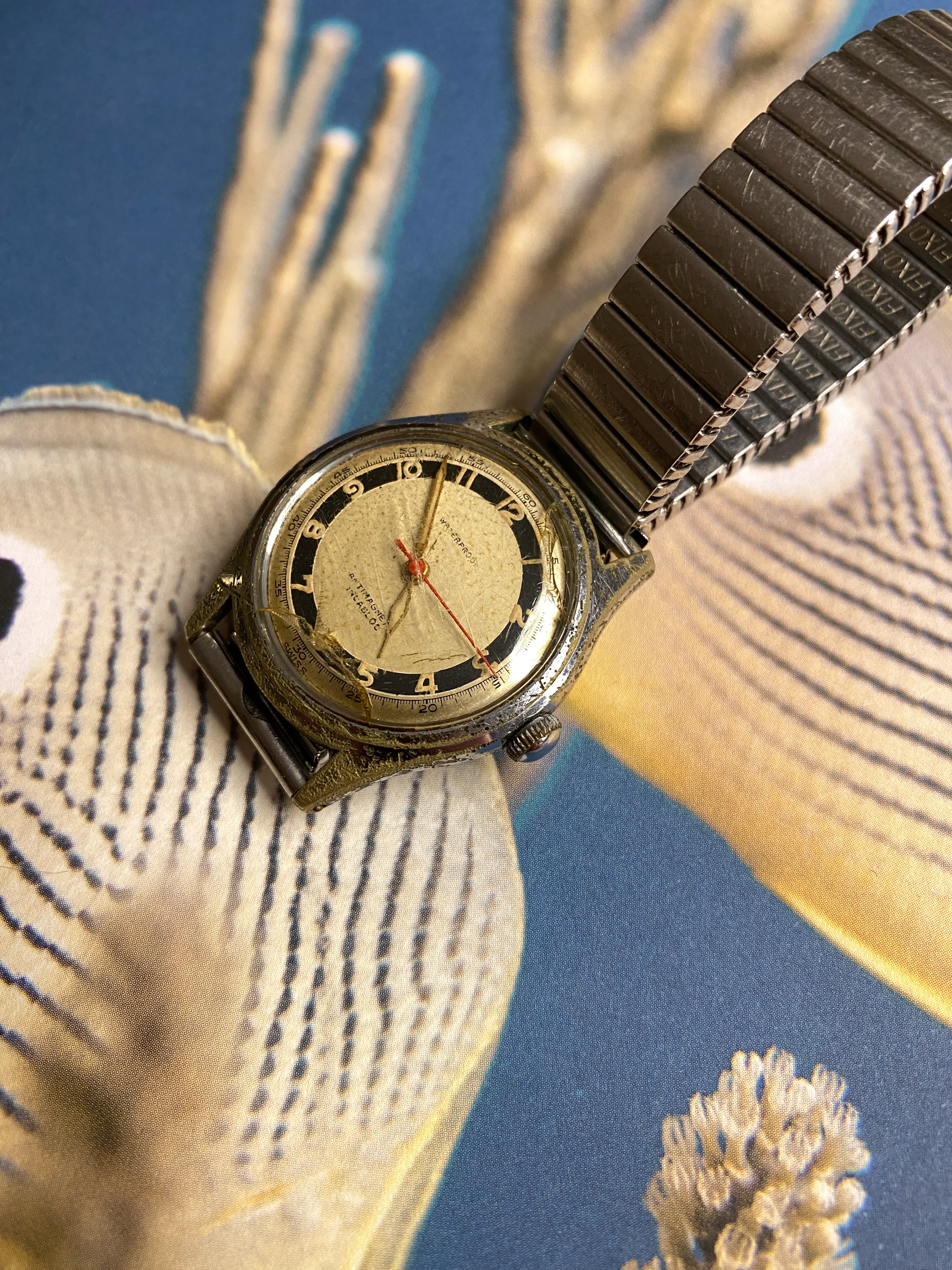 A no name swiss automatic, with a pretty worn chrome plated case, a cracked crystal and an old Fixoflex bracelet. The dial is pretty good underneath the crystal; some spots on the dial but the printing, lume and hands are top notch. It runs nicely when shaken and winds when turning the crown without any funny sounds, so should clean up nicely. Of course my wife claimed it but hopefully she will let me wear it occasionally 😀 So it will be off to the watchmaker for a much needed service and then worn. There was also a generic, flat link bracelet with a logo resembling a P but no end links.