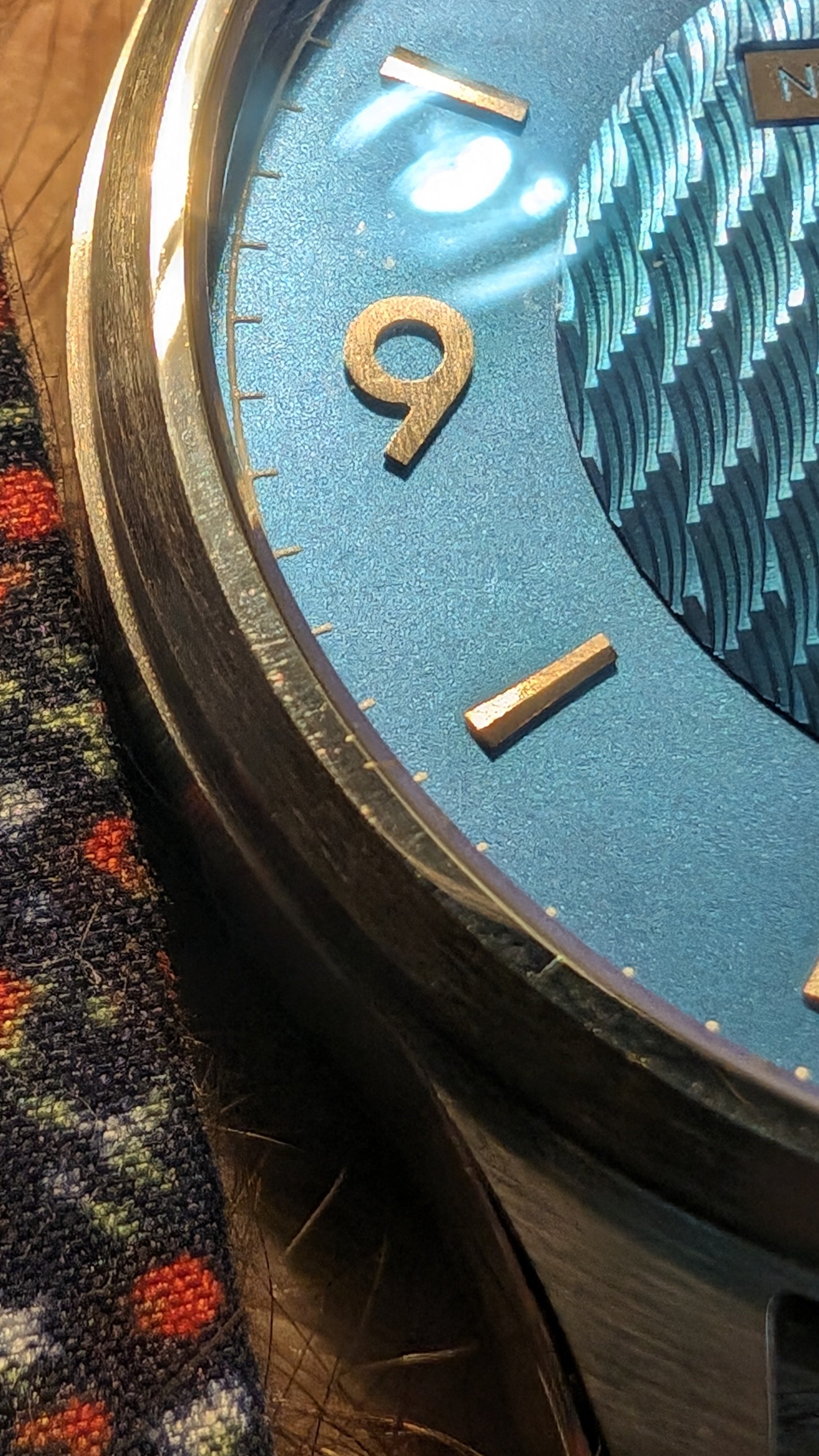- Anodised topaz blue titanium dial, with Grade 5 Titanium hands and applied numerals