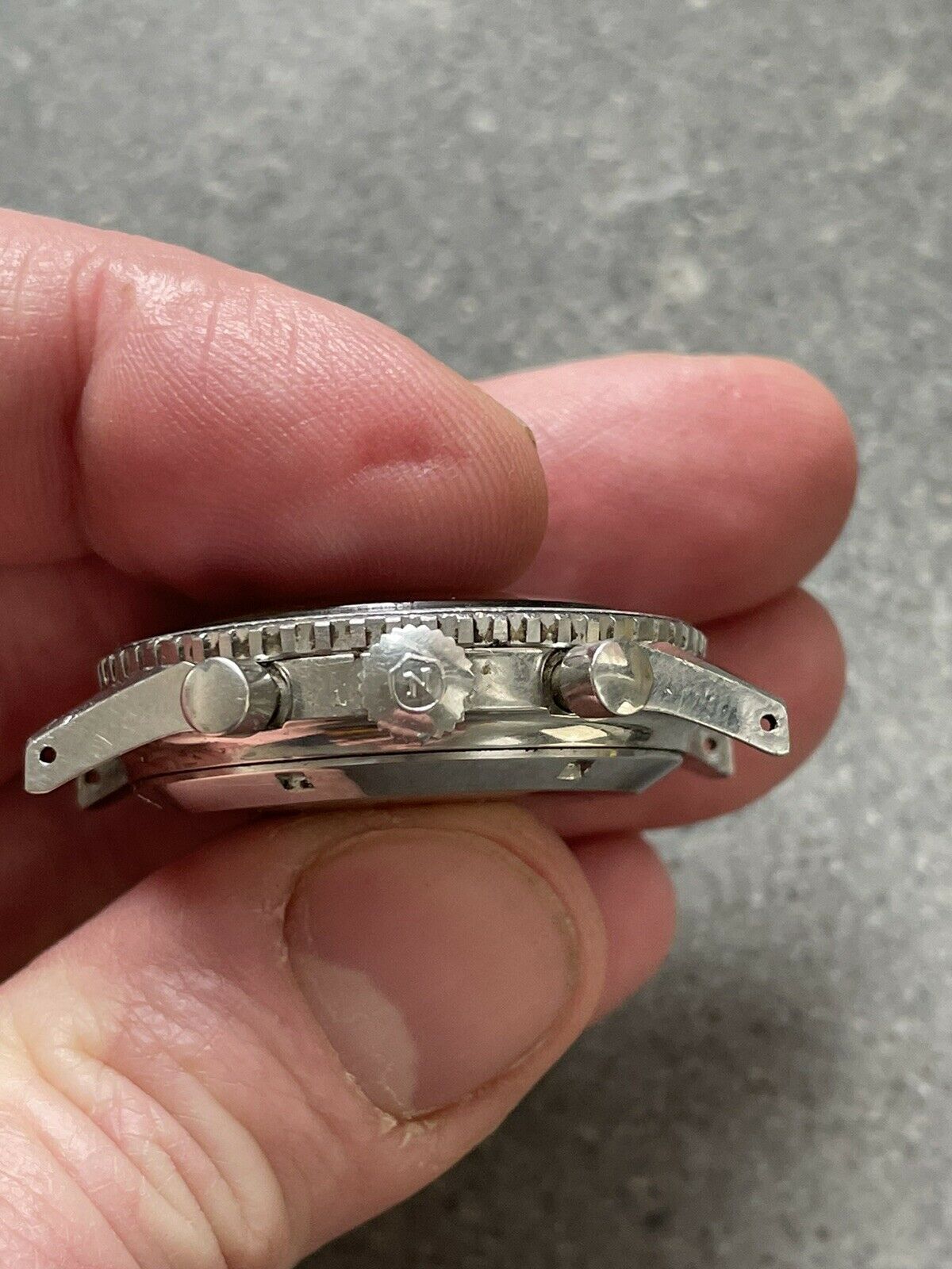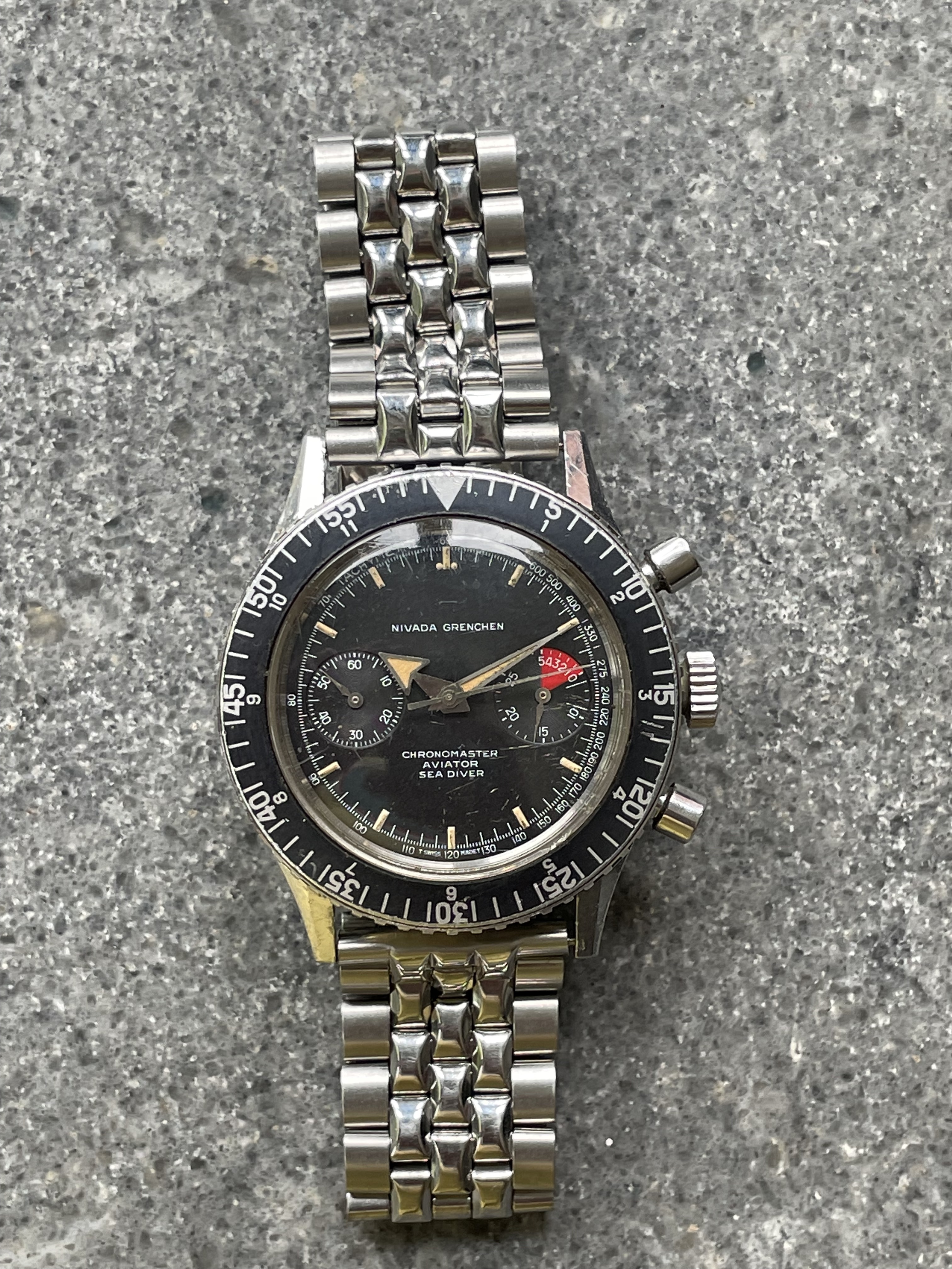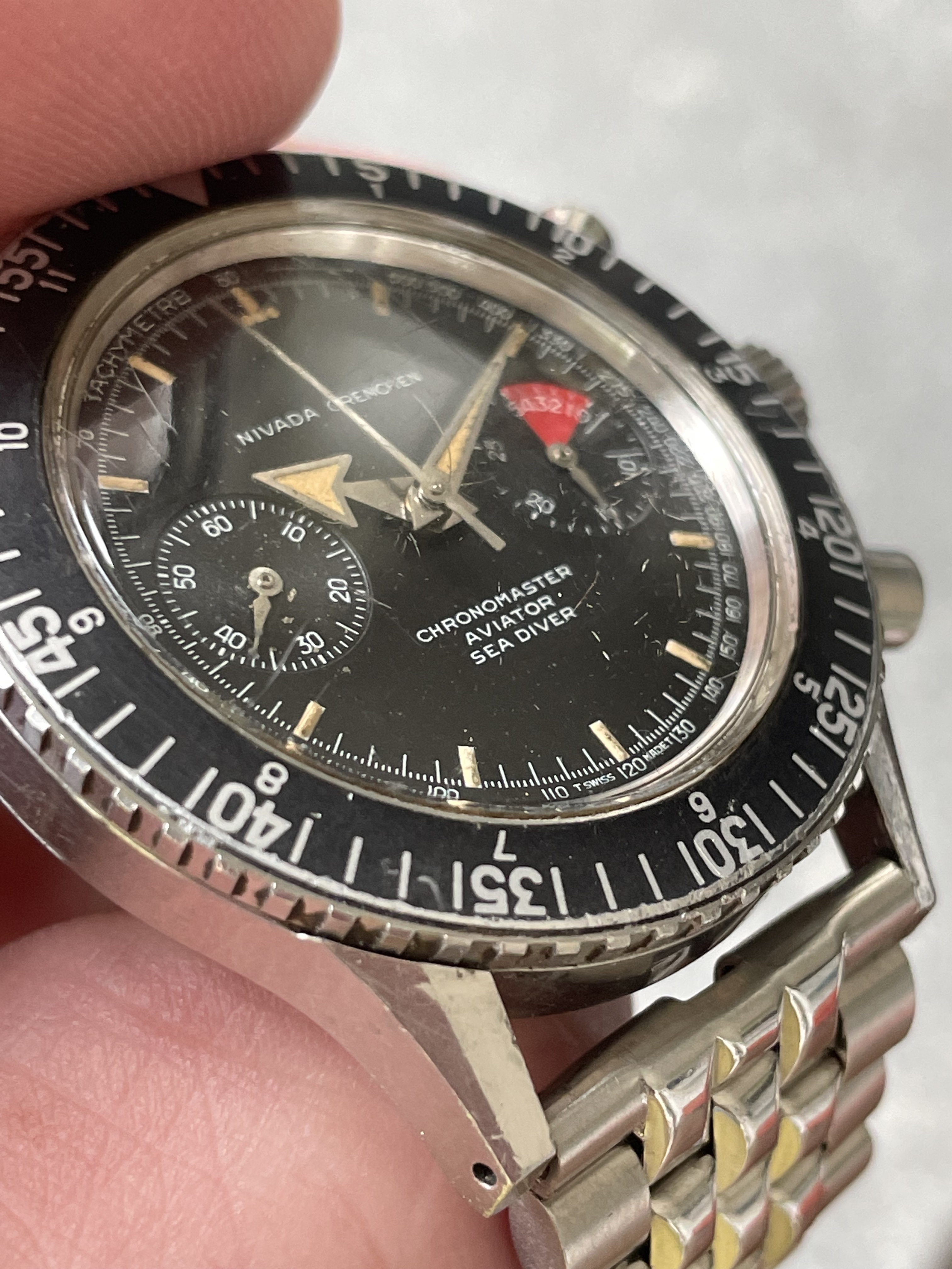 CASE: 39mm case (without signed crown) is in excellent, unpolished condition; all bevels are obvious, and there's light marks from wear, as you'd expect of anything pushing 60 years old. The caseback etching is clear, the crown is signed, and the bezel rotates bidirectionally as it should. The seemingly original crystal is crazed. The watch comes on a JB Champion straight-end Bullet-link bracelet that fits my 7.25" wrist fine. Caseback is marked 1837 M 8222.