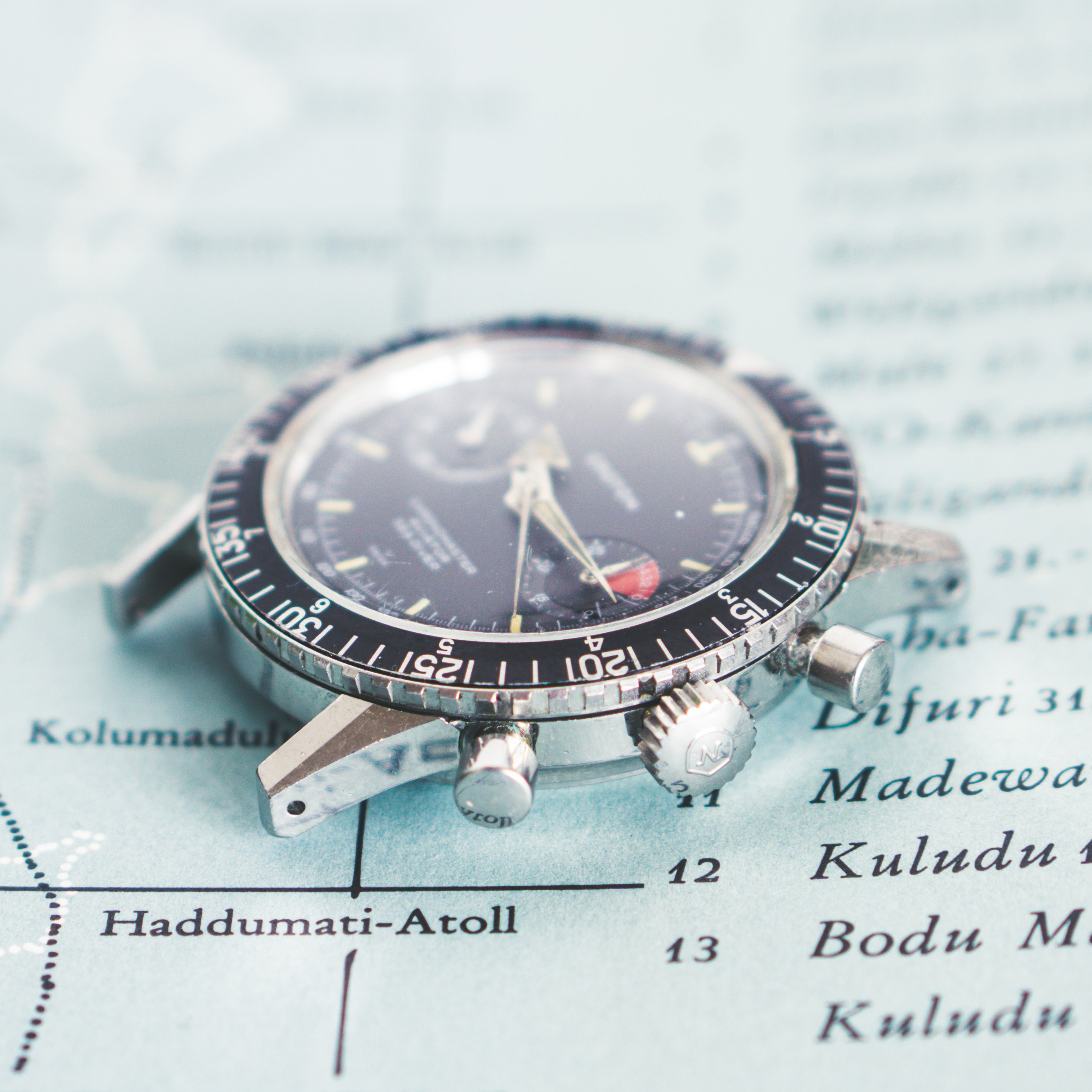The watch is in very good state. Some scratches on the back and an oxidation on the 55min mark on the bezel. Dial is flawless, original Tritium Arrowhand have some interesting patina. Case and crown are marked Nivada, Dial and movement Croton (the distributor of Nivada watches in the US).