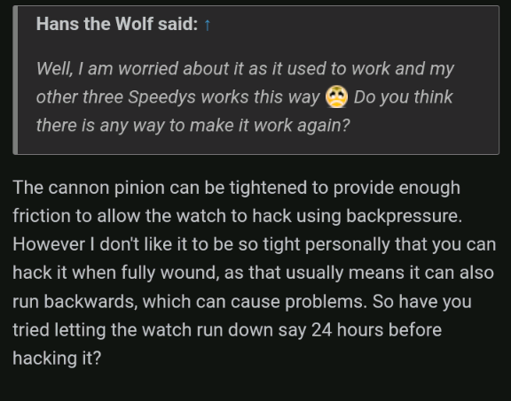 Today, a local Omega AD just received my 1861 Speedmaster back from a full service at Omega in New Jersey, USA. I sprinted to the AD to fetch my 1861 [which I purchased new in 2015]…all things checked out…except for the back-hack capability. In my humble opinion, this is important…when I set my 1861, I always set it to the second via a reputable time clock/signal. Also, the Omega operating instructions specifically address the back-hack, and prior to service, the back-hack capability functioned correctly. I would assume that following a full Omega service, all functions will operate correctly.