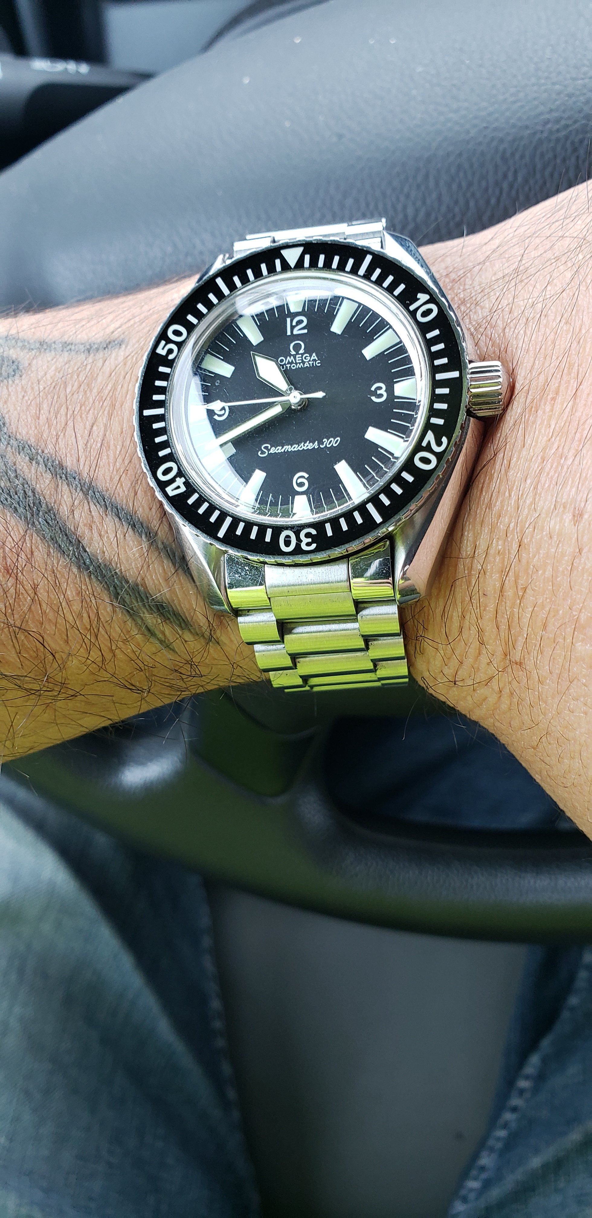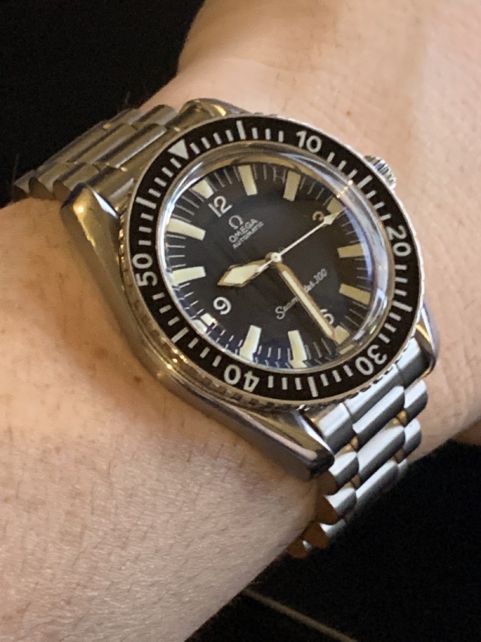 Back in the 60s, the 300 shipped from Omega on a 1039 or 1116 bracelet (or a black Tropic rubber strap). I think the 1450 is more in keeping with the tool spirit of the watch than the 1039 or 1116. The 1450 gives you the all brushed upside of the toolish 1171, but with greater quality and comfort.