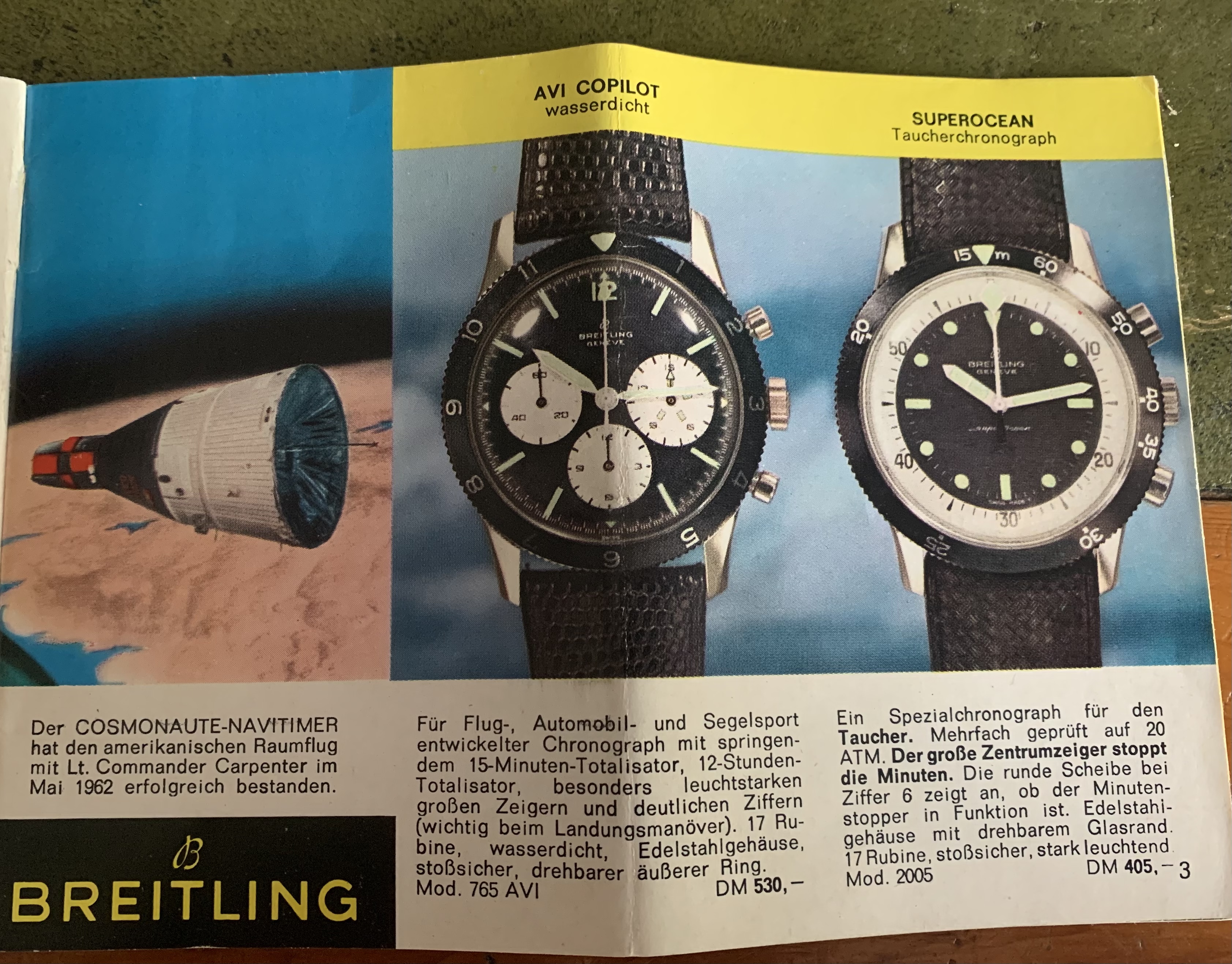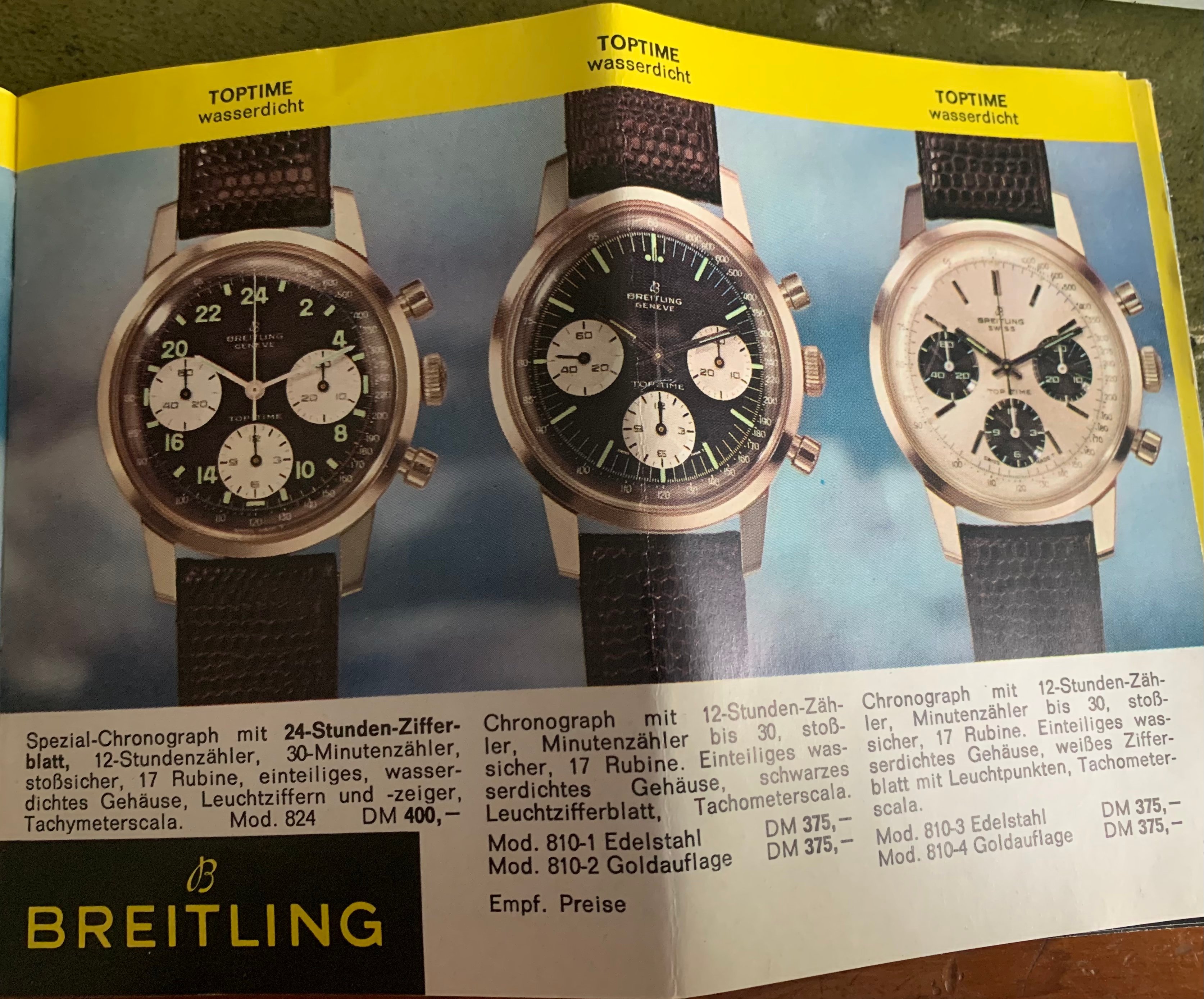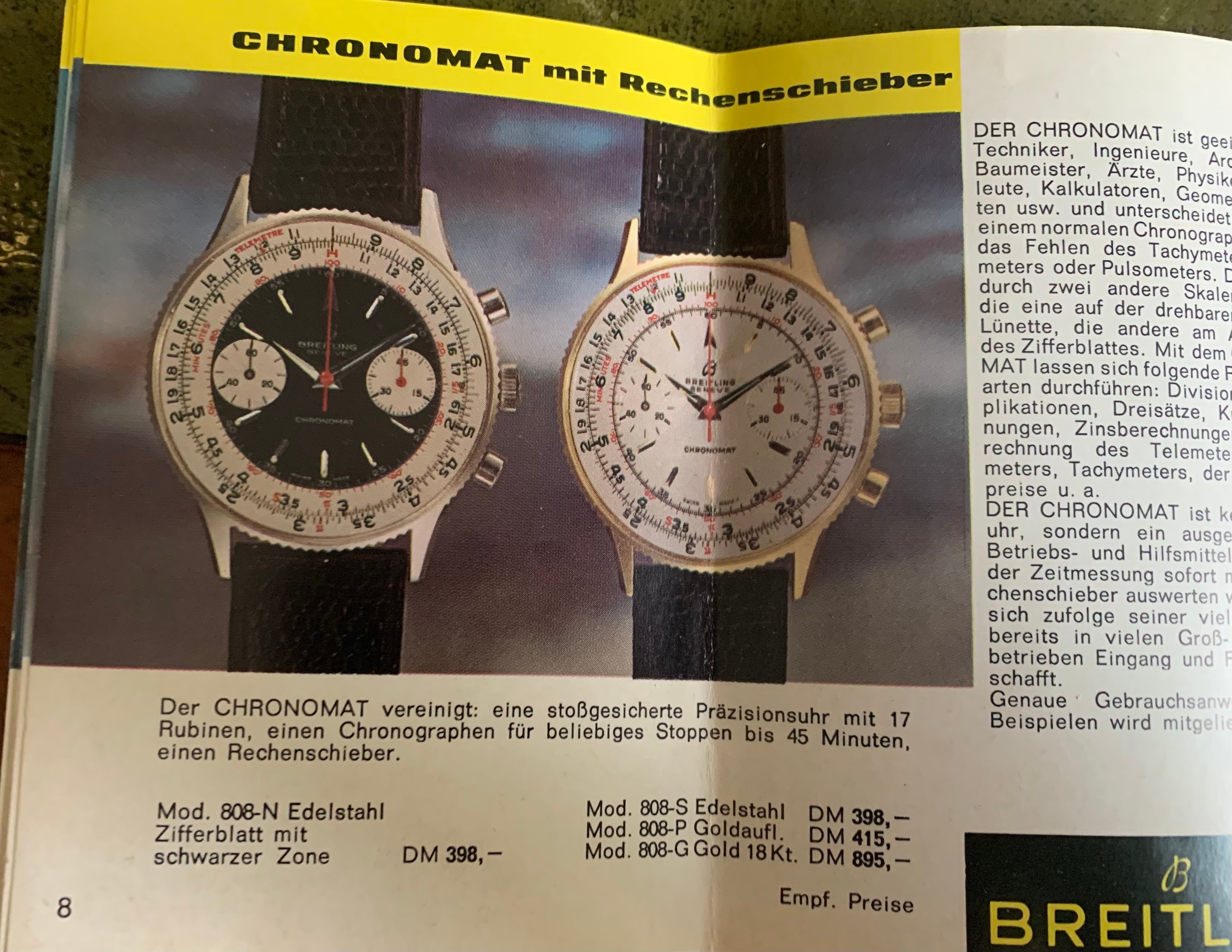 And for those who appreciate these things, here鈥檚 a copy of the brochure which was with the above watch, from 1968 showing the available chrono range and prices from Breitling鈥檚 glory days: