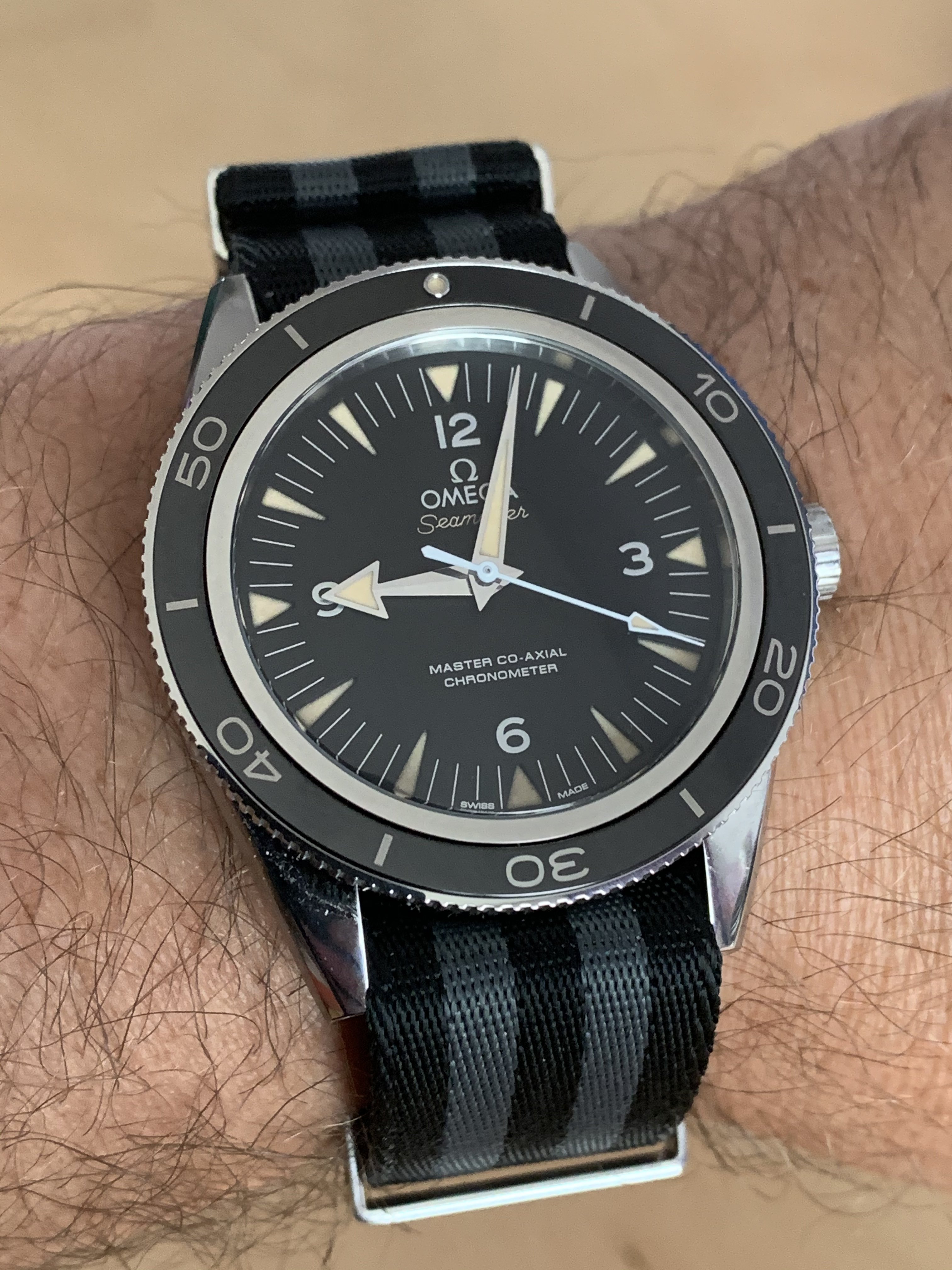 I love the SM 300. Would like the lollipop seconds hand of the Spectre version. One question I have wondered about that version, is there lume on the bezel? The bezel market at the 12 o' clock is different to the non Spectre. I assume the numbers are lumed on the limited edition? Seems very unusual to have no lume on the bezel but I haven't seen a Spectre in the flesh let alone the dark! Just wondered. G