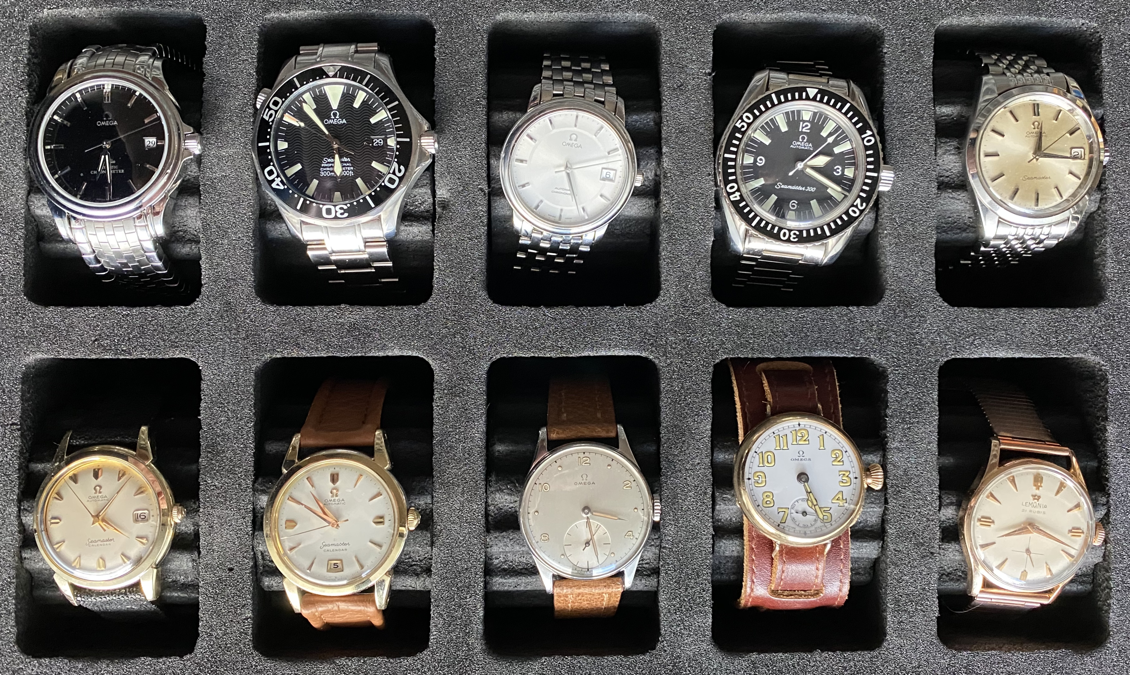 路With the arrival of the DeVille Prestige back from Nesbit's, the Omega watch box is full. Yes, there's a Lemania in the #10 position, but it's a cousin so still in the family.