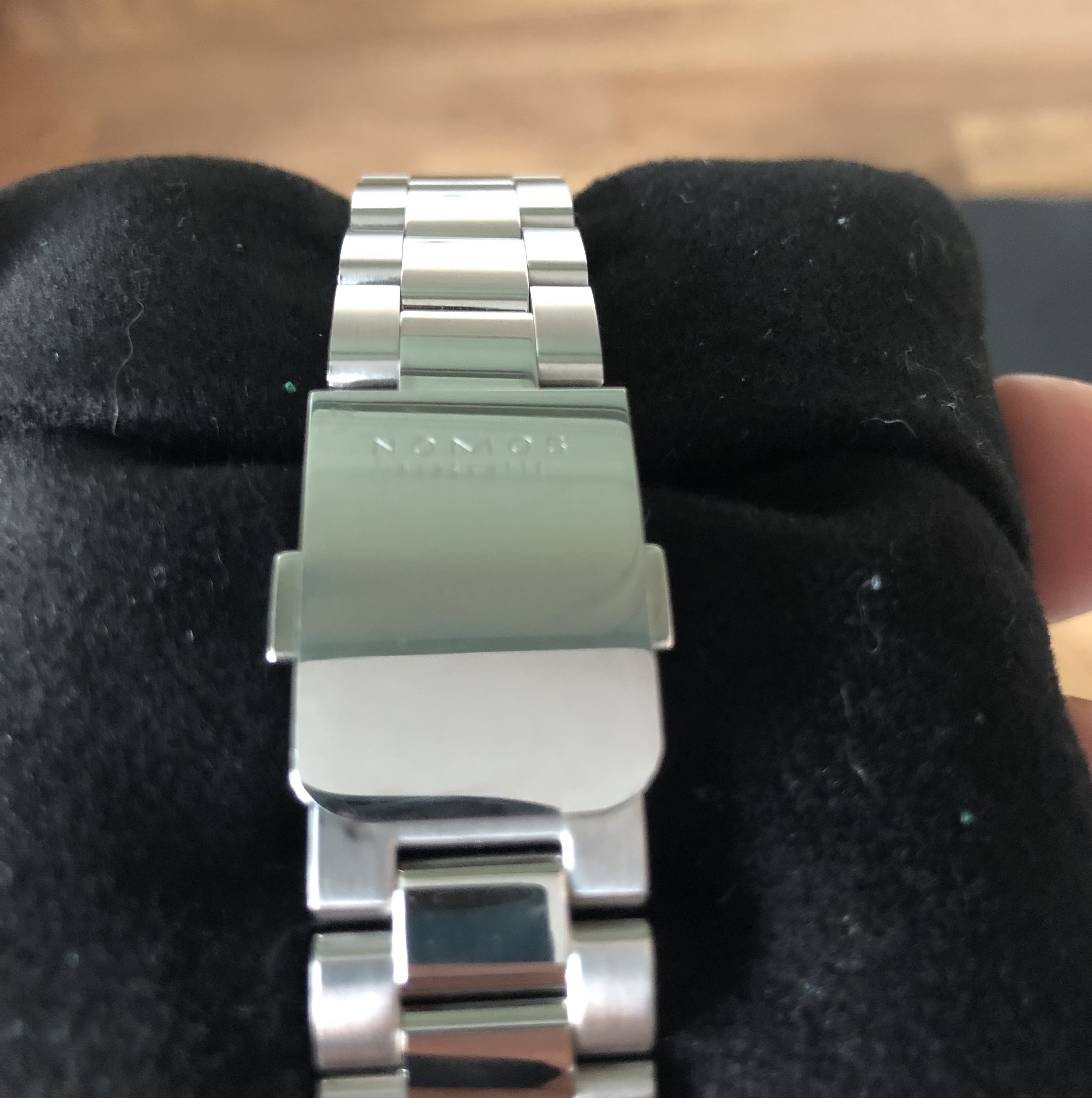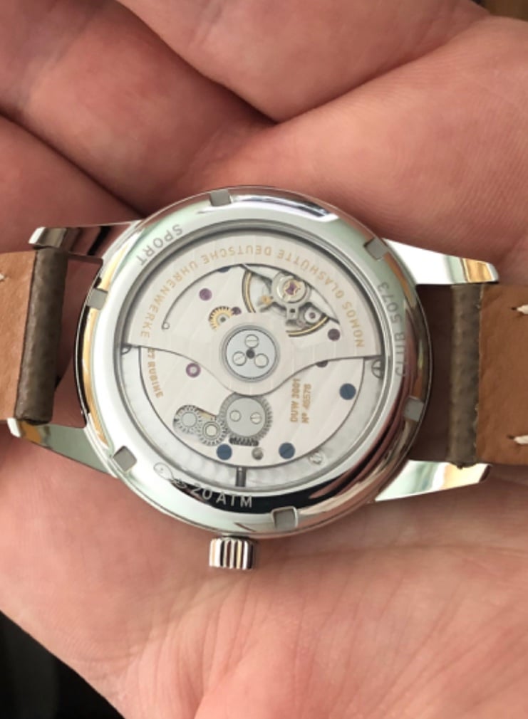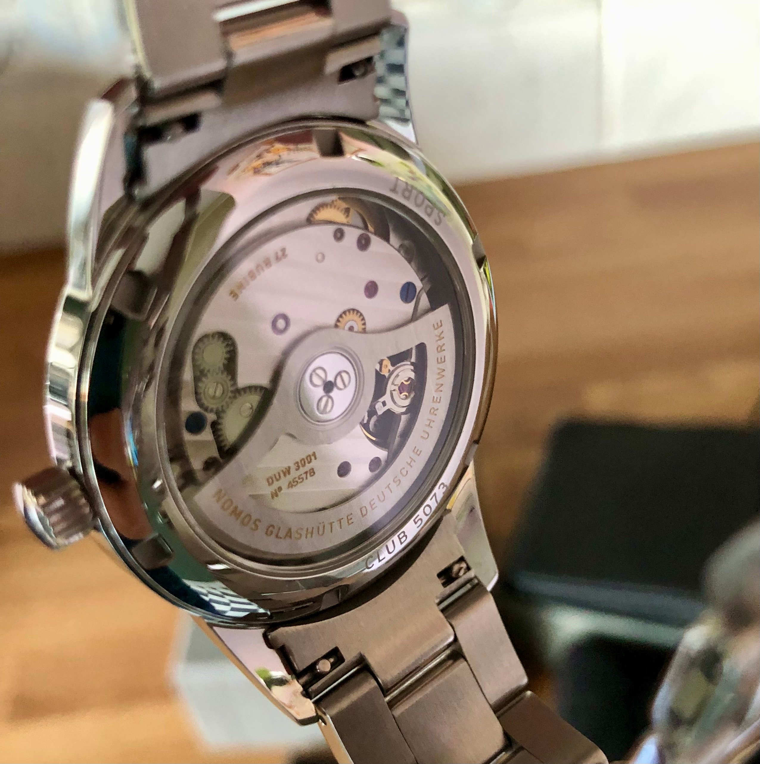 The polished case is 37 millimetres and is in great condition. Importantly this has the clear sapphire case back showing the beautiful automatic DUW 3001 movement. The movement developed and manufactured in house by NOMOS and is just 3.2 millimeters thick. The watch is only 8.4mm thick but has 200m water resistance. Comes with the steel bracelet with some minor superficial swirls in a couple of places, sized to 7inches and 5 additional leather straps, one is a NOMOS official strap with the NOMOS buckle. Just over 1yr left on the official warranty. The crystal is scratch free. Keeping to perfect time. A fantastic watch at a great saving. £1800 with free U.K. delivery and £20 eu, Row to be discussed if you are interested