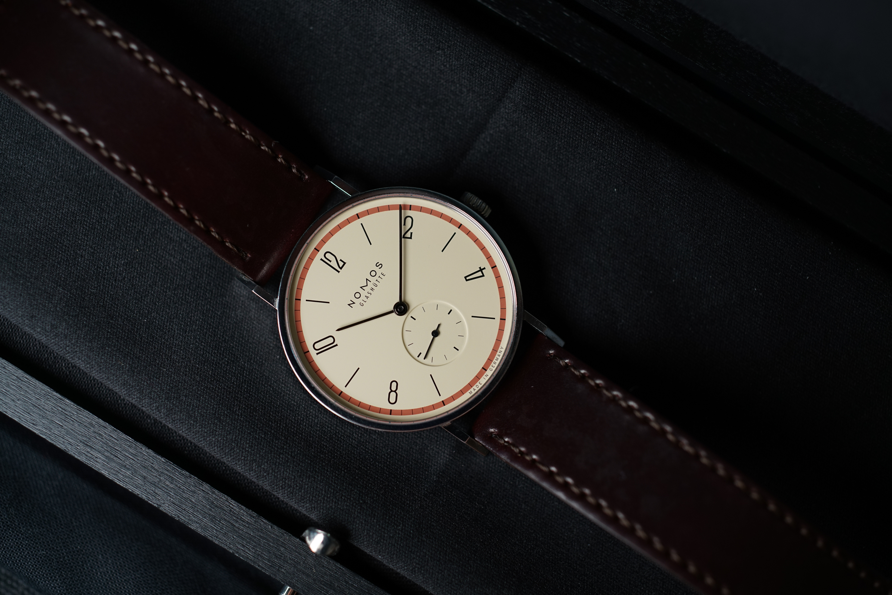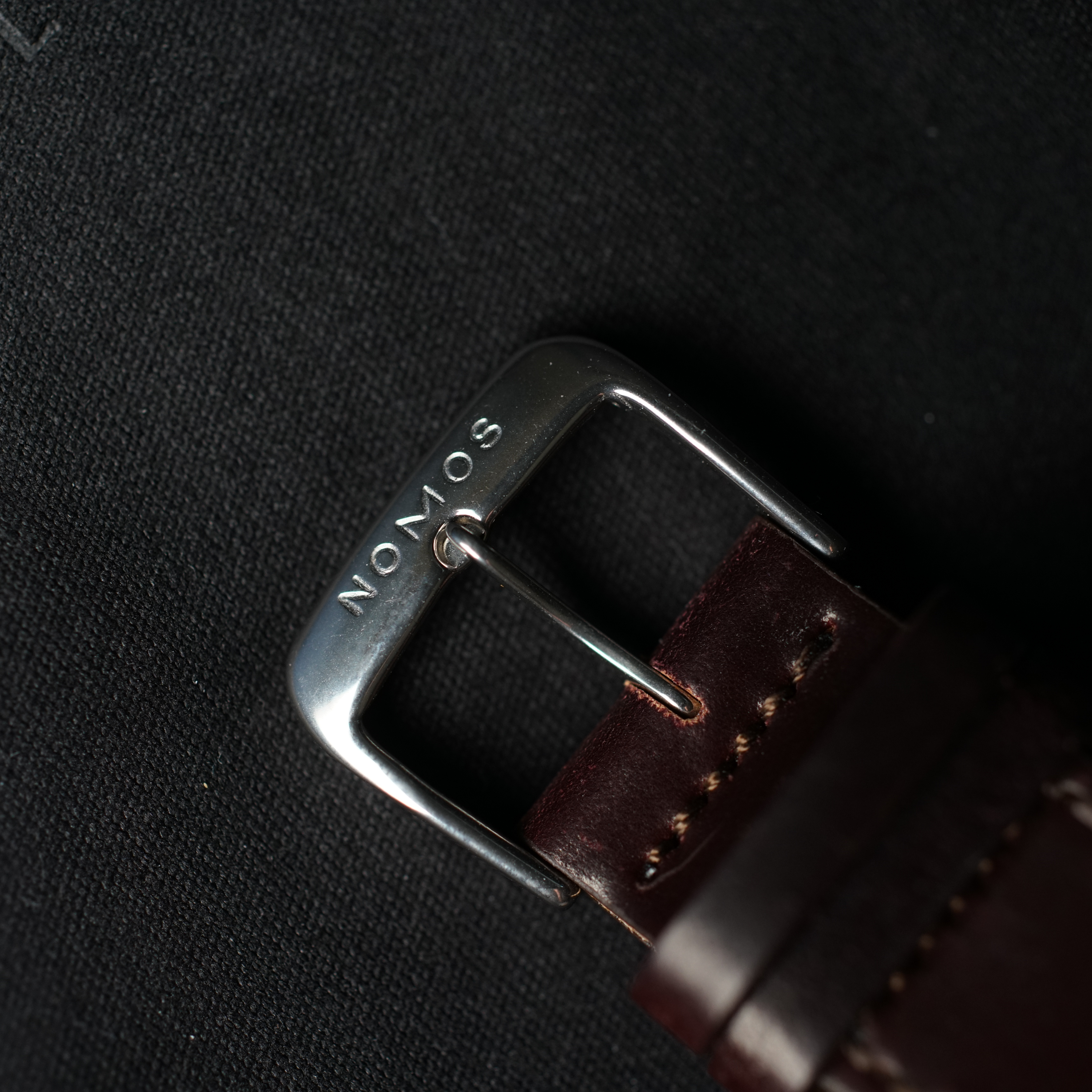 Comes with nomos box, warranty cards, original sales receipt for, and extra Long length nomos black shell cordovan strap. Also comes with a Nomos journal book, several nomos watch prints, and a catalogue that was sent along with the watch.