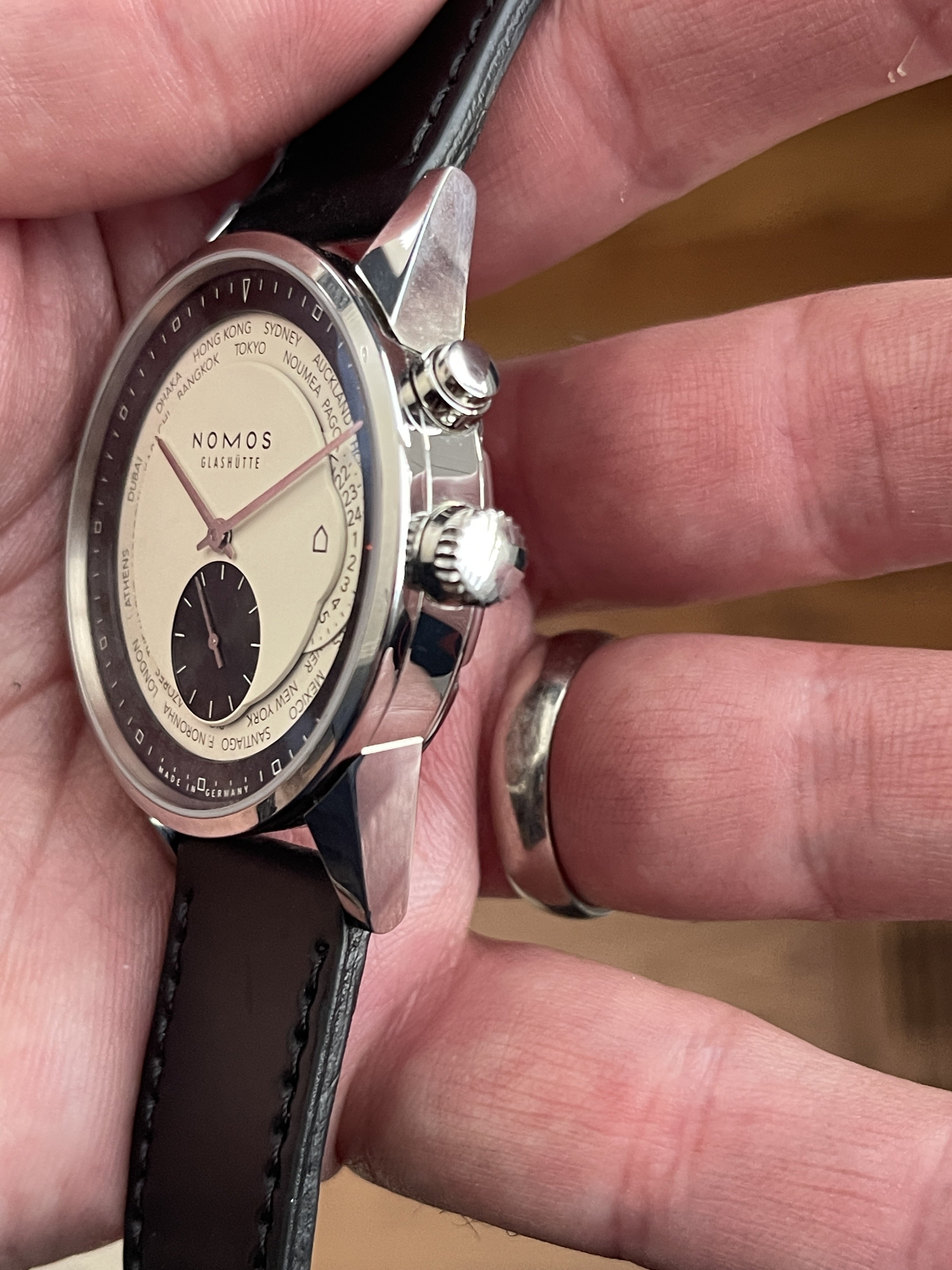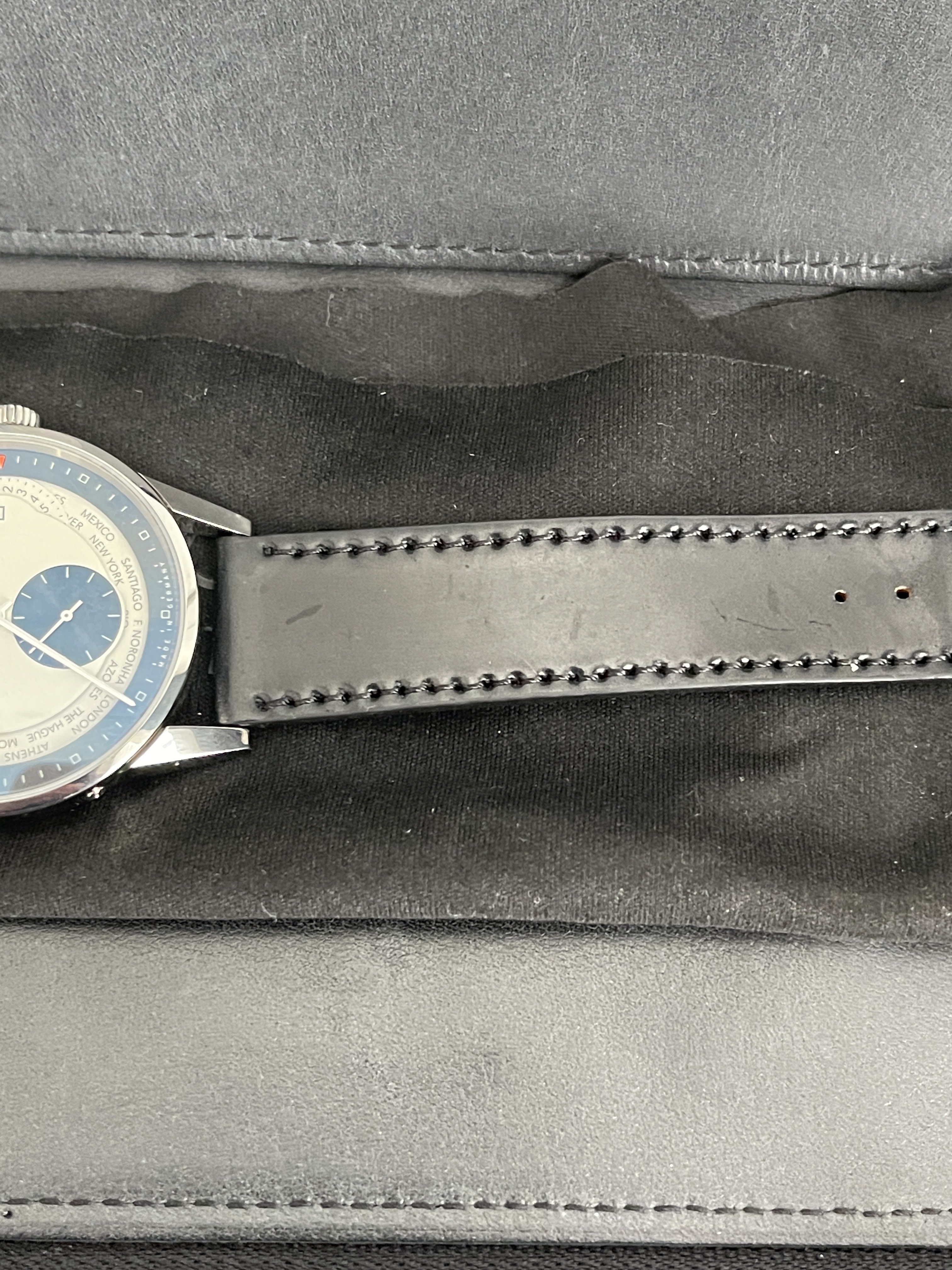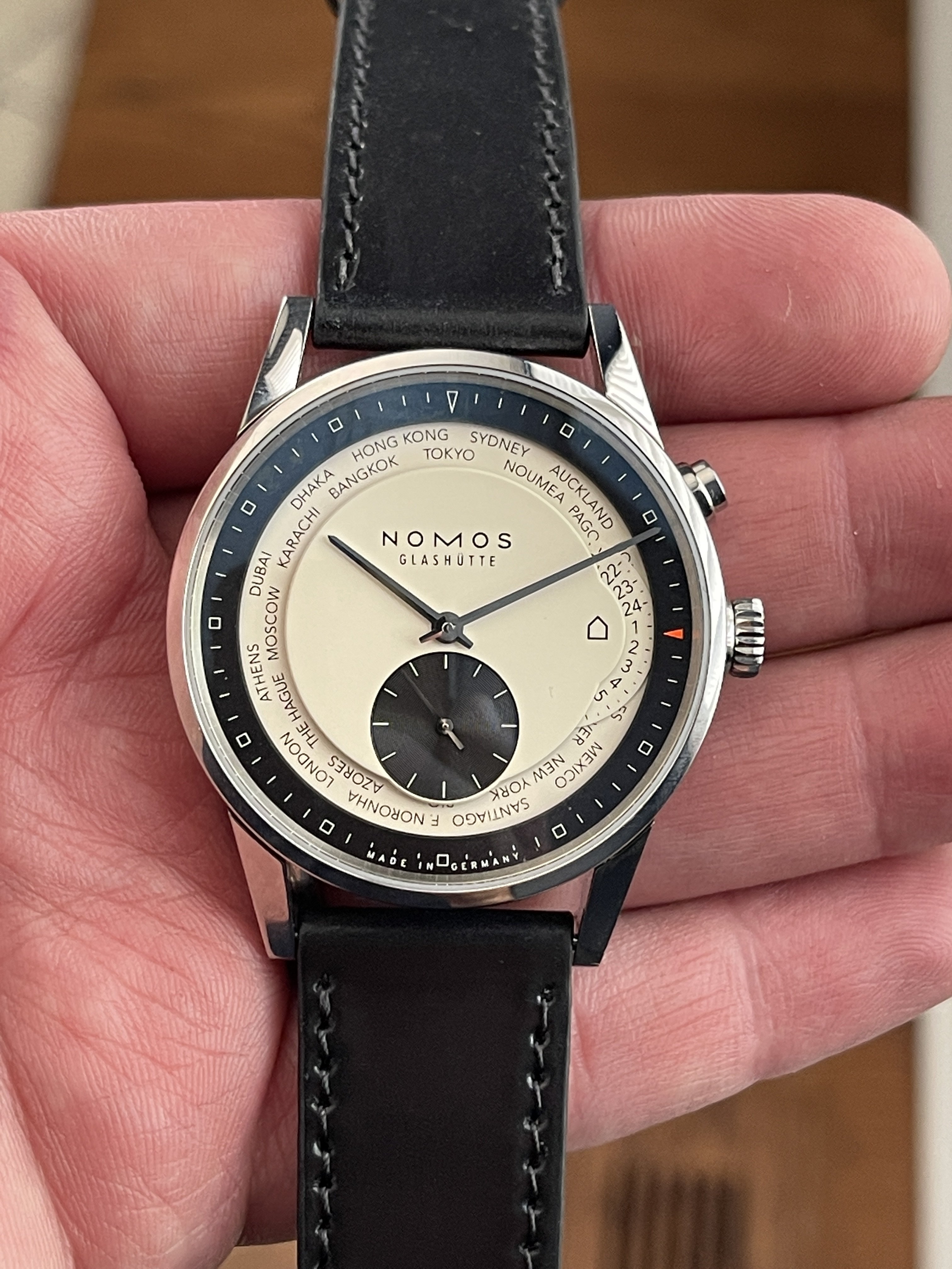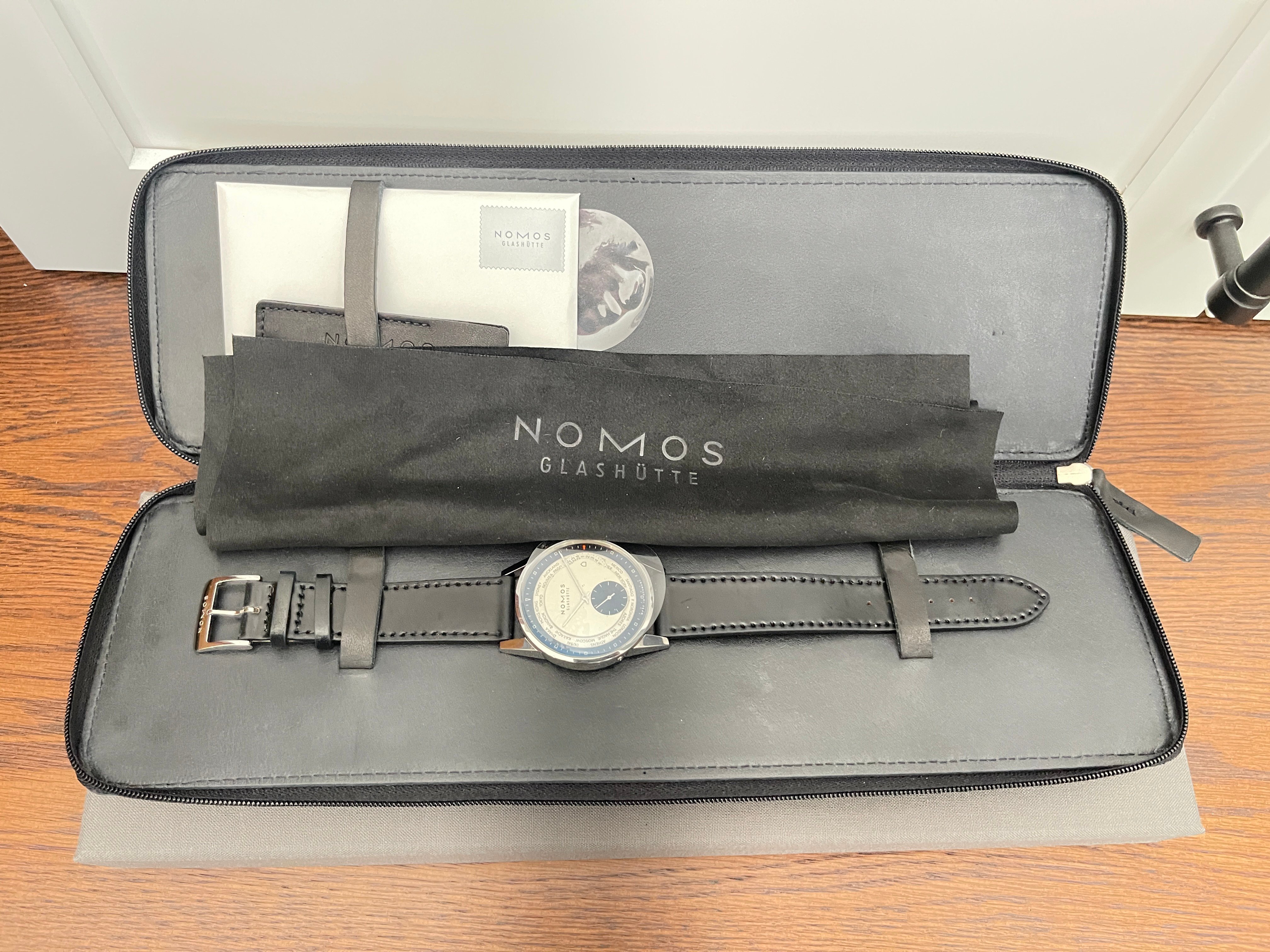 Nomos "The Hague" Weltzeit in excellent condition. 1 of 25 (actual number will only be shared with the buyer, it's not #1). Everything that came with it originally is included, box/papers, etc. I did not wear it on the black original strap which it is being sold with, so the strap is in very nice condition. No defects or issues that I can find.