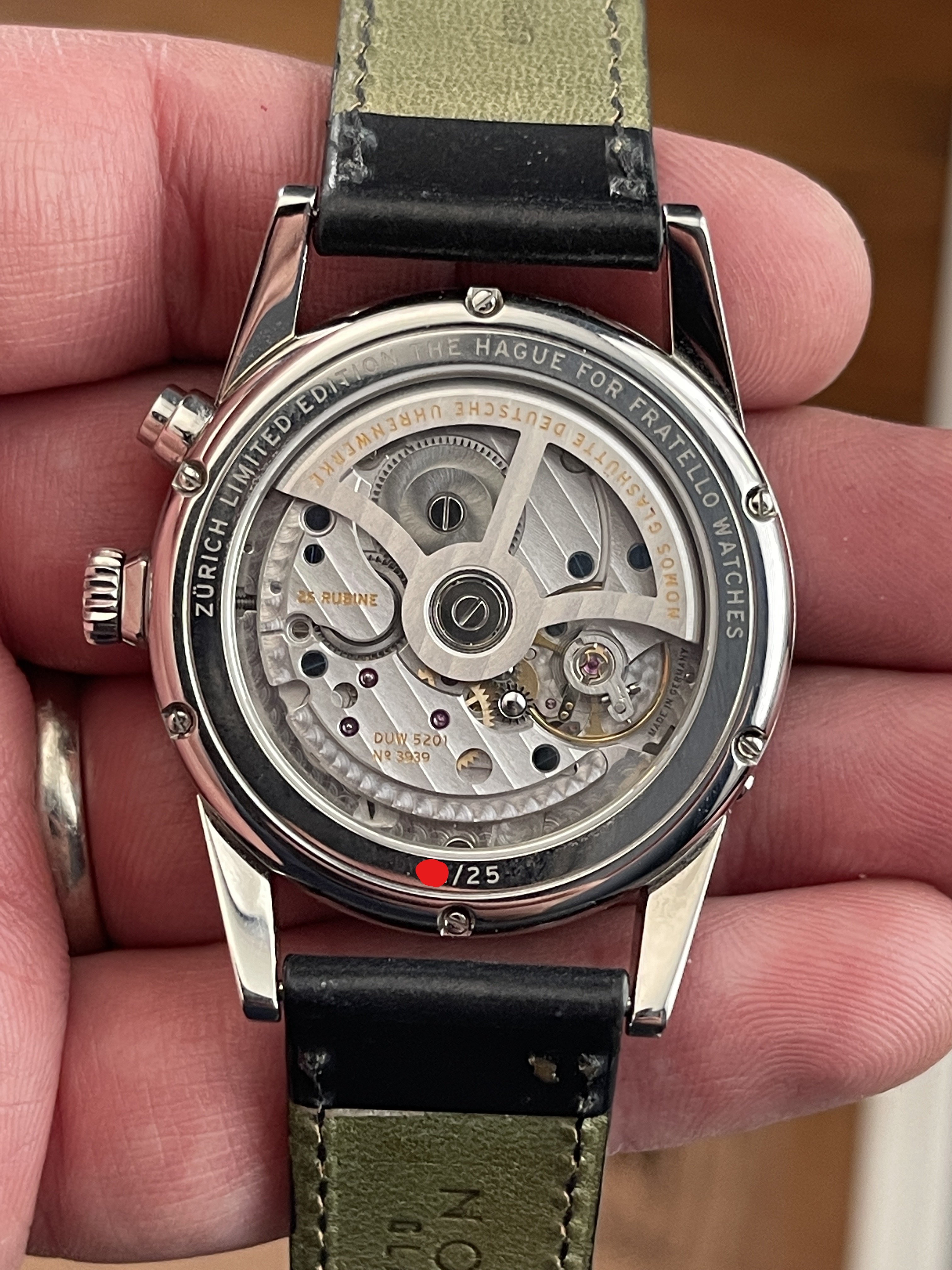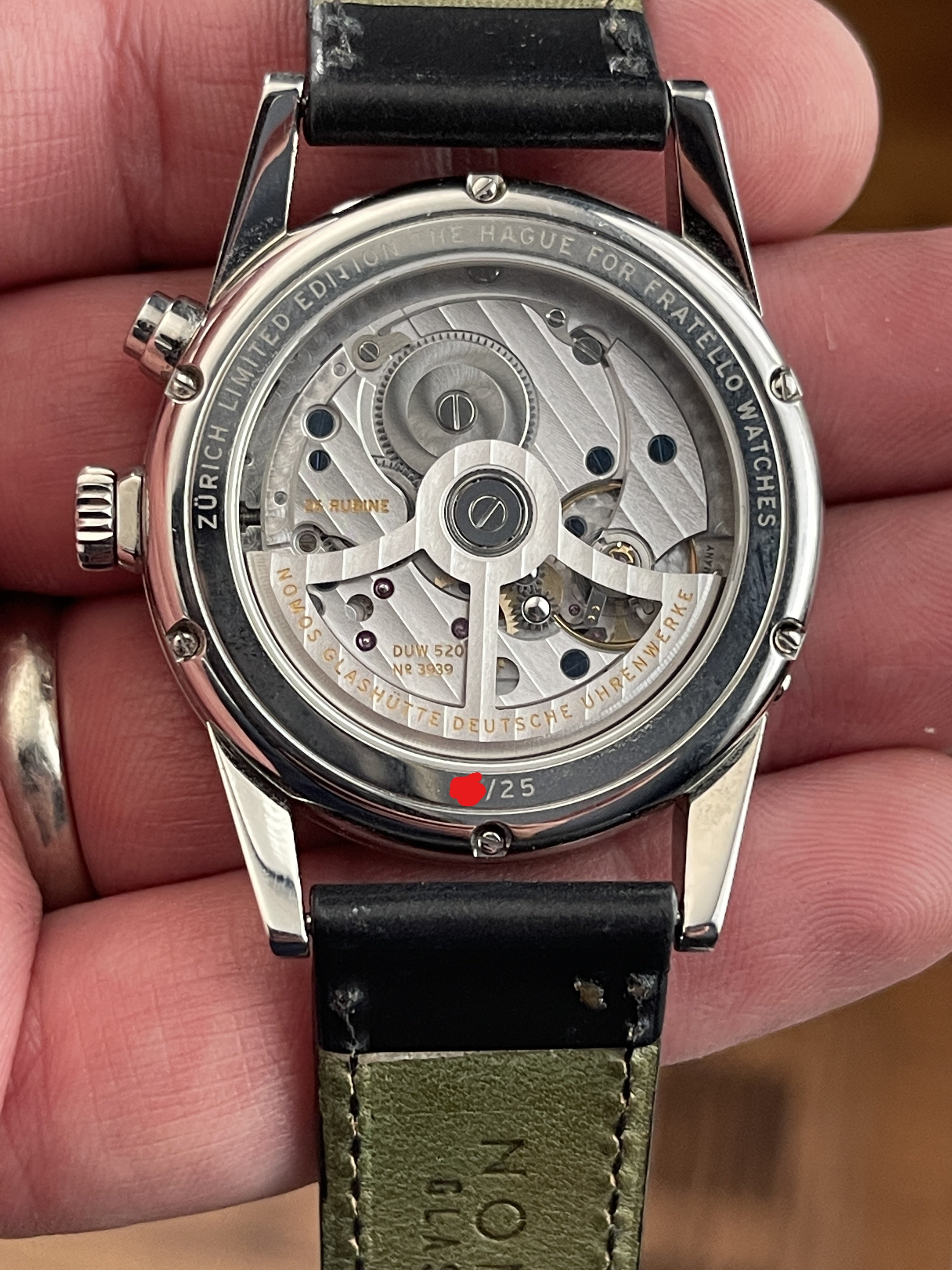 ·I stayed up late into the night in 2021 trying to land one of the 25 watches made in a collaboration between Nomos + Fratello - and was terribly disappointed when they sold out in seconds and I didn't get one! I ended up stalking the lucky buyers on IG, and eventually got one to sell it to me. My wife thought (probably still thinks) I was insane. The original owner had only wore it a couple times, and I also have only worn it a couple times. I am selling it for what I have in it. It's an awesome watch, I just find myself grabbing a vintage Speedmaster most days and don't wear it.