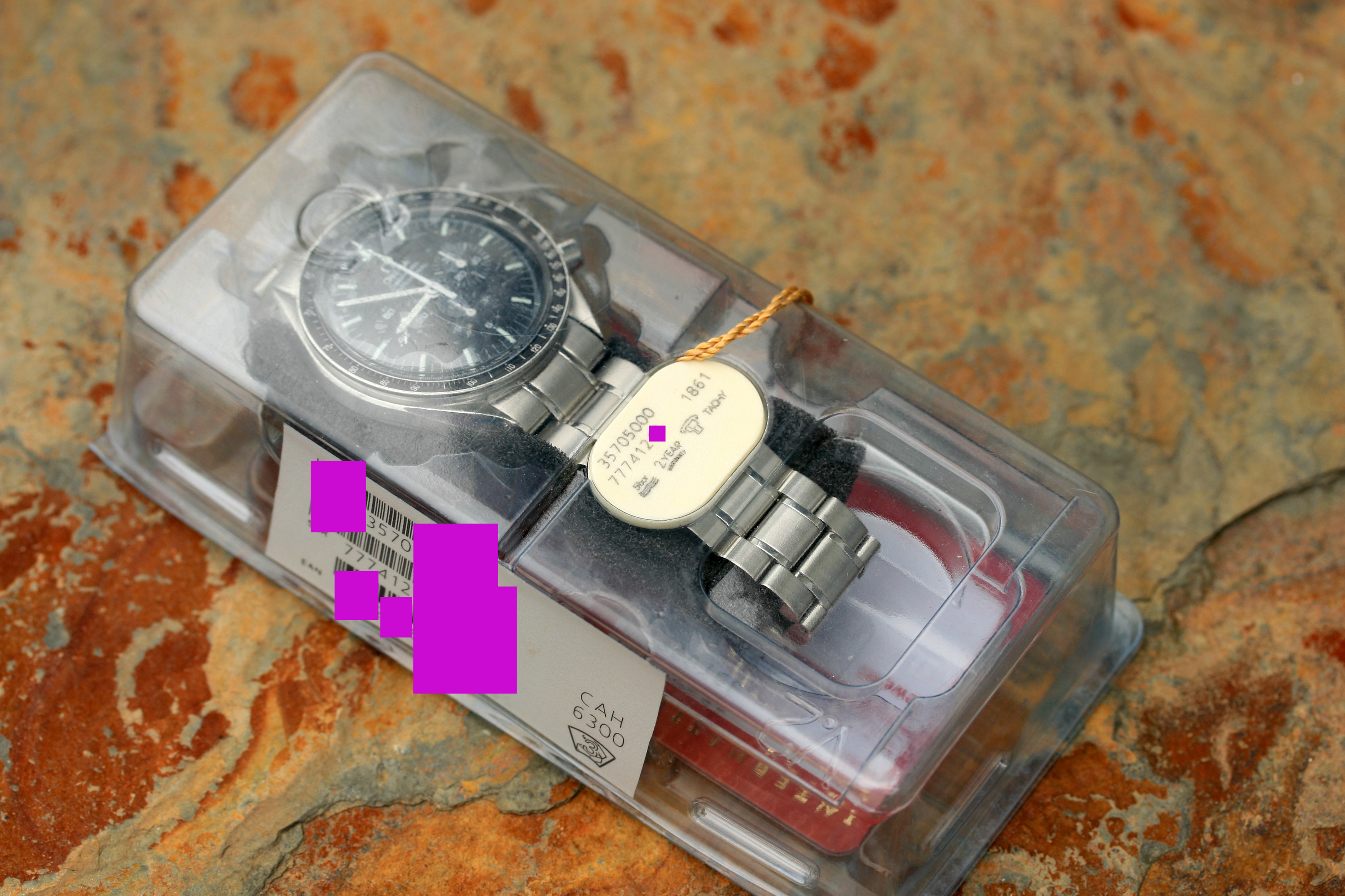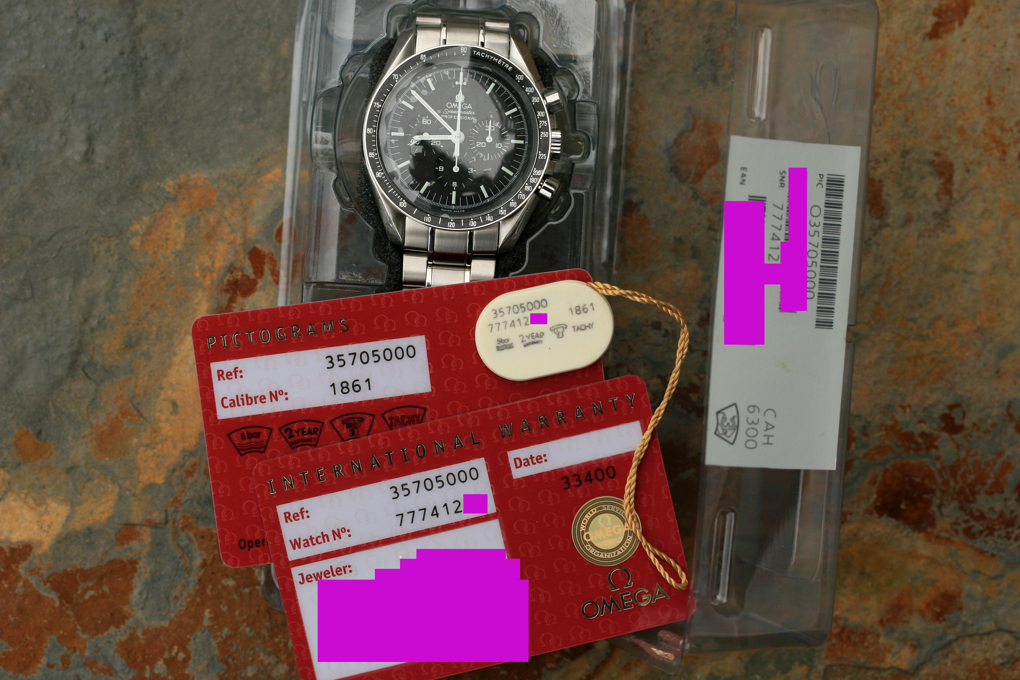 Comes with everything you see in pictures. Omega shipping coffin, hang tag, warranty and pictogram cards. Warranty card will be dated at time of purchase for full factory warranty.