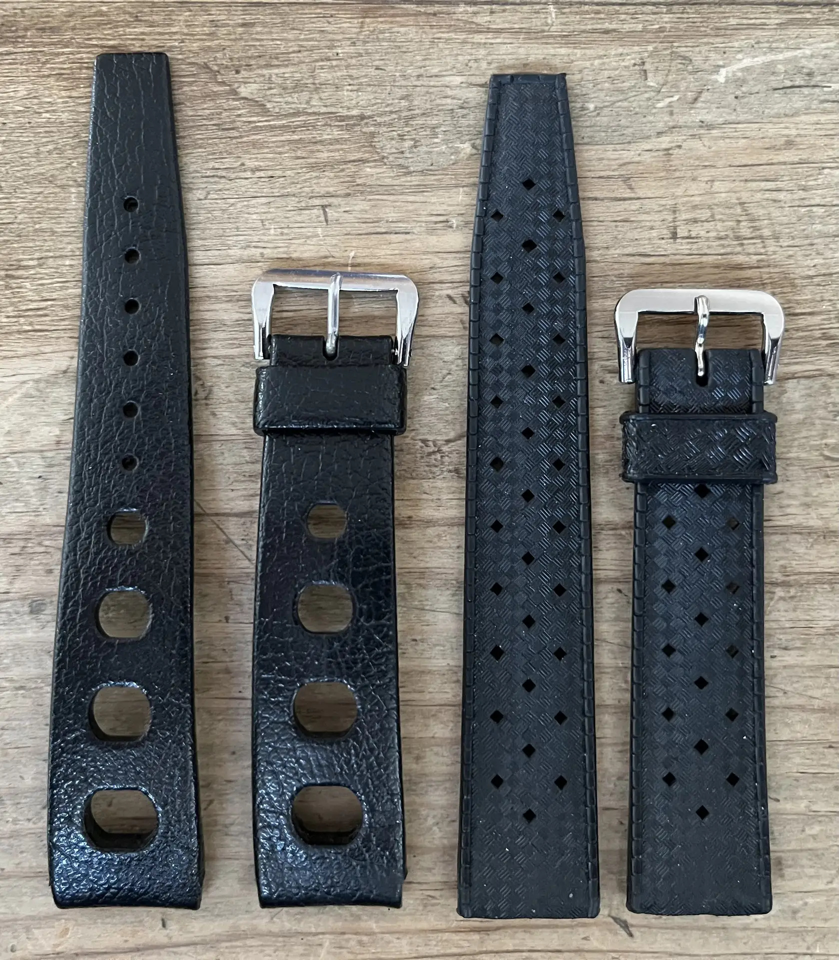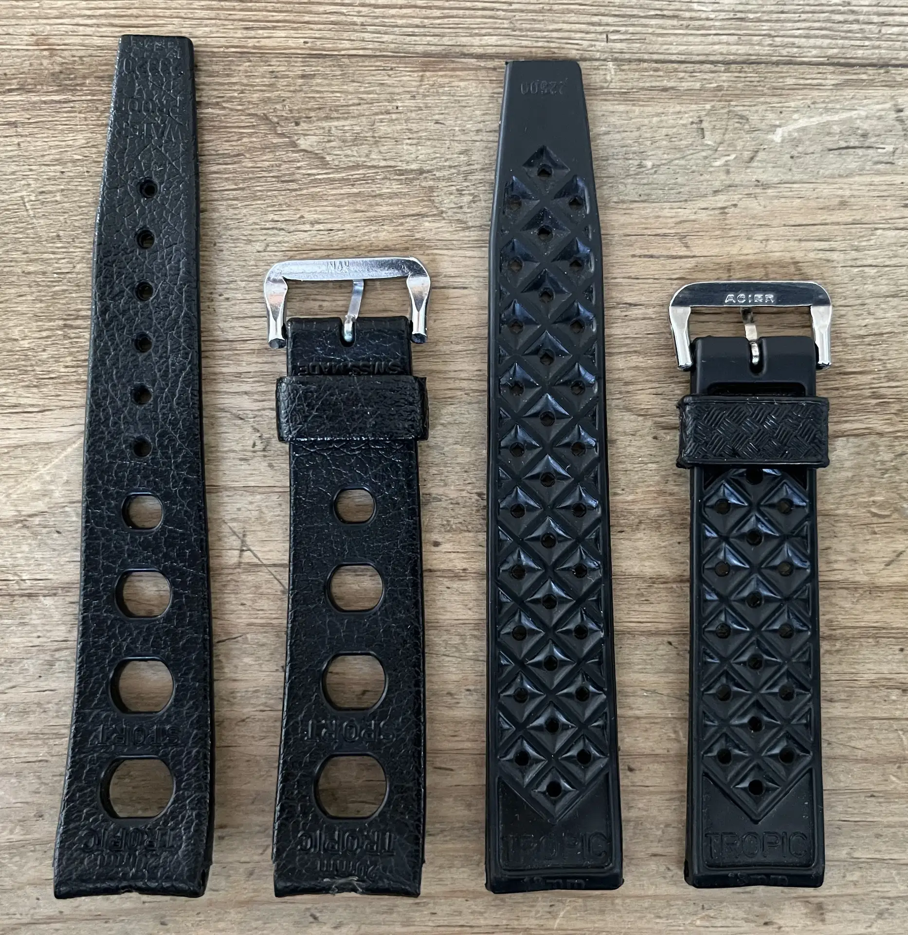 ·NOS Swiss Tropic straps - one Tropic Sport in 20mm and one Tropic classic basket weave in 18mm and both have their original stainless steel buckles. Please note - the Tropic Sport was installed on a watch and placed in a display, but never worn.