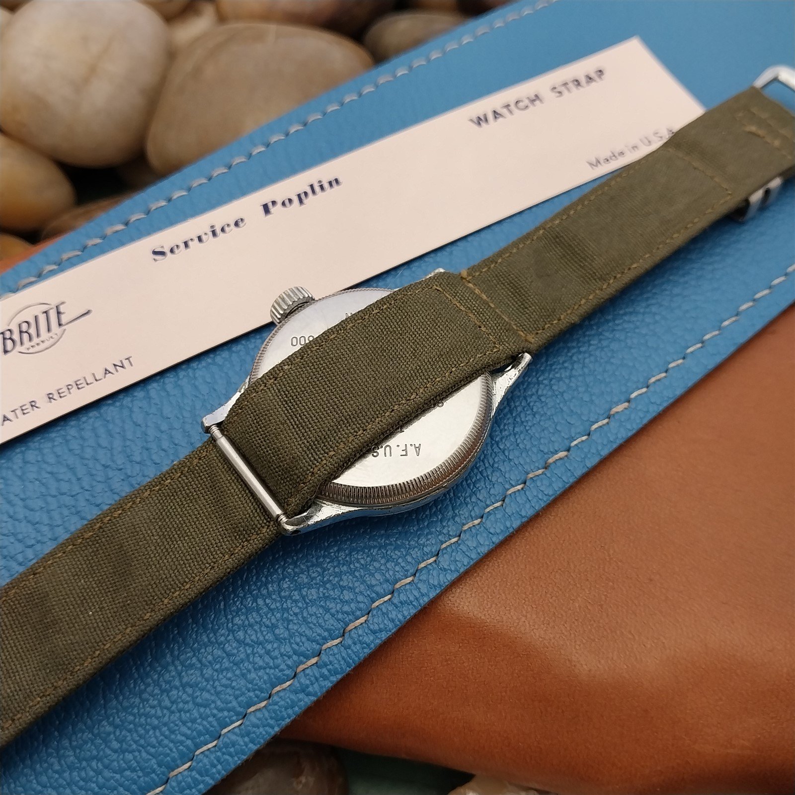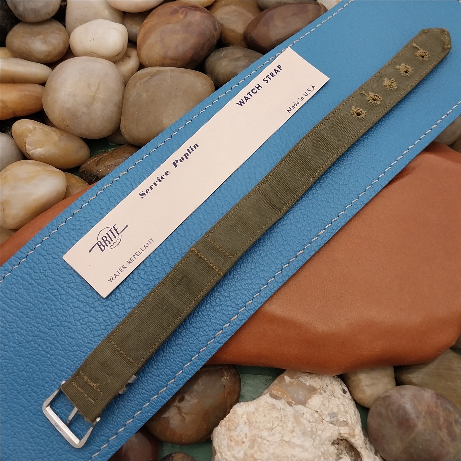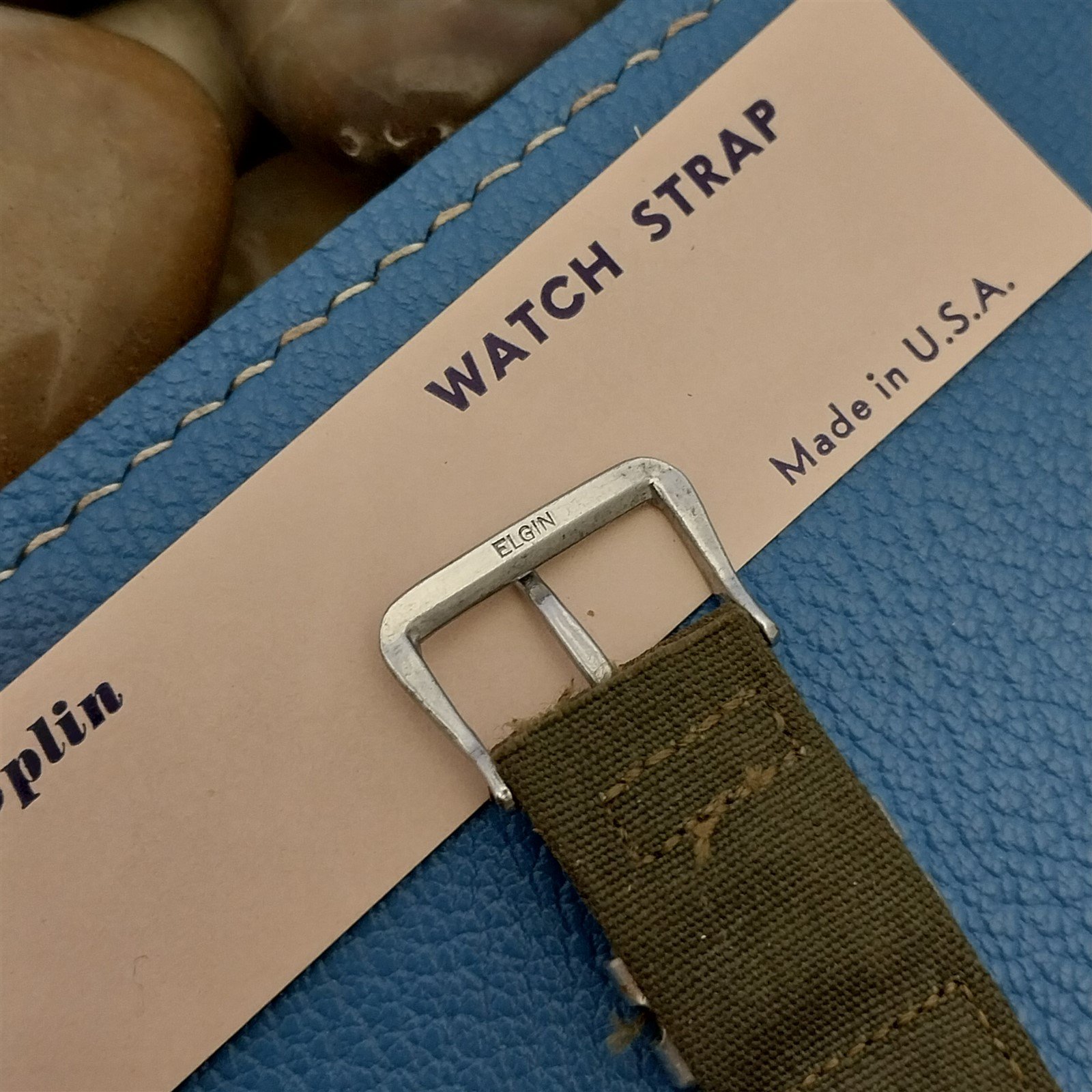 ·NOS 1940s unused old-stock BRITE brand OD green service poplin canvas 1 piece watch strap with Elgin logo buckle.