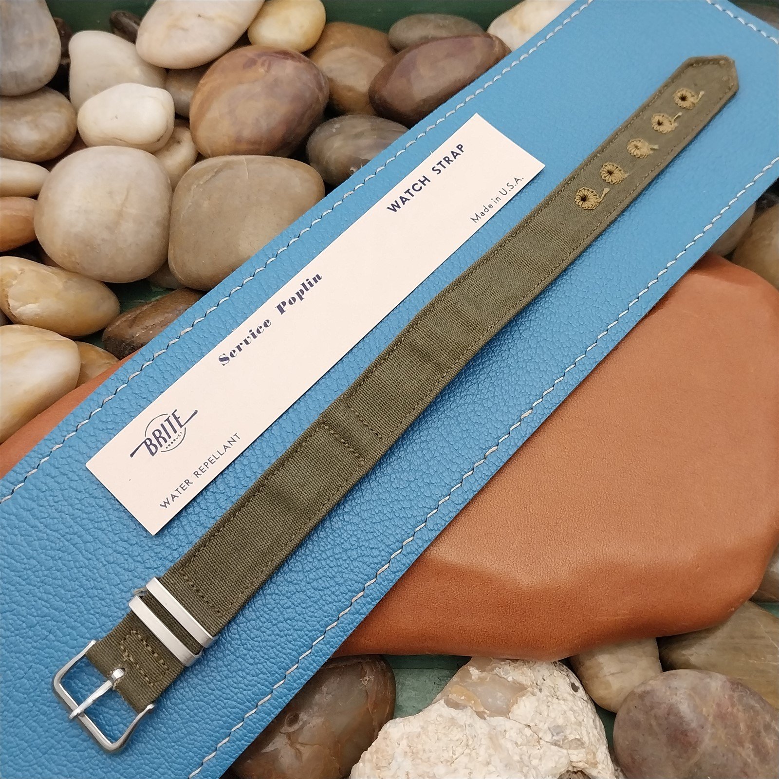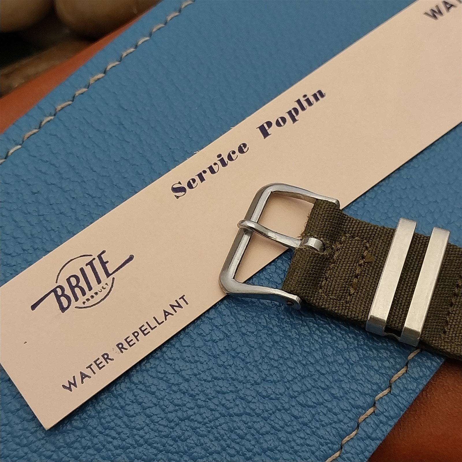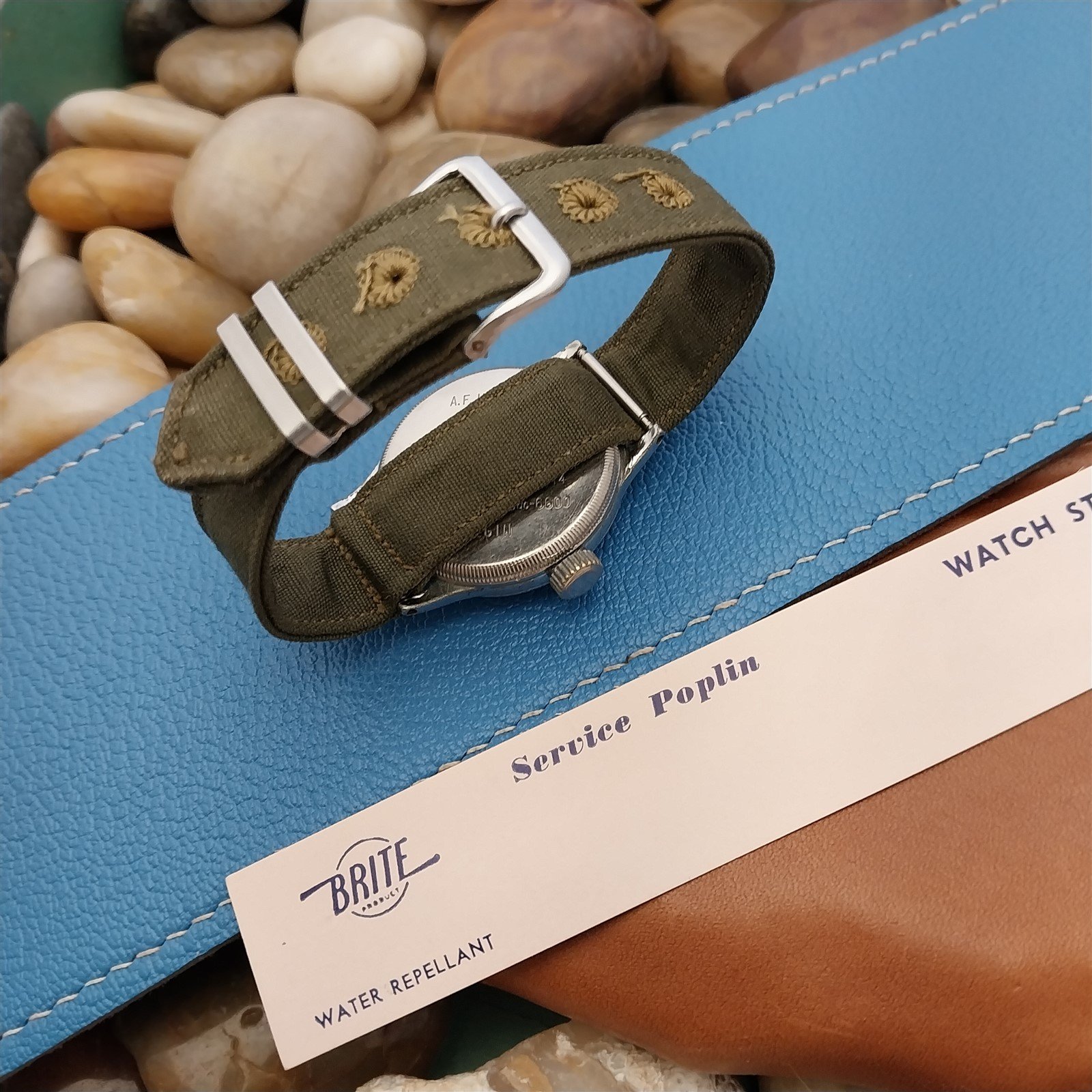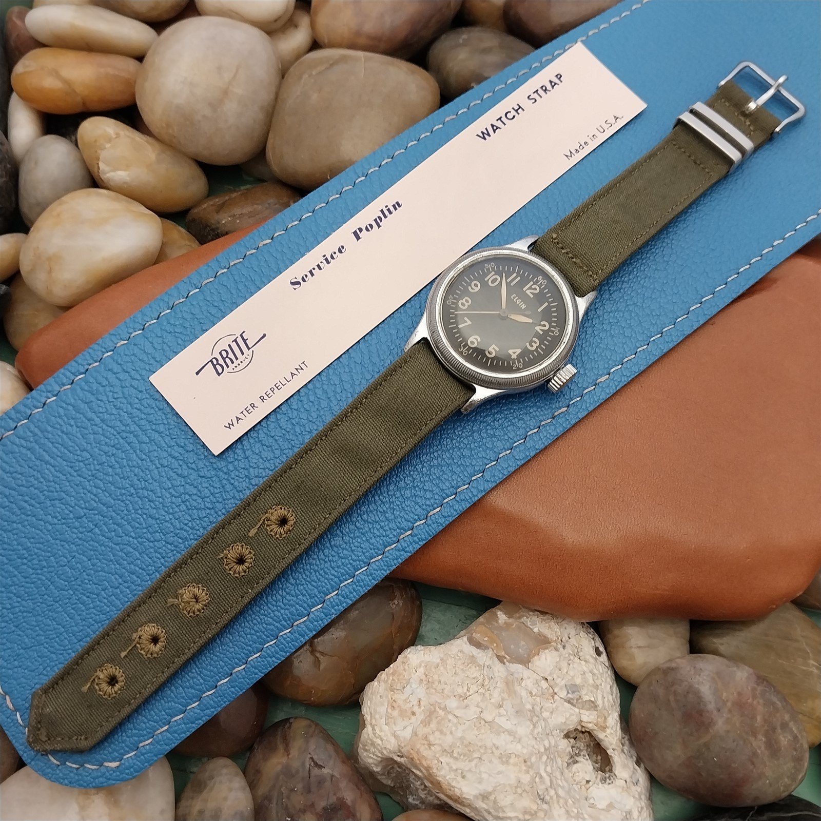 ·NOS 1940s unused old-stock BRITE brand OD green service poplin canvas 1 piece watch strap with Elgin logo buckle.