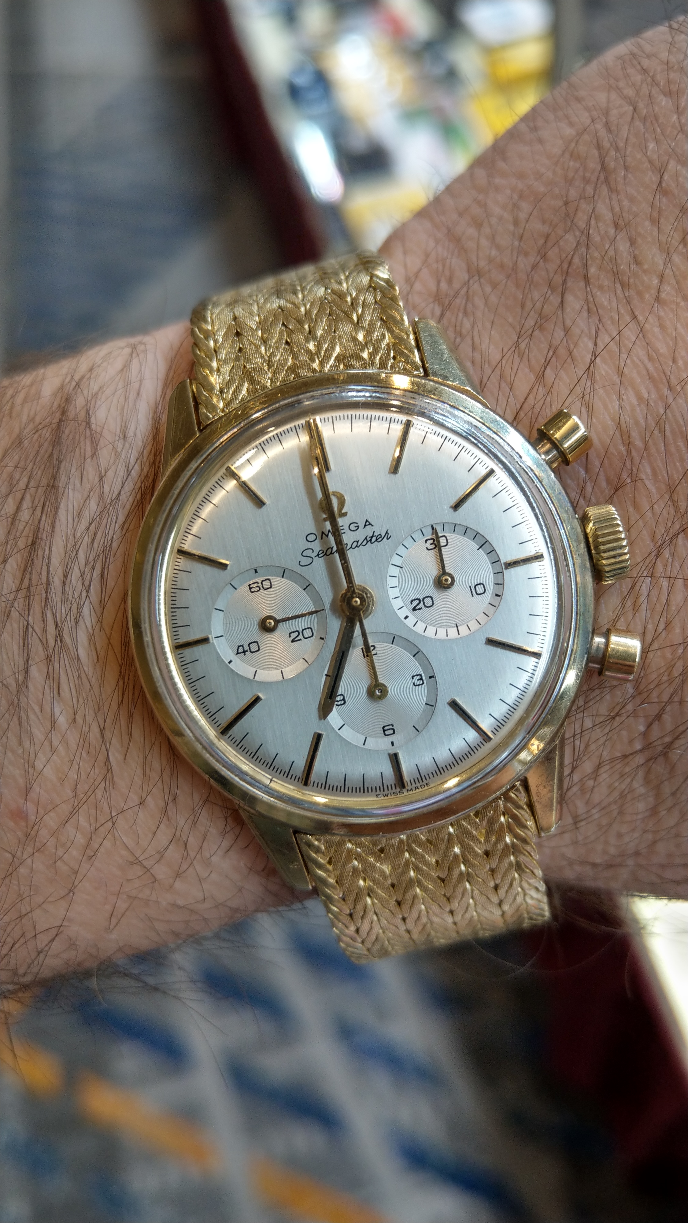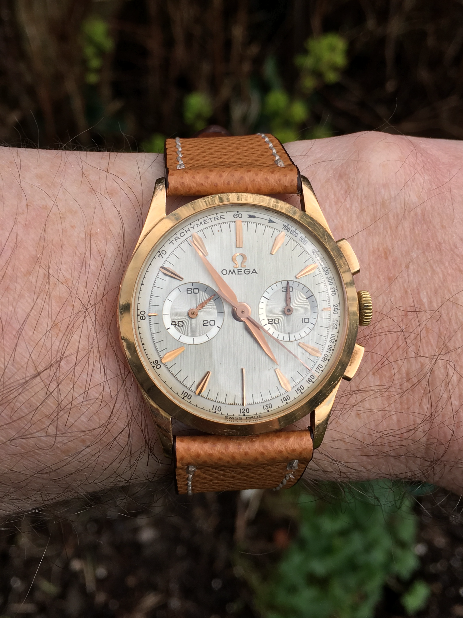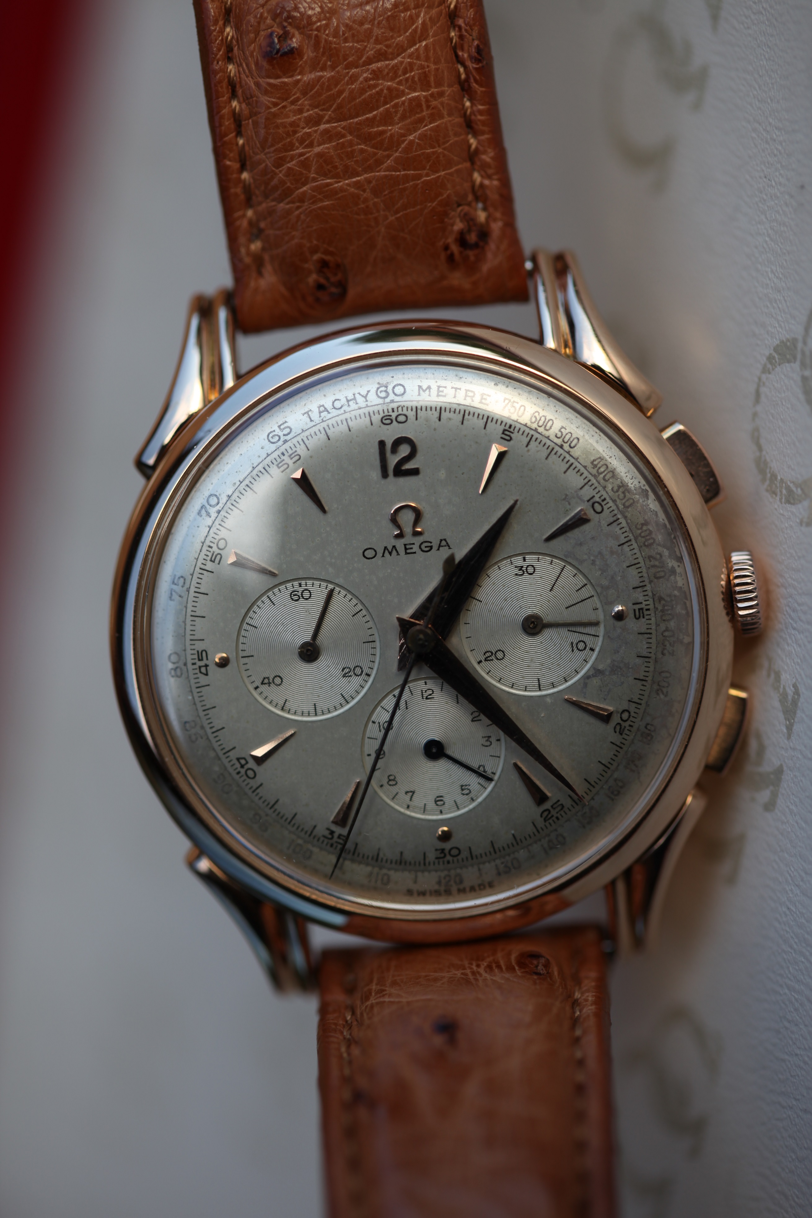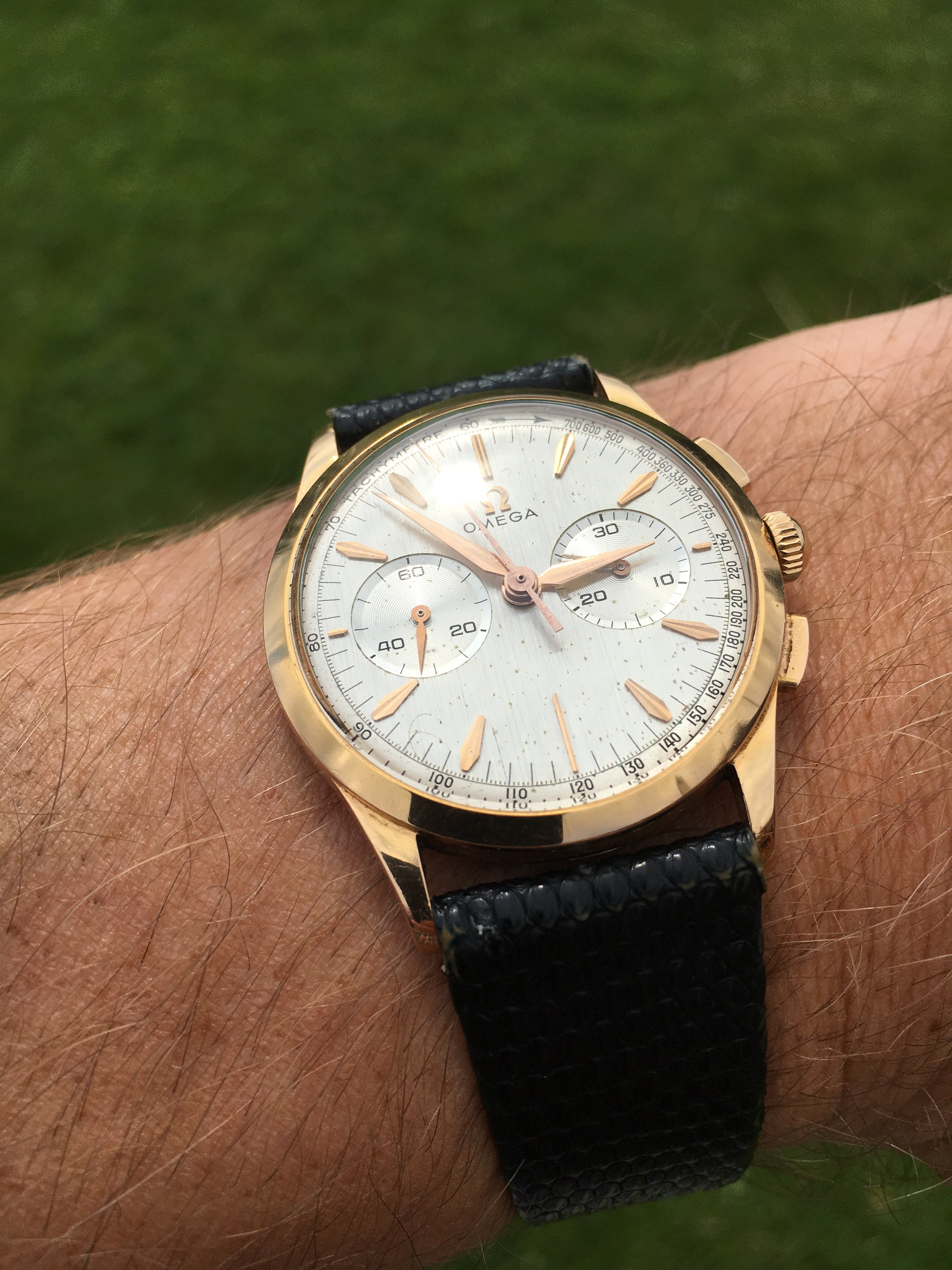 It’s rose gold case. The hands have a bit different color. The dial has some patina or should I say a damage. But, it’s so beautiful!